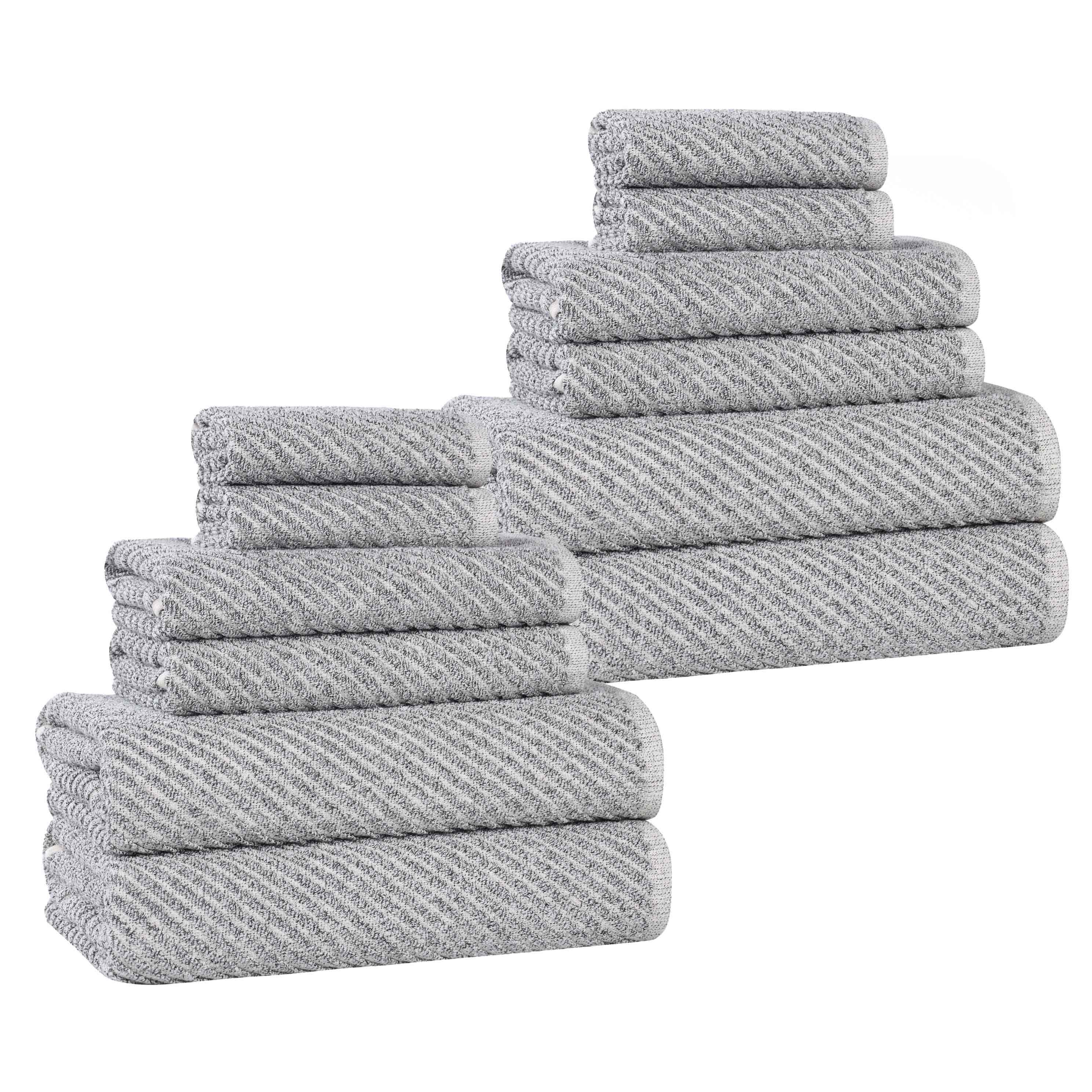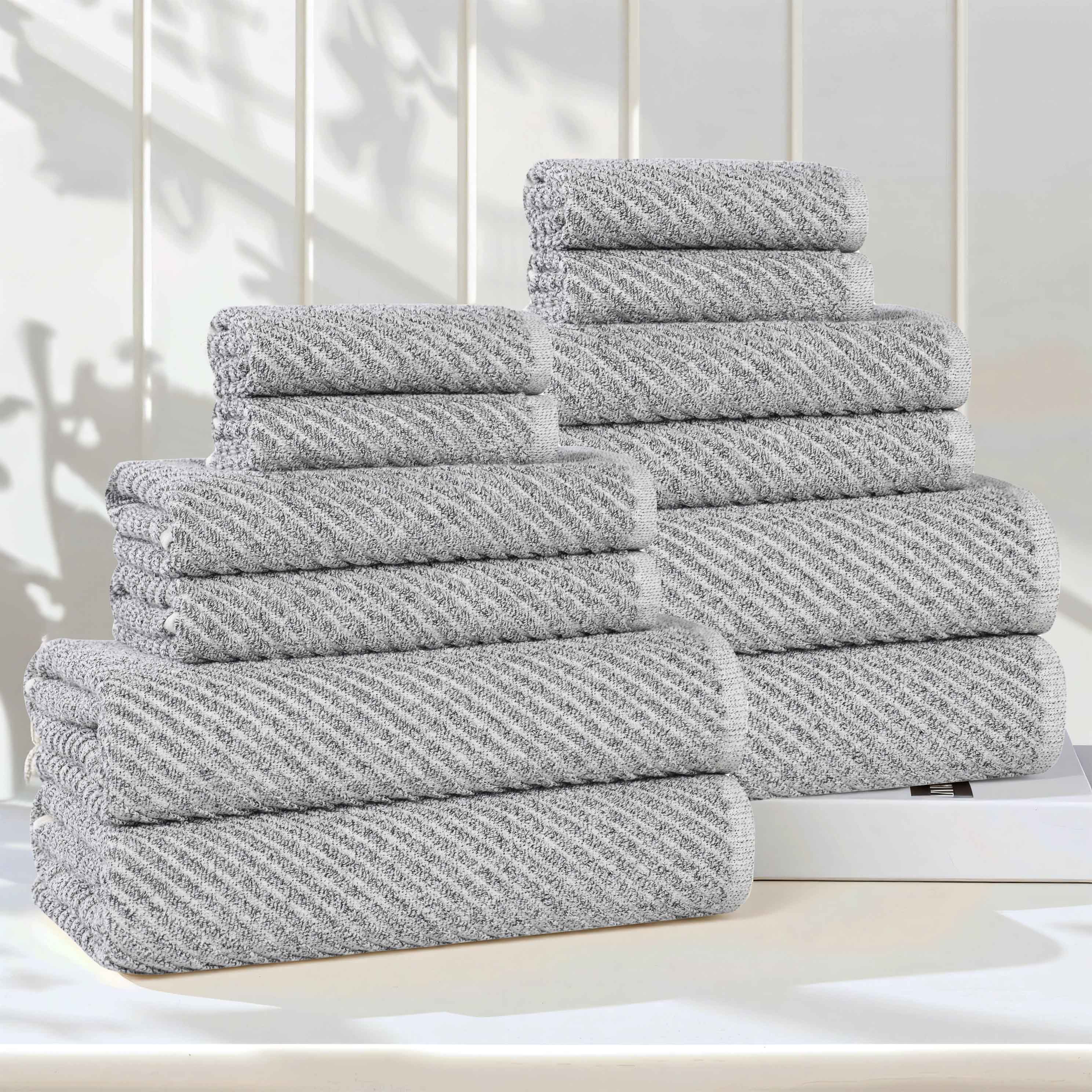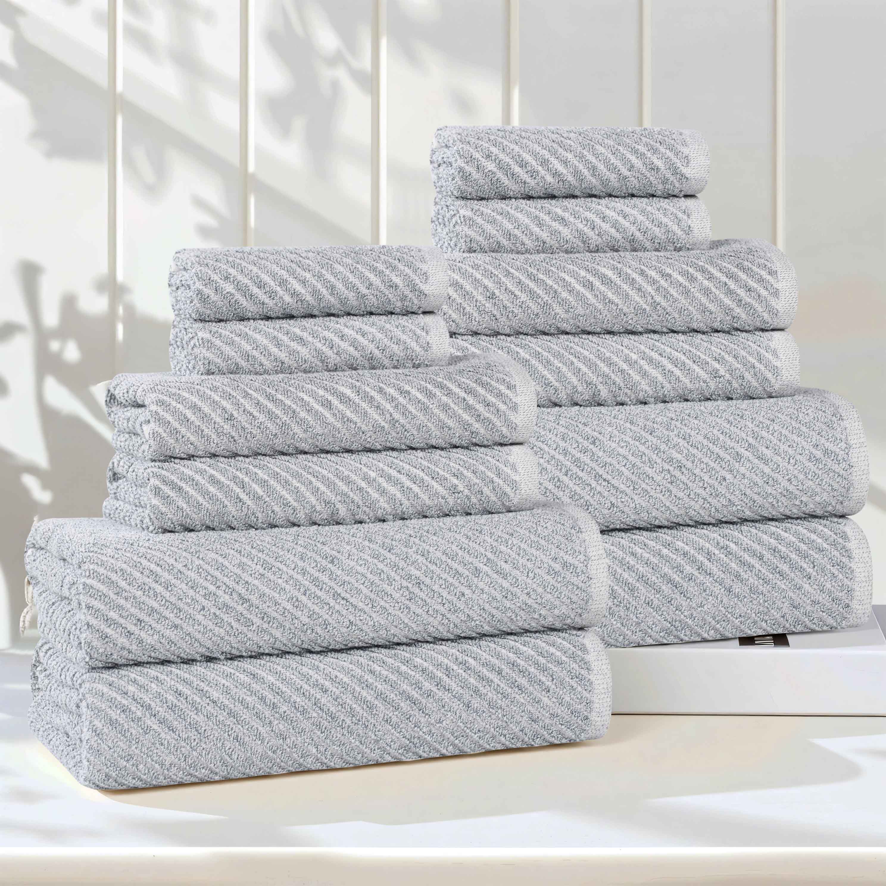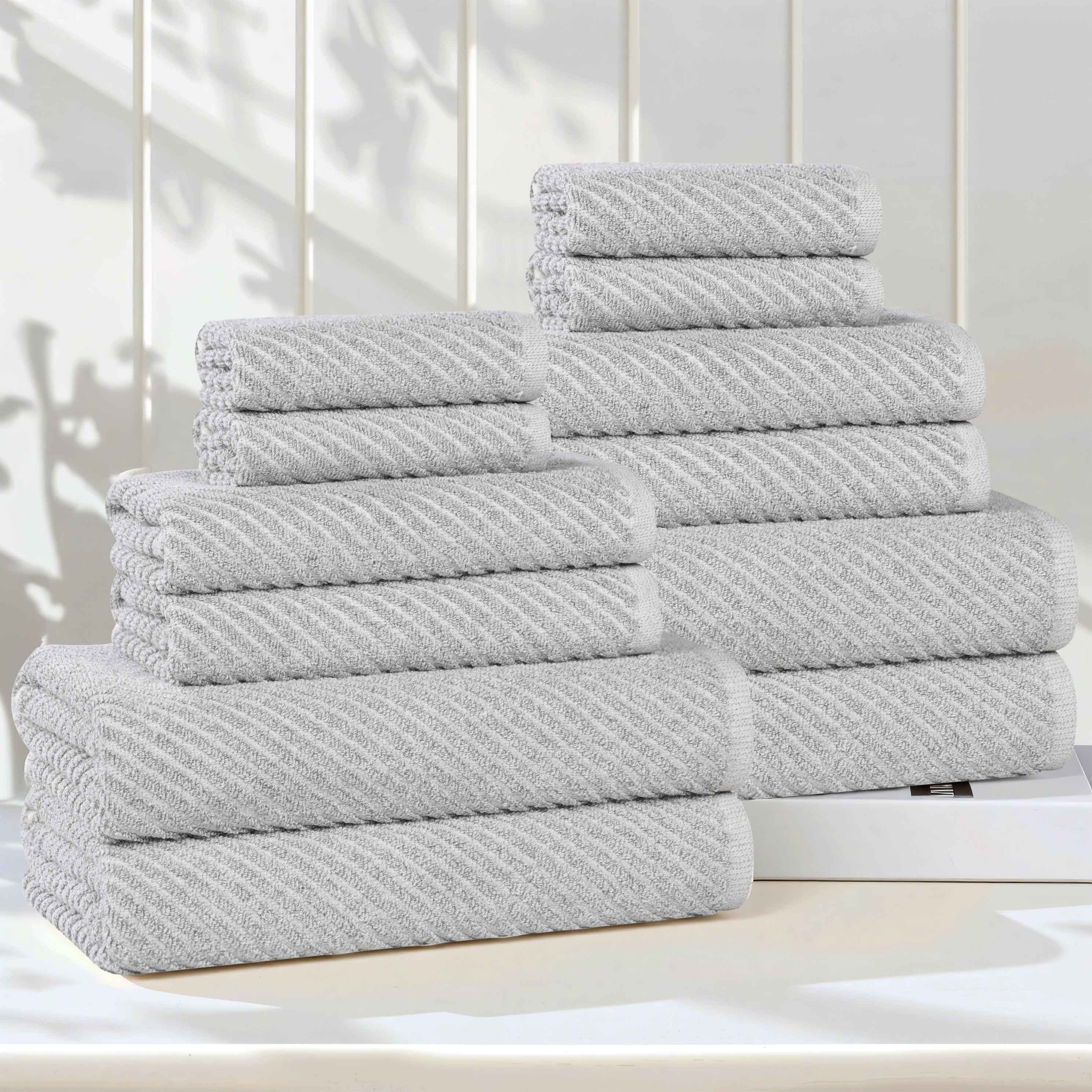 Escape to a haven of tranquility with our luxuriously soft and absorbent Amelia Cotton Blend Textured Diagonal Ribbed 12 Piece Towel Set, designed to provide an unparalleled sensory experience. The delicate textured, diagonal ribbed design creates a timeless aesthetic that complements any decor, adding a touch of understated elegance to your space. Meticulously crafted from a blend of the finest cotton and viscose, these towels are a testament to enduring quality and unparalleled comfort. Embrace the art of self-care and indulge in the simple pleasure of a truly luxurious towel.