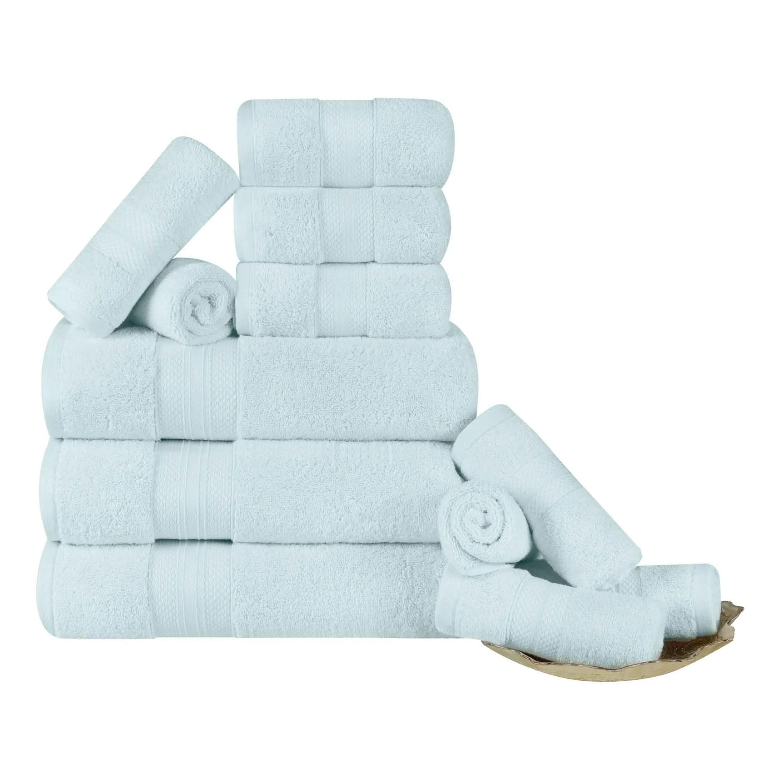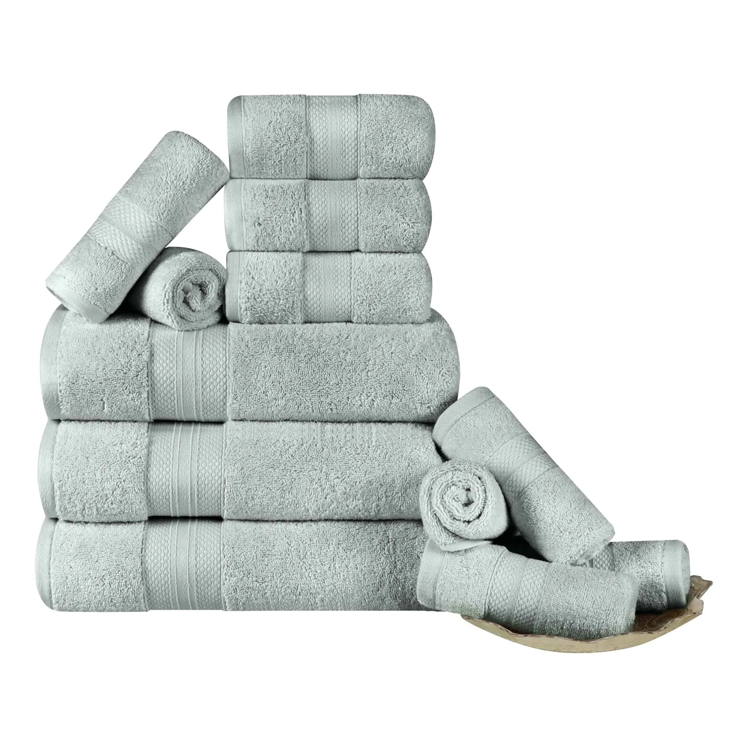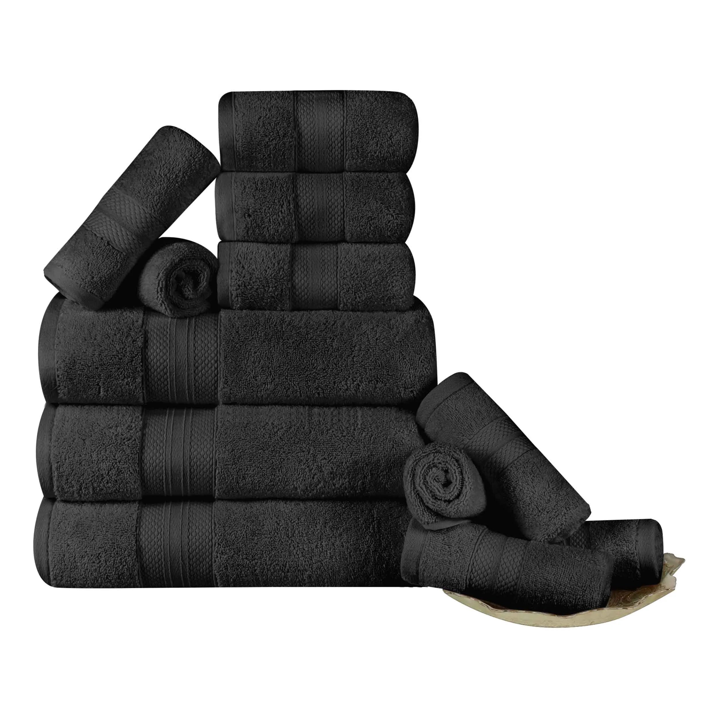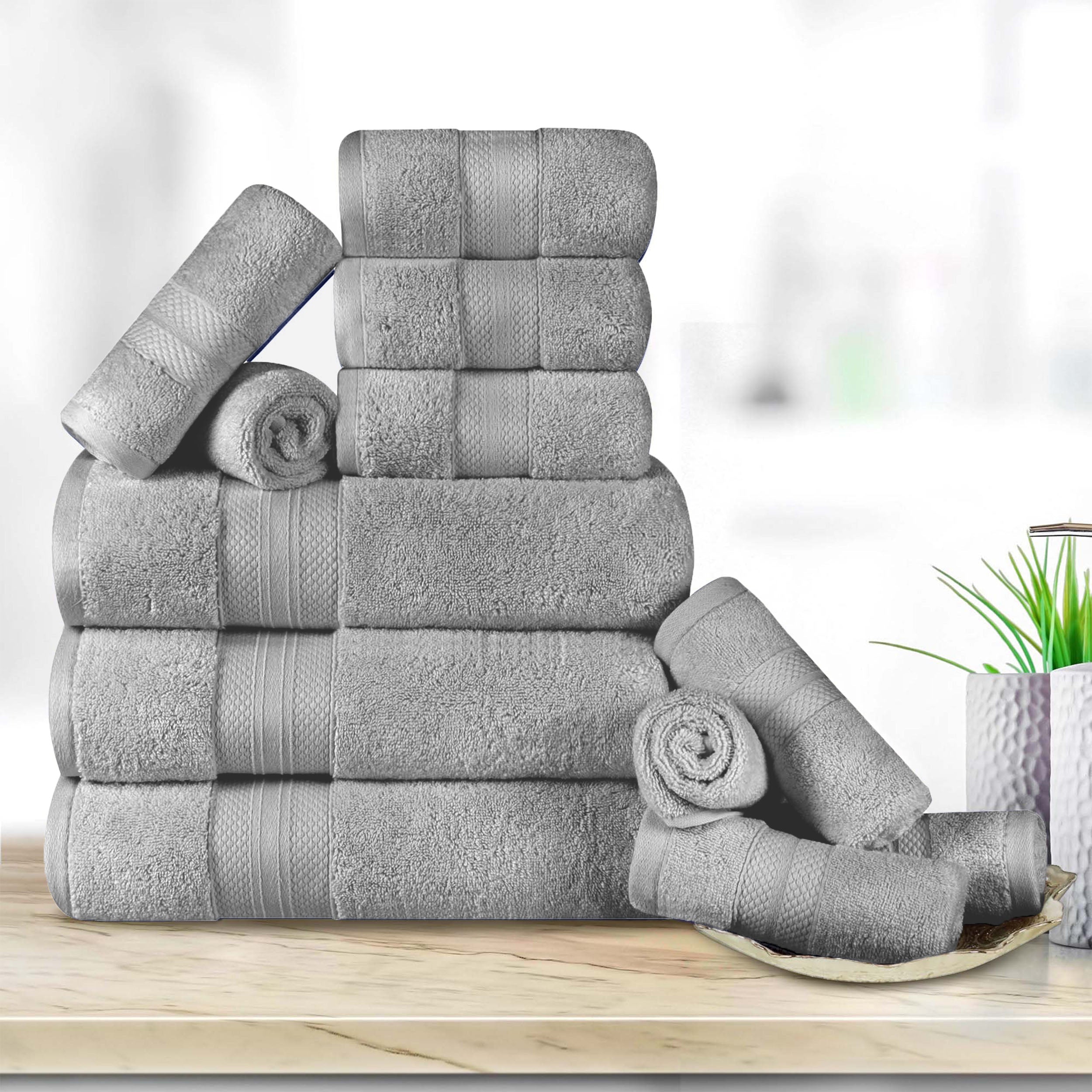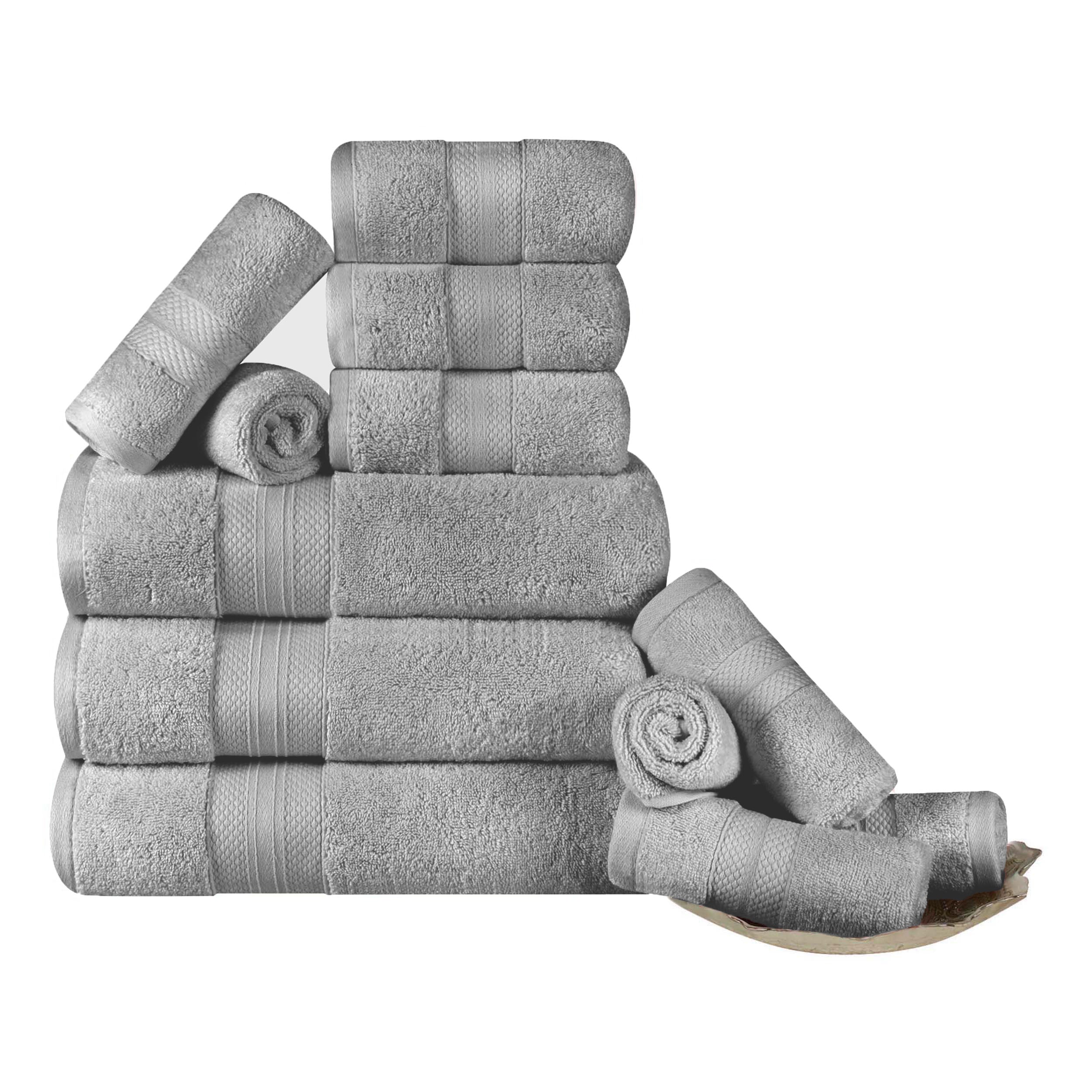 Enjoy comfort after a bath or shower with this gorgeous 12-piece Towel Set. Expertly crafted from premium Turkish Cotton with a single-ply terry loop quality, these towels wick moisture from your skin quickly, getting you warm and dry fast. These towels are lightweight, breathable, plush, and ultra-absorbent. Each bundle includes 3 bath towels, 3 hand towels, and 6 face towels/ washcloths and is designed with a bold diamond border for added elegance and texture. The hems of these towels are firmly turned and stitched for long-lasting durability. Available in your choice of lively solid colors, feel free to mix and match these towels for a fun, festive update in your master or guest bathroom.