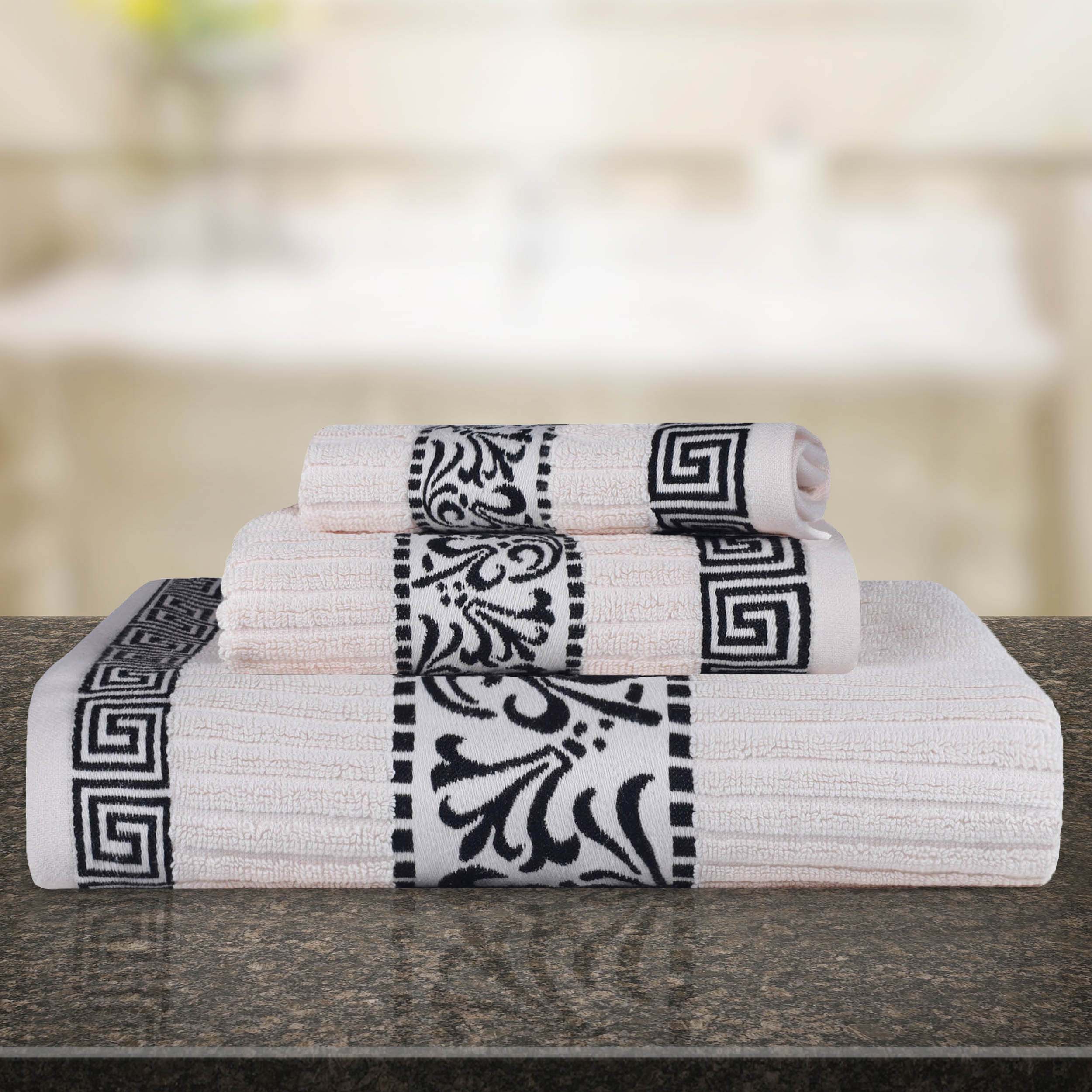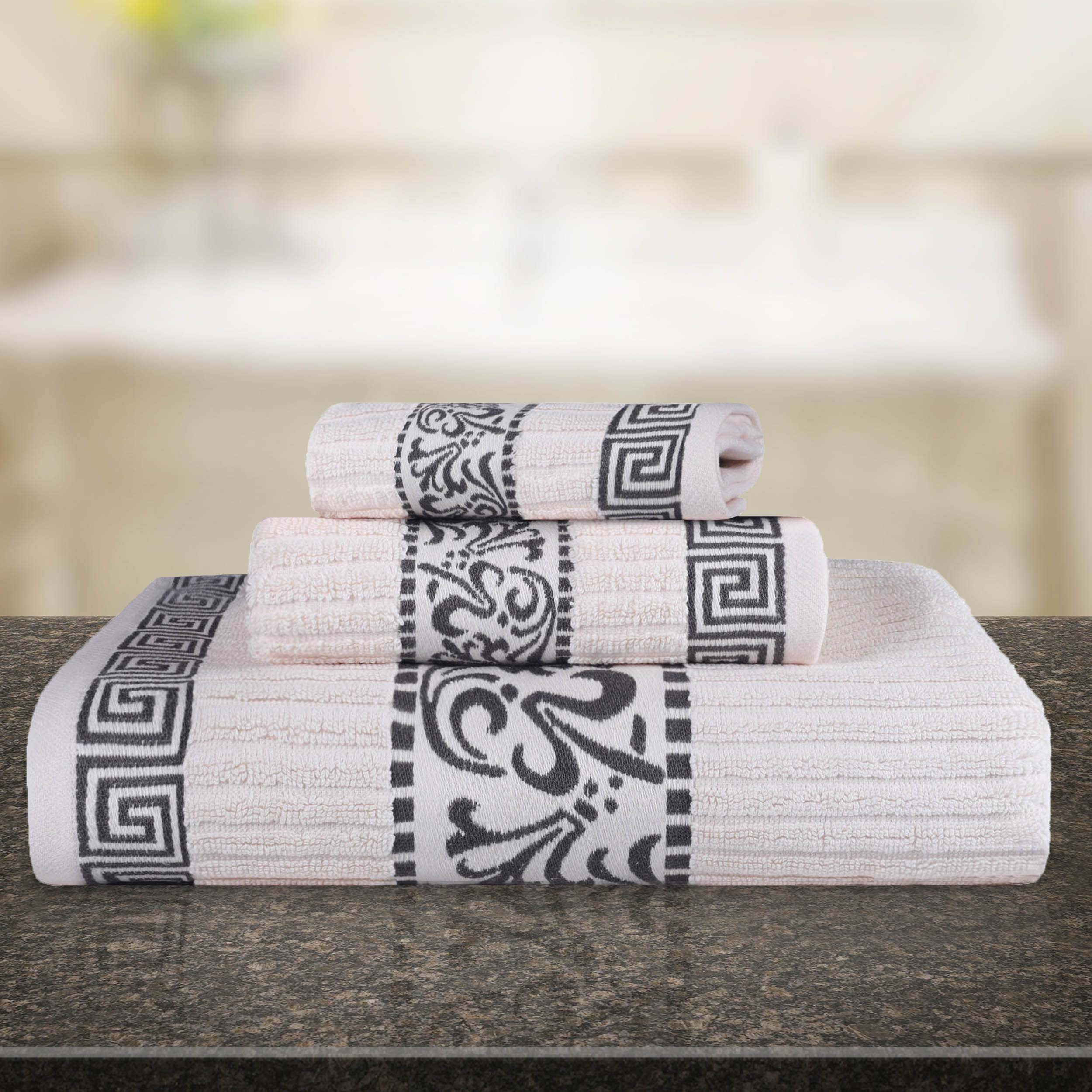 Pamper yourself with our Athens Cotton 3 Piece Assorted Towel Set. These decorative towels feature a Greek key and scroll pattern, perfect for adding a chic touch to your bathroom that will elevate your home. The luxurious bundle comes with one bath towel, one hand towel, and one face towel/ washcloth and pairs perfectly with any traditional, modern or transitional decor styles. Well-made with plush, ring-spun cotton and a loop for easy hanging on each piece, this versatile towel set can withstand many washes while being incredibly soft on your skin.