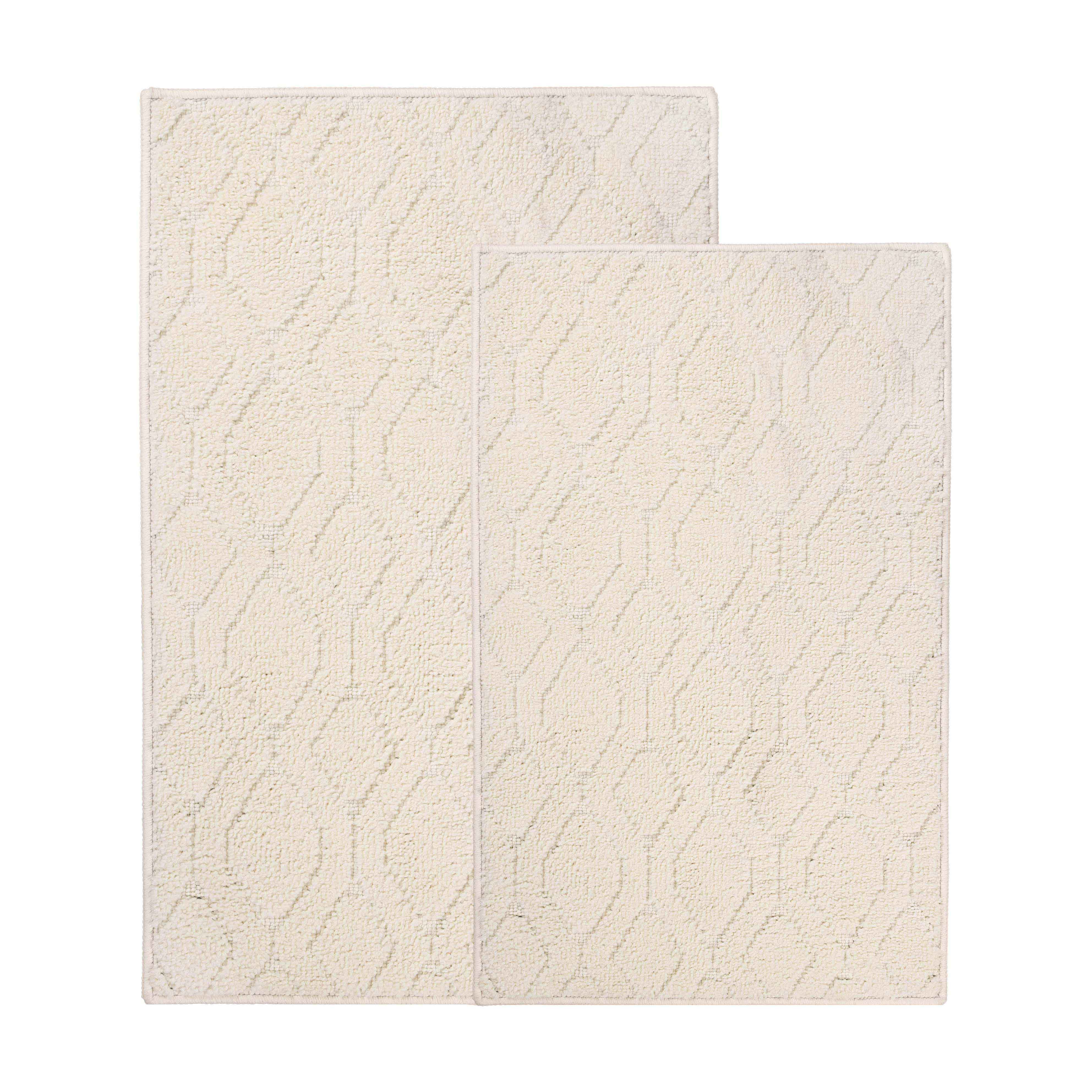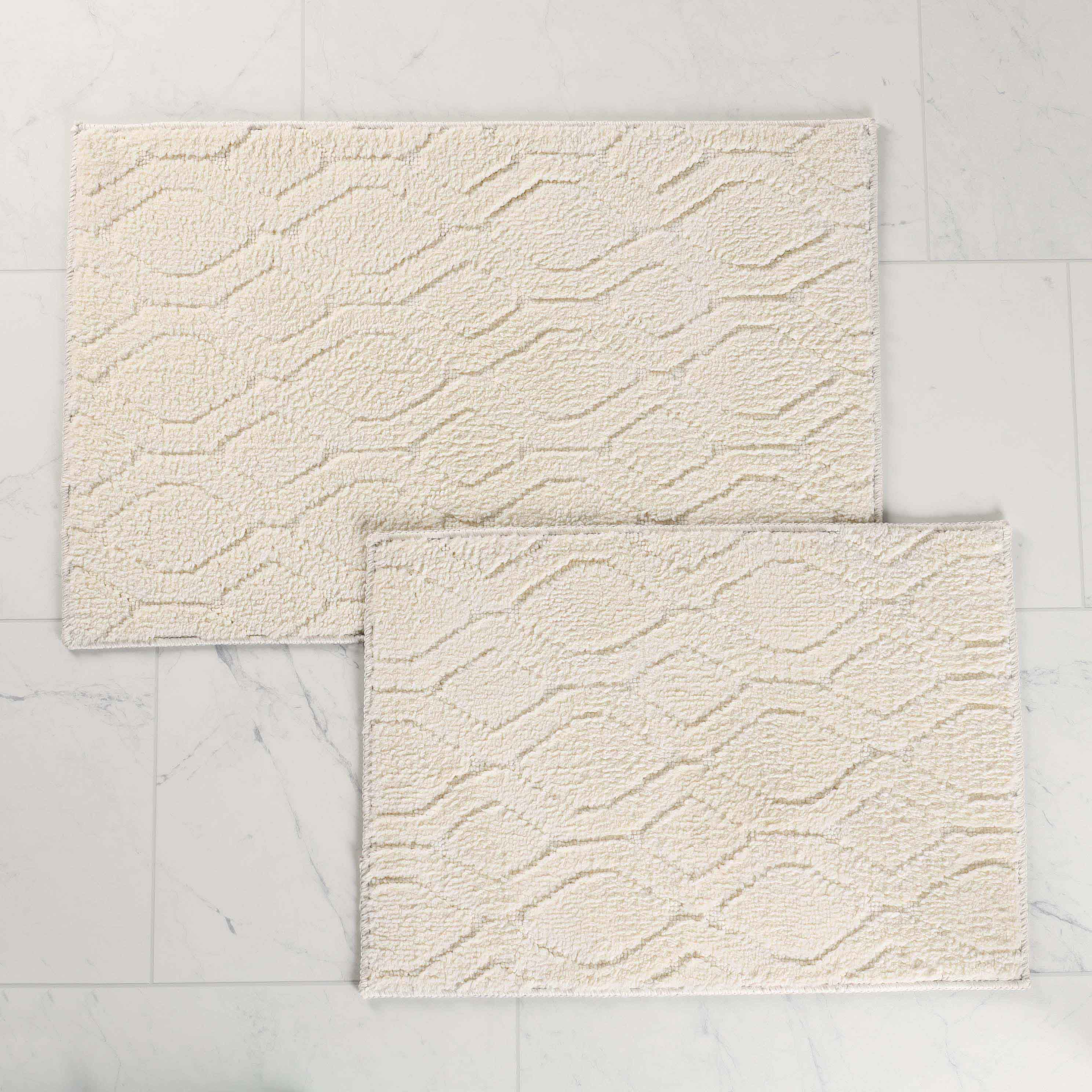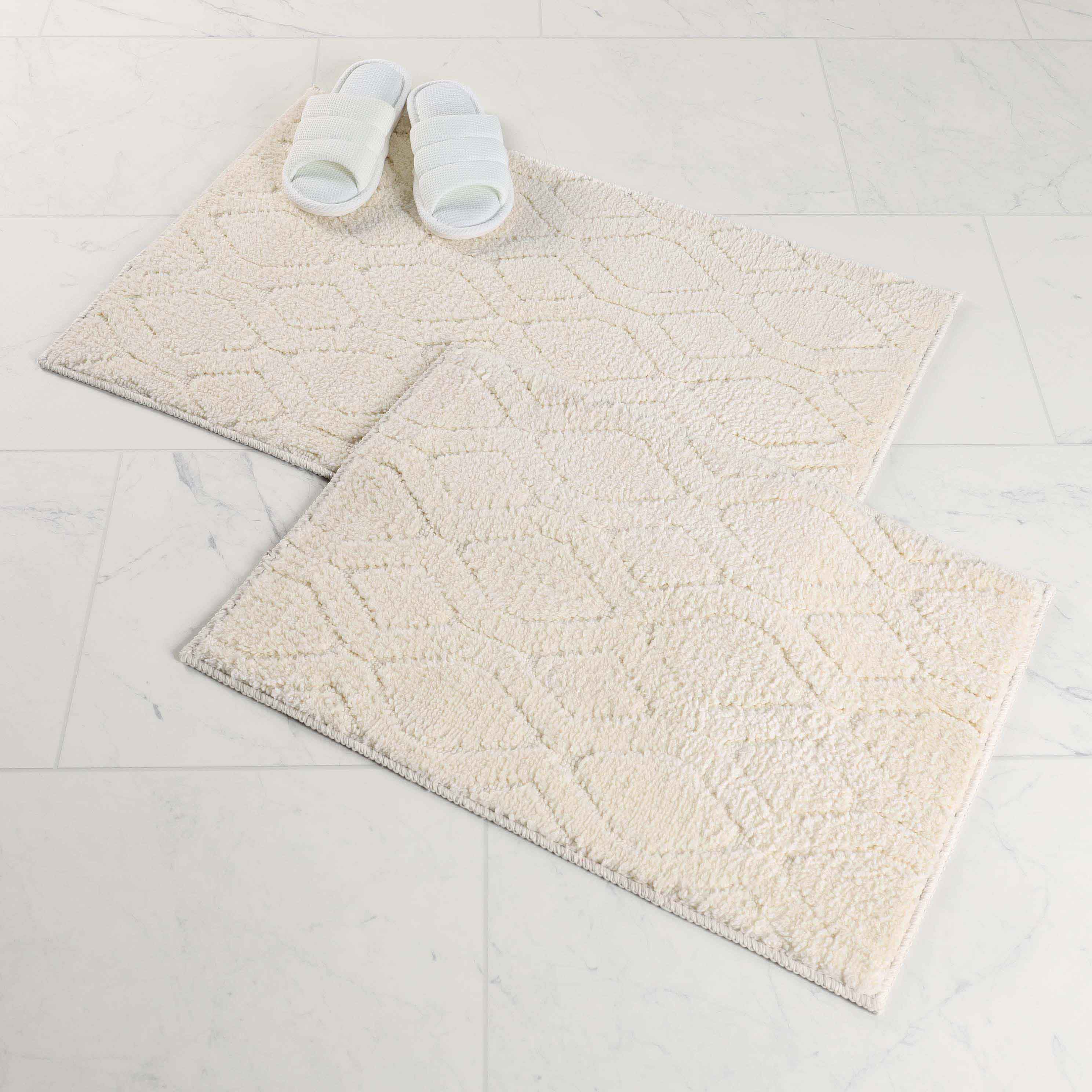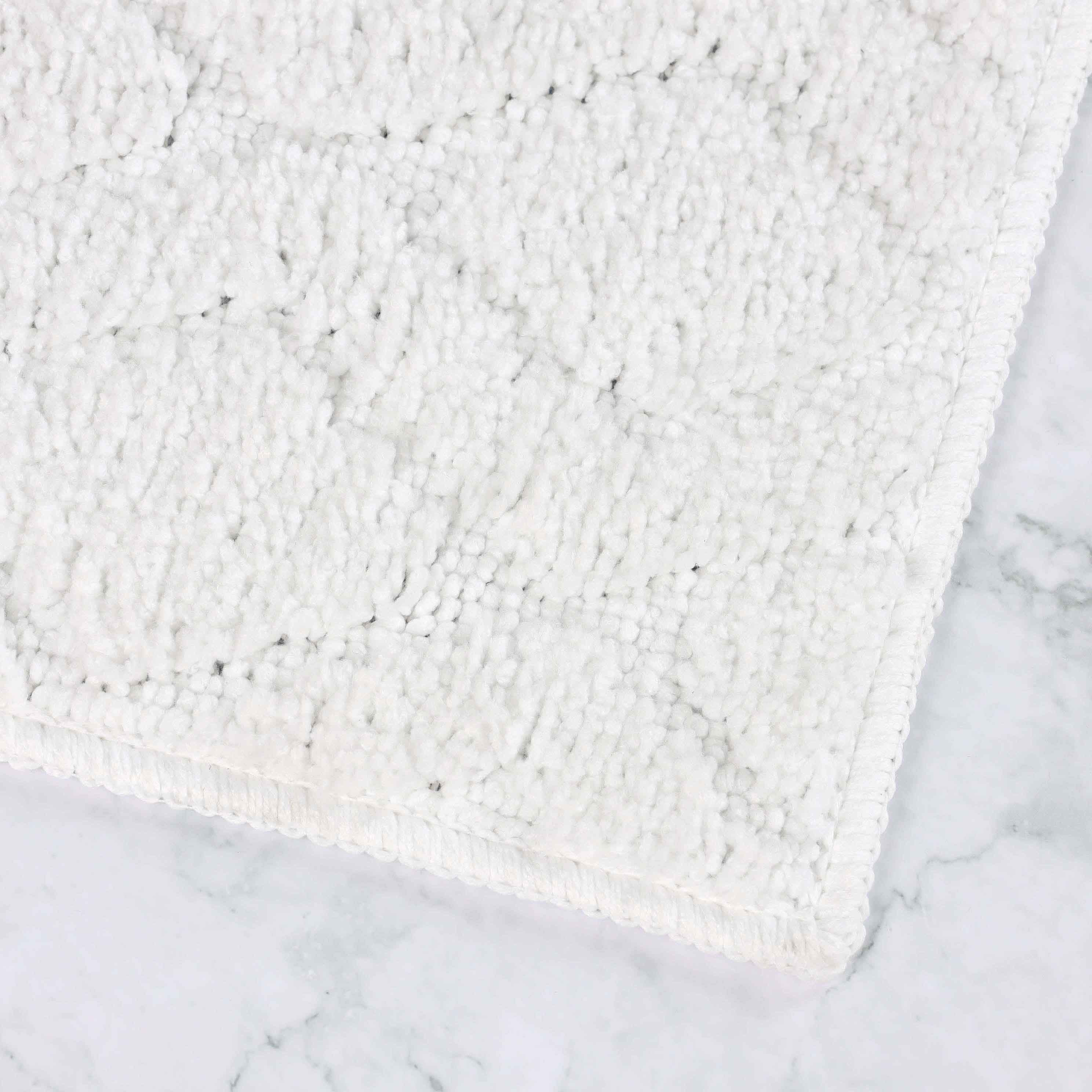 Infuse your bathroom with modern elegance with our Brou Diamond Lattice Bath Rug Set. This set of two rugs boasts a chic geometric pattern and a luxurious high-low pile that adds depth and texture to your space. Available in a range of sophisticated colors – White, Ivory, Beige, and Black – these rugs effortlessly complement any decor. Crafted from 100% polyester, they are exceptionally soft and durable, while the machine-washable design ensures easy care. With a non-slip backing for added safety and convenient size options for your bathroom or kitchen, these rugs are the perfect blend of style and functionality.