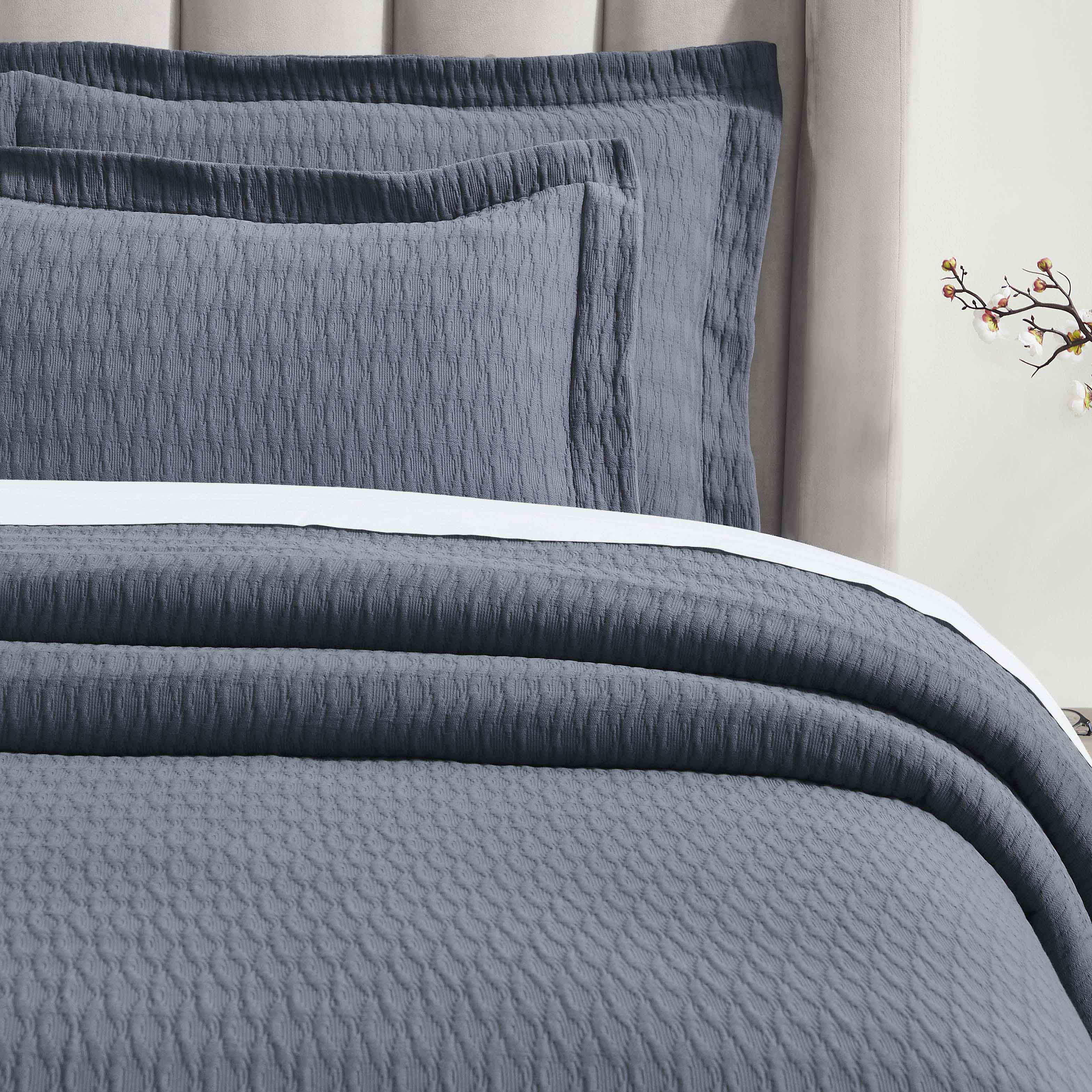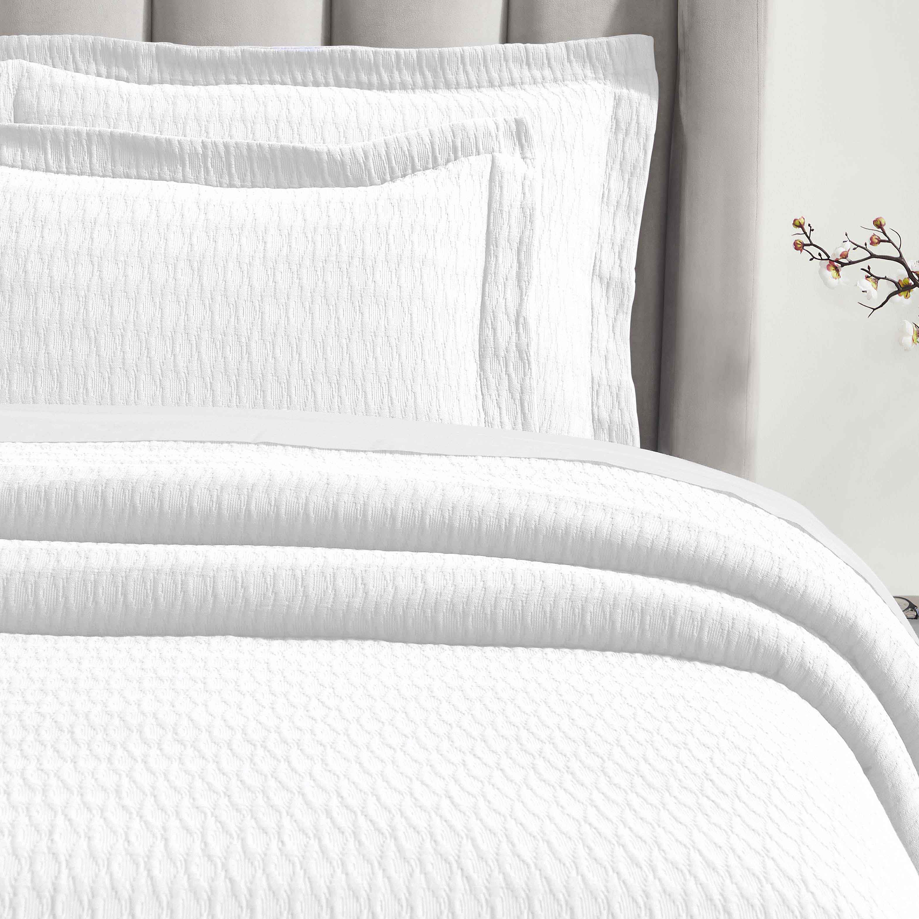 Add subtle elegance and charm to your bedroom with the Calvert Diamond Matelassé Weave Jacquard Cotton Bedspread Set. This stunning bedroom bedspreads option is woven from 100% premium cotton, featuring a classic diamond lattice pattern that creates a soft, sculpted texture. The generously sized spread provides a full drape that reaches the floor, giving your bed a complete, tailored look and eliminating the need for a bed skirt.
