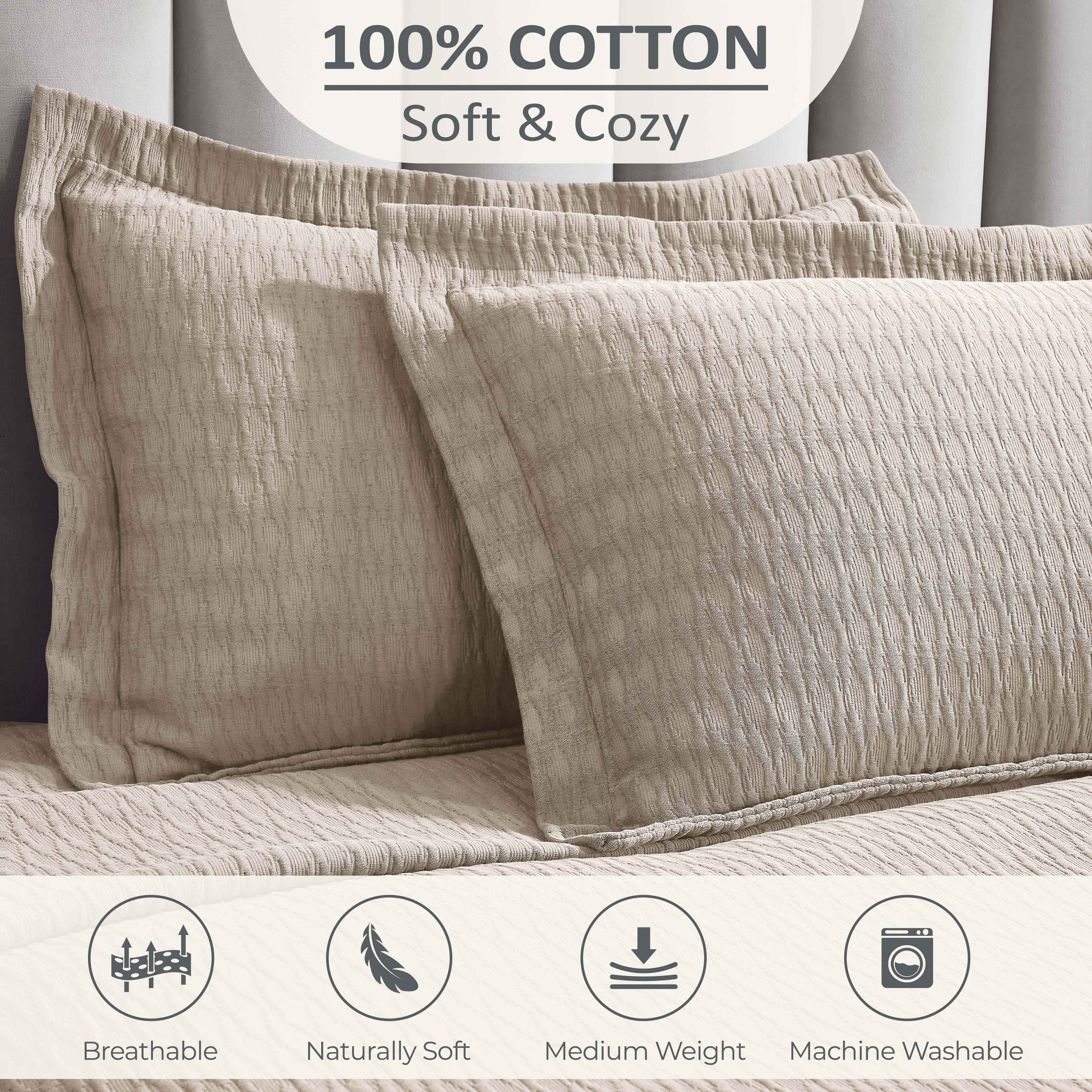 Add subtle elegance and charm to your bedroom with the Calvert Diamond Matelassé Weave Jacquard Cotton Bedspread Set. This stunning bedroom bedspreads option is woven from 100% premium cotton, featuring a classic diamond lattice pattern that creates a soft, sculpted texture. The generously sized spread provides a full drape that reaches the floor, giving your bed a complete, tailored look and eliminating the need for a bed skirt.