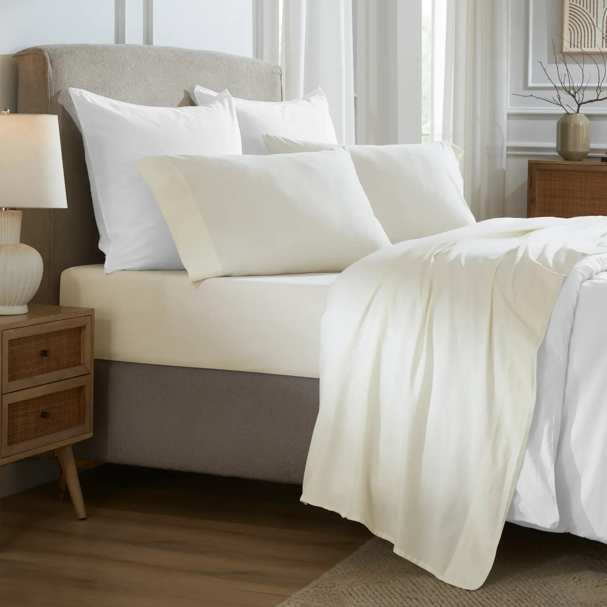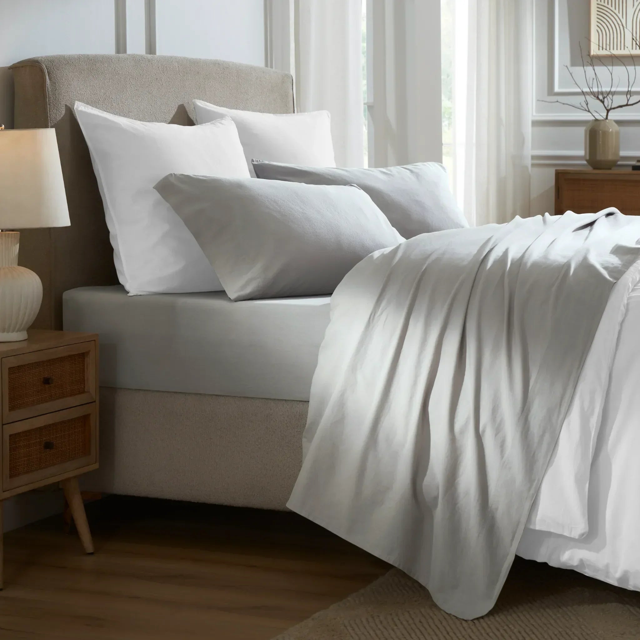 Transform your sleep with the cool, laid-back elegance of the Carmen Sheet Set. Crafted from airy cotton percale and garment-washed for a relaxed, lived-in feel, this set brings the timeless appeal of linen with none of the stiffness. Its deep pockets offer a secure fit, while tailored double-needle hems provide a crisp, polished look.