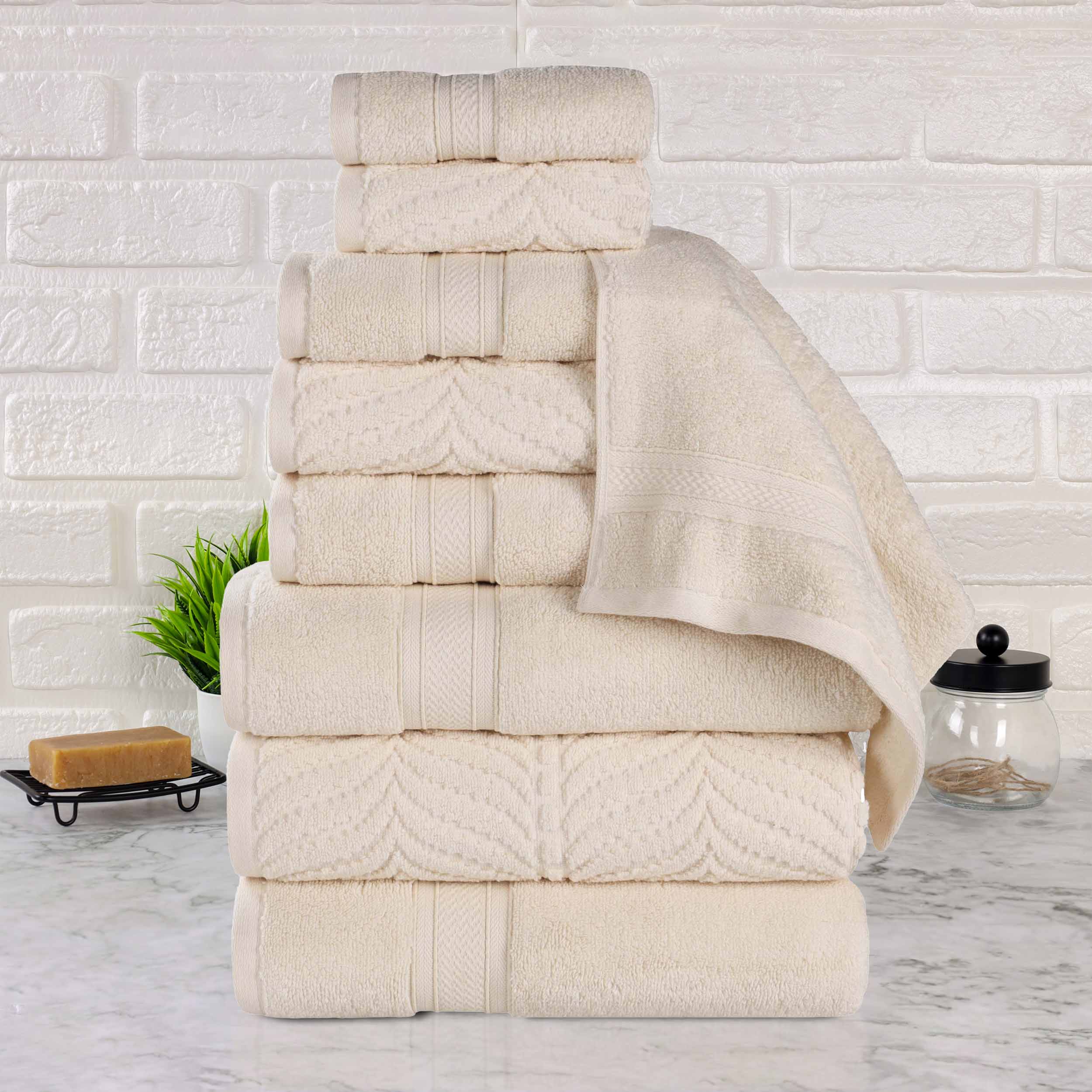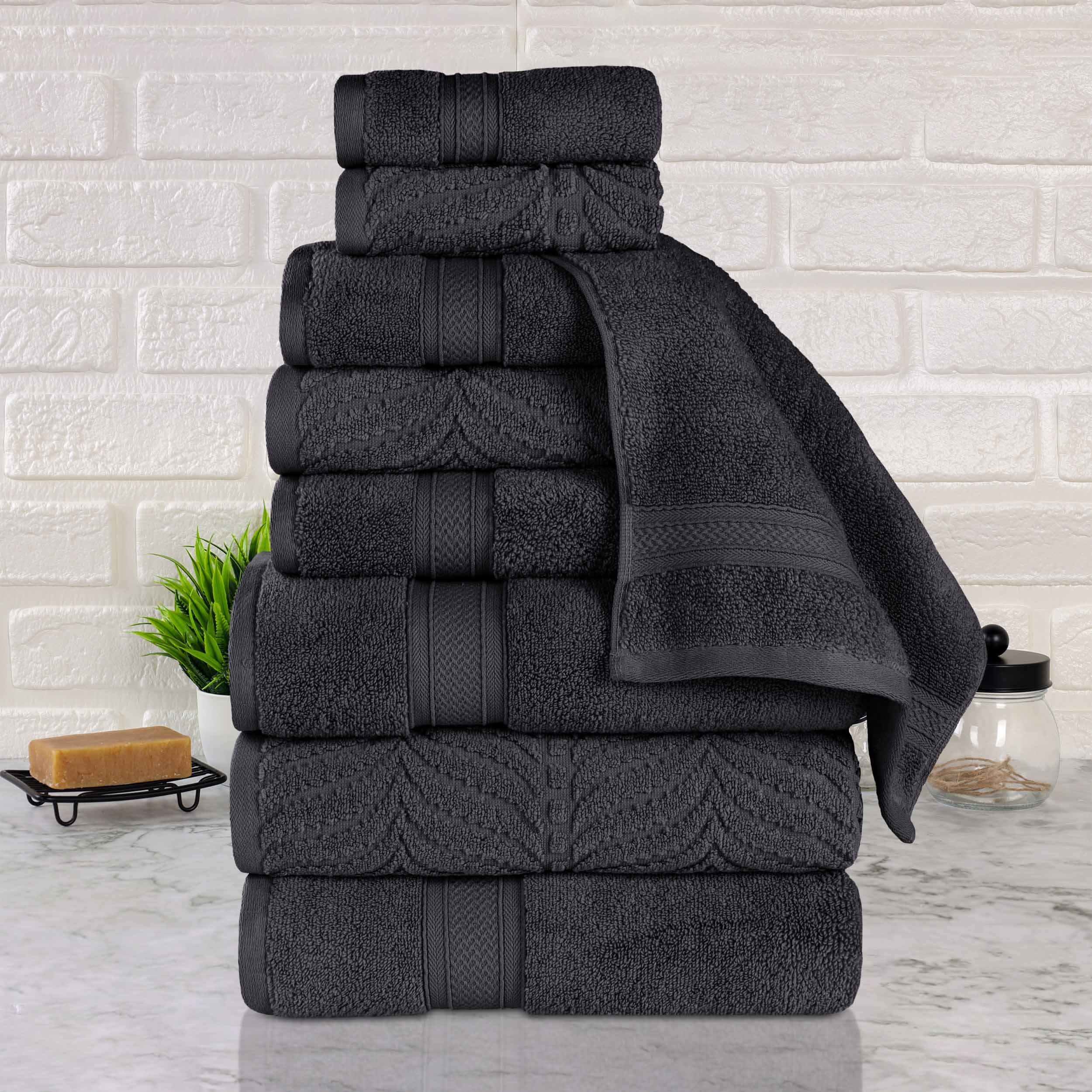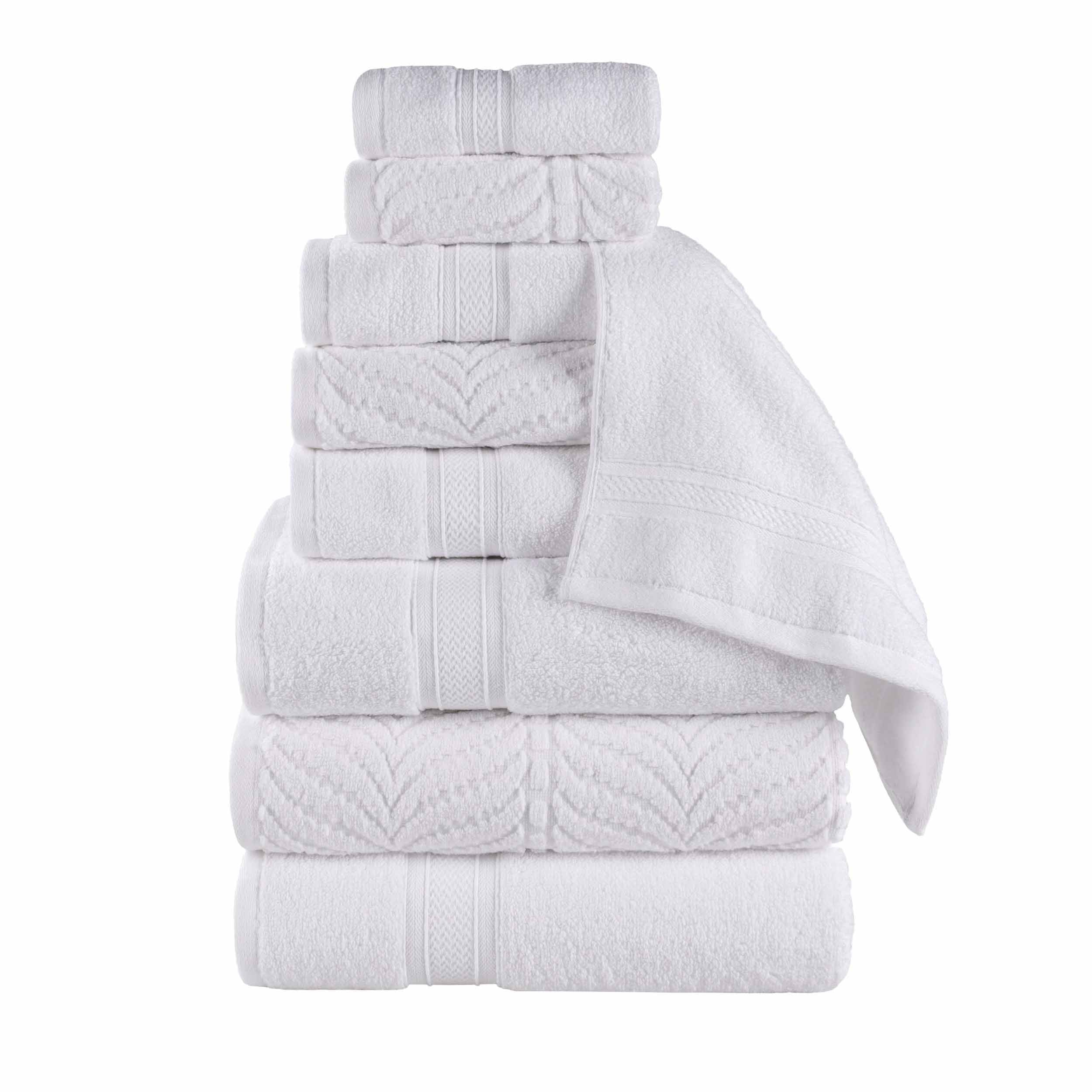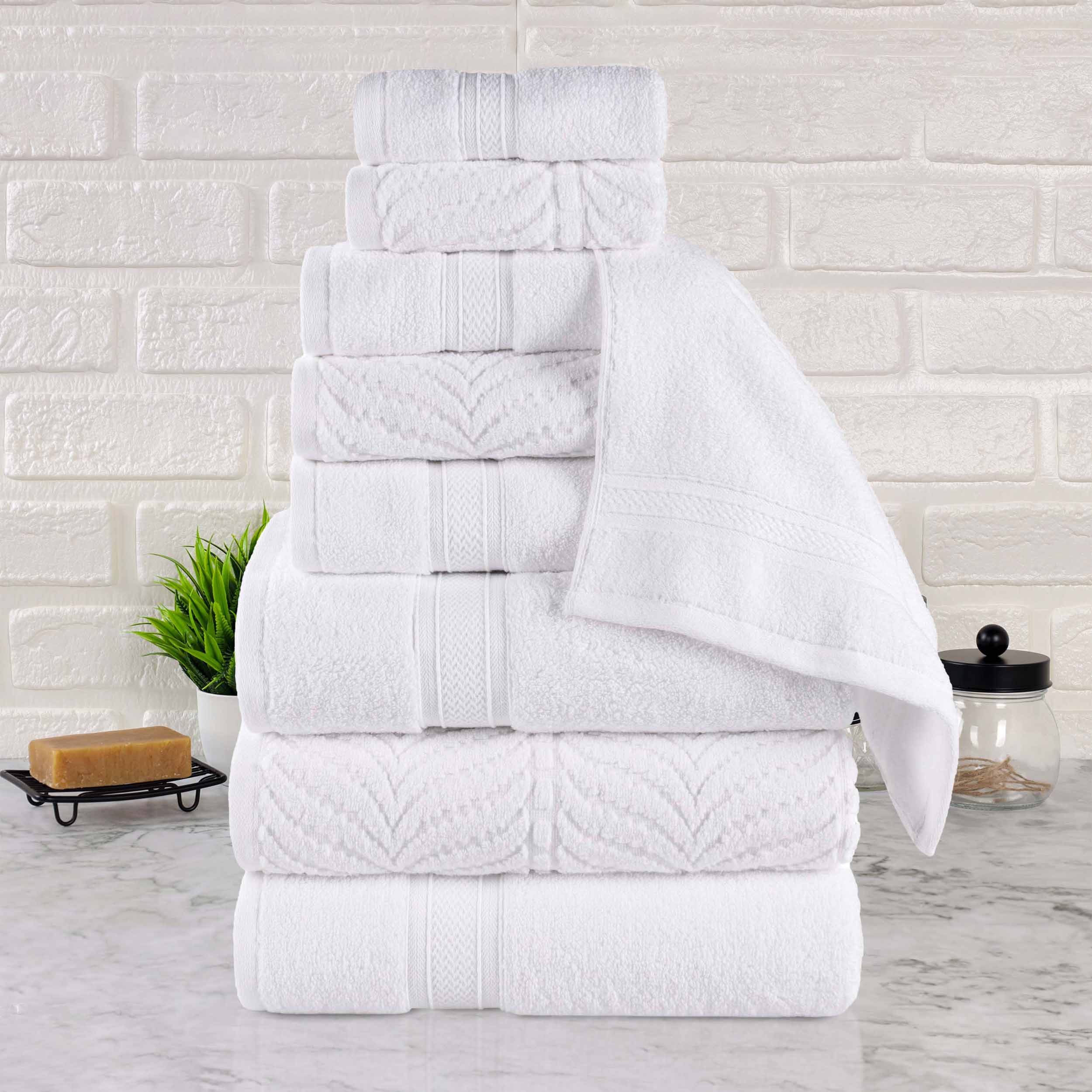 Enjoy a spa-like retreat with our Chevron Solid and Jacquard 9 Piece Towel Set. Our fluffy cotton towels have a luxuriously soft feel and the zero twist weave is plush, and highly-absorbent to get you dry quickly. The medium weight thickness of each towel is versatile and perfect for the bath, poolside, or at the beach. Boasting both solid and jacquard, chevron designs, bring unique style to your guest or master bathroom with this bundle. Each towel is finished with secure hemmed edges to avoid fraying and a durable single-ply to withstand countless washes and last you years to come. Featuring a hanging loop on each piece, enjoy both convenience and comfort with this versatile set.