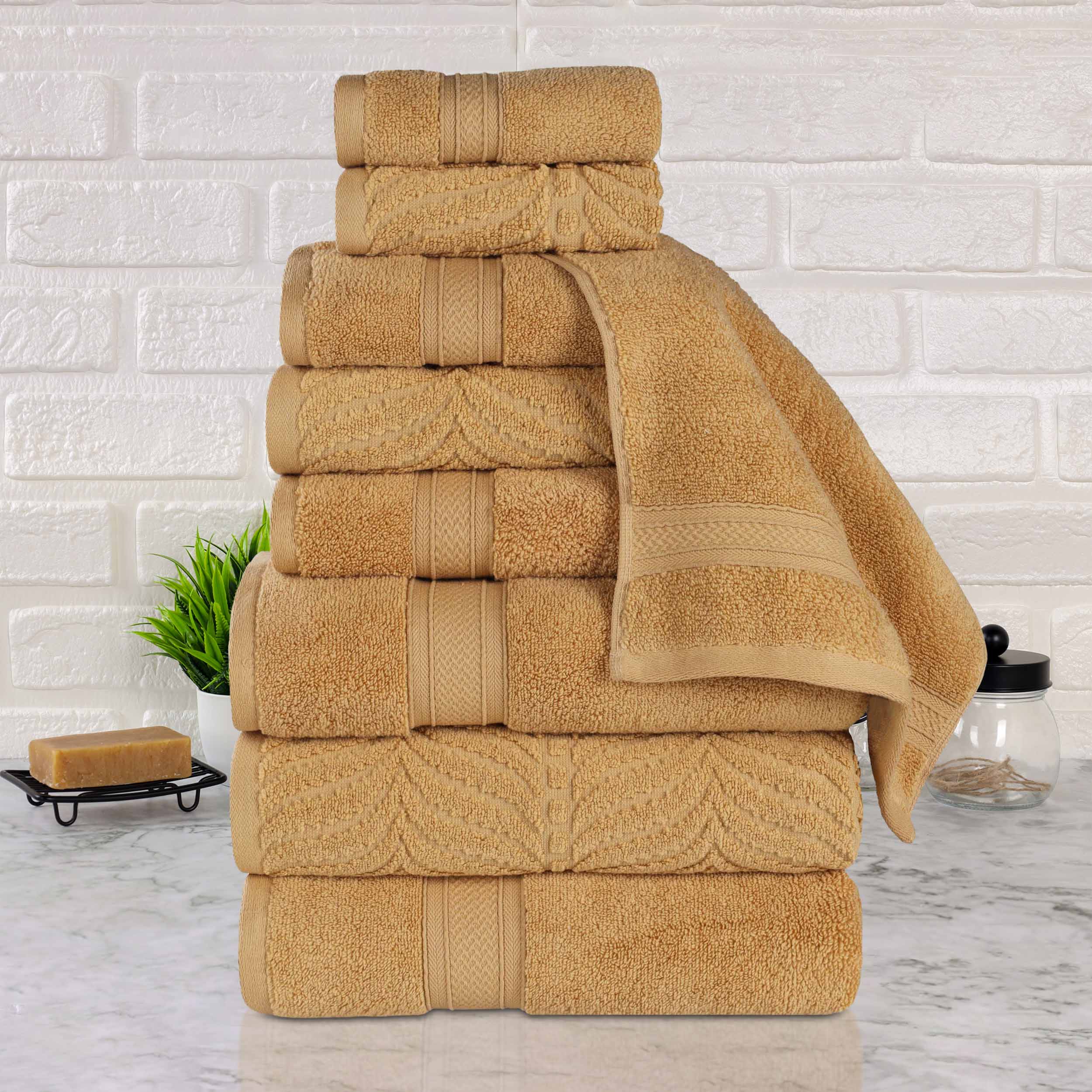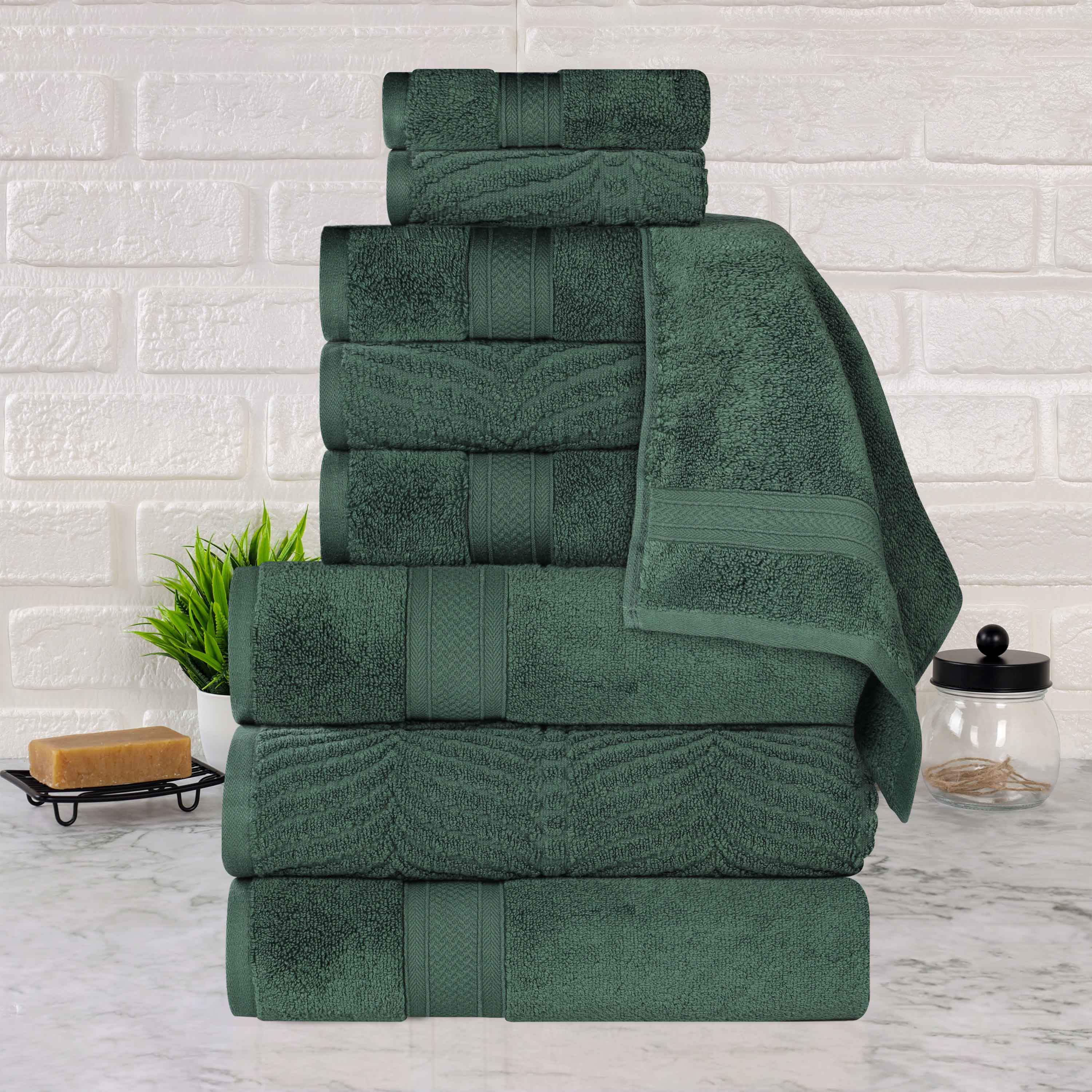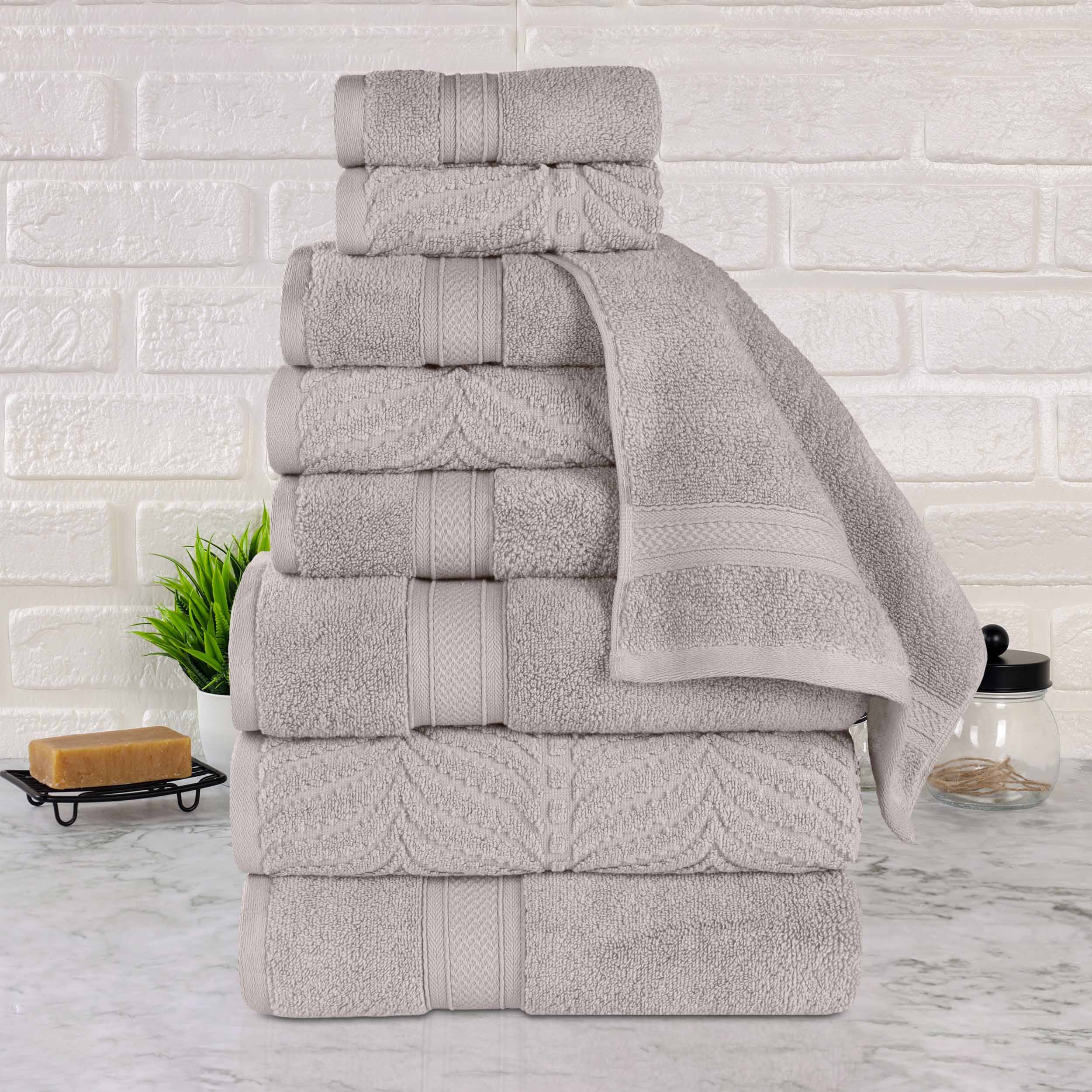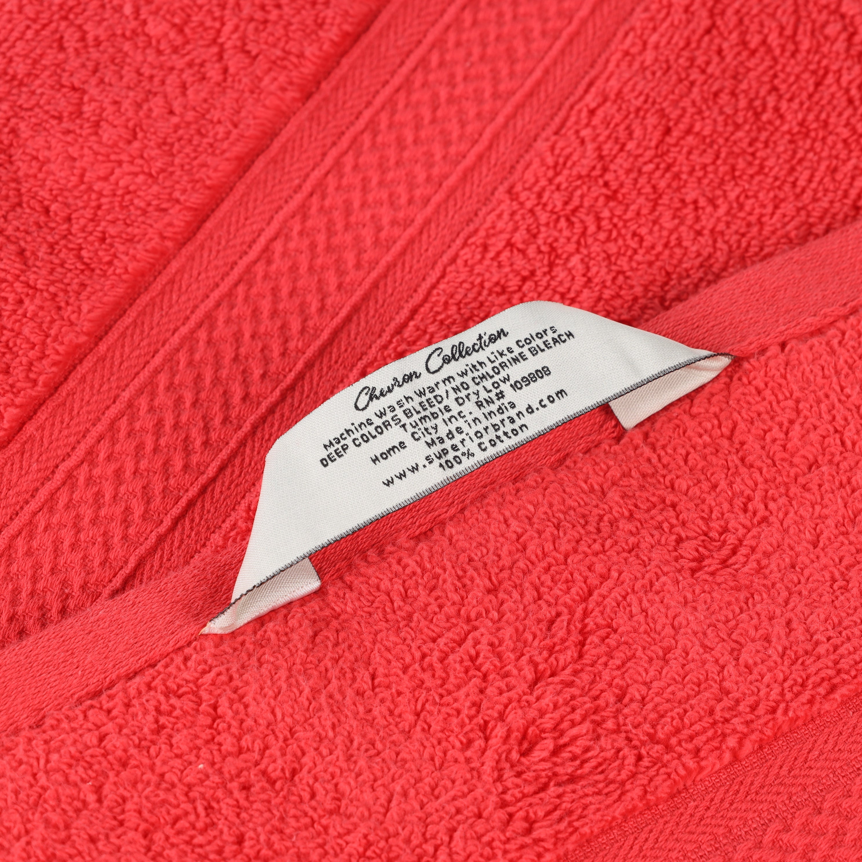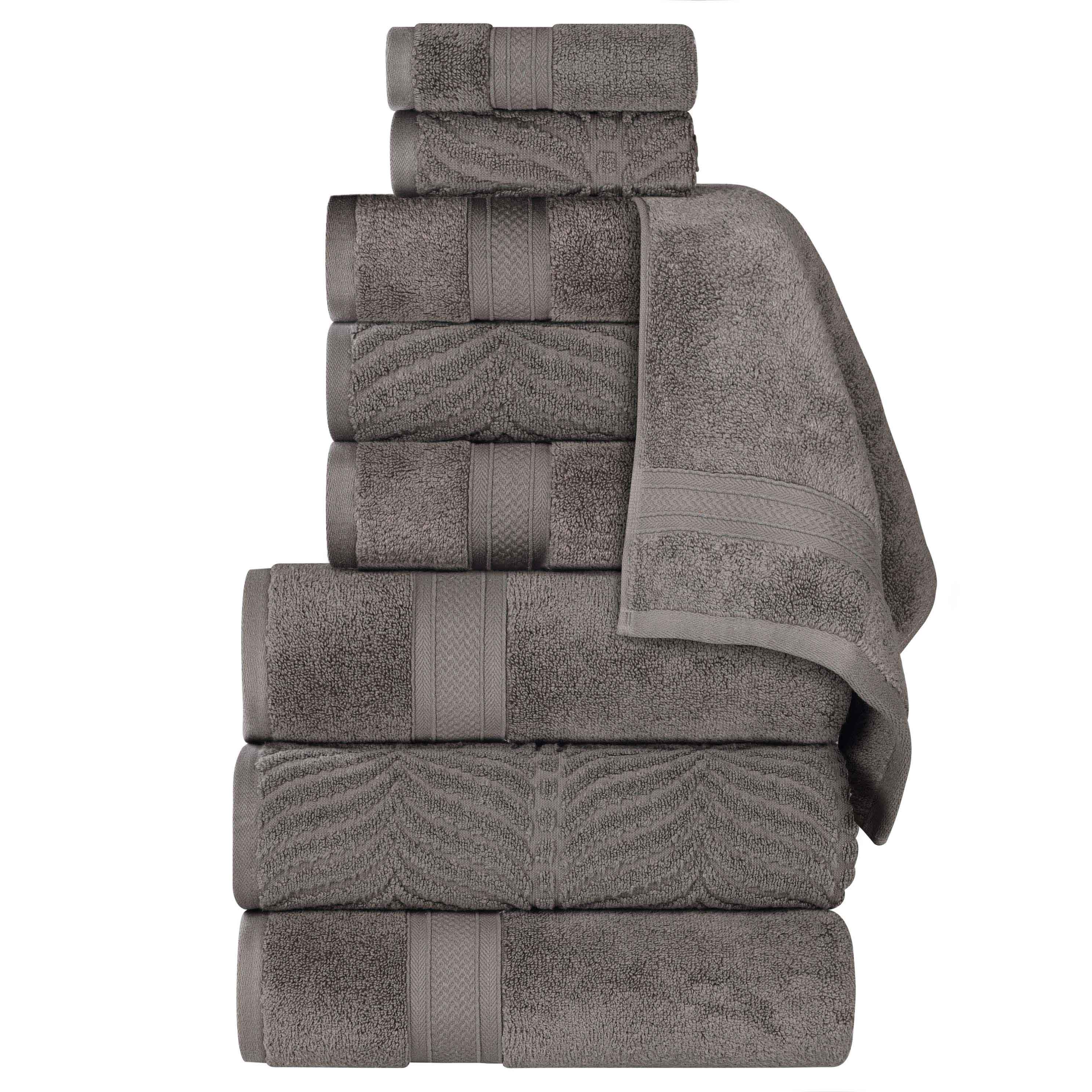 Enjoy a spa-like retreat with our Chevron Solid and Jacquard 9 Piece Towel Set. Our fluffy cotton towels have a luxuriously soft feel and the zero twist weave is plush, and highly-absorbent to get you dry quickly. The medium weight thickness of each towel is versatile and perfect for the bath, poolside, or at the beach. Boasting both solid and jacquard, chevron designs, bring unique style to your guest or master bathroom with this bundle. Each towel is finished with secure hemmed edges to avoid fraying and a durable single-ply to withstand countless washes and last you years to come. Featuring a hanging loop on each piece, enjoy both convenience and comfort with this versatile set.