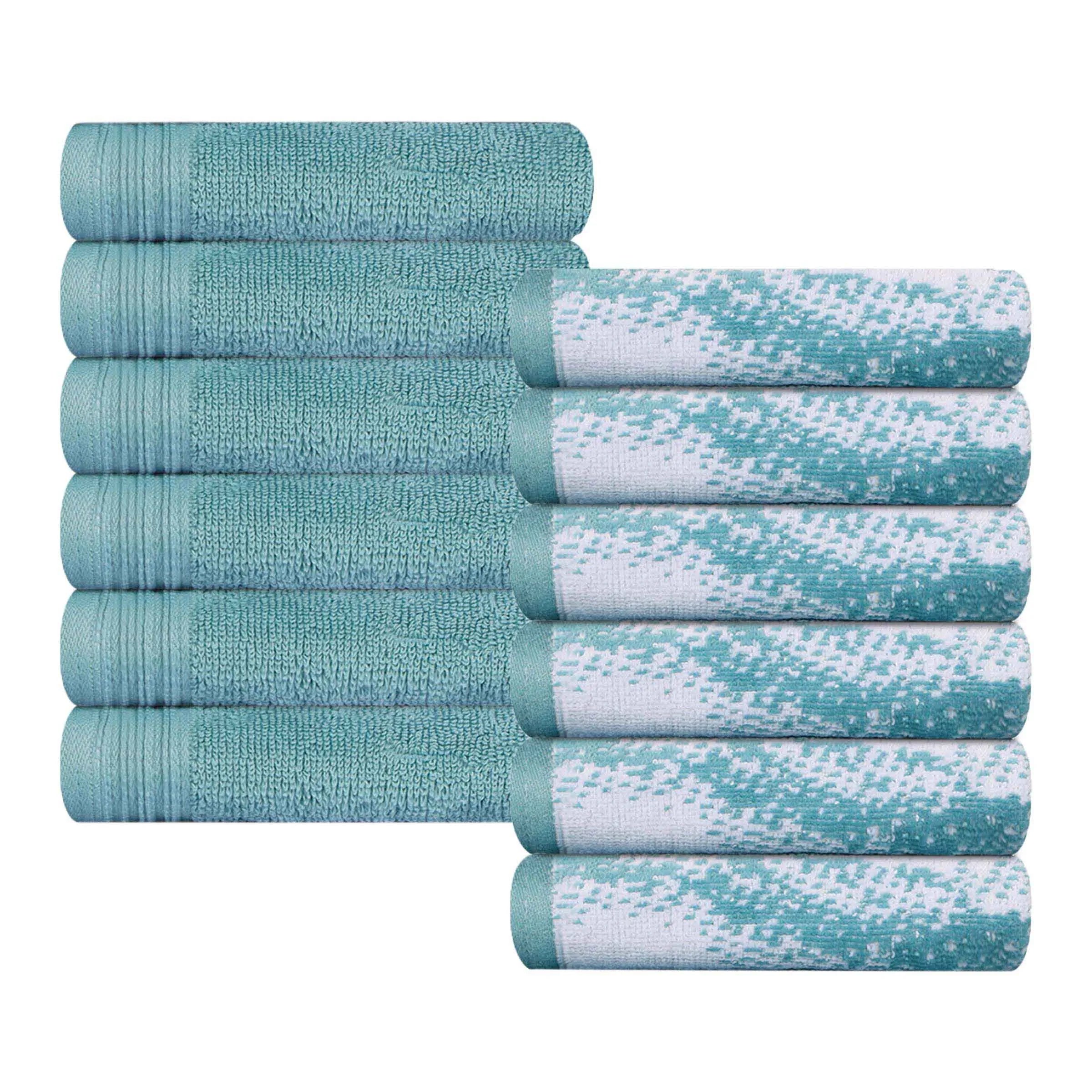Pamper your hands and face everyday with our Marble and Solid Cotton Face Towel Set. This face towel set includes a mix of vibrant solid pattern towels and towels with a contemporary marble effect pattern. Our medium weight cotton face towels have a double-ply design to provide comfort, durability and versatile absorption. Each towel is very plush to help you dry quickly, whether you're cleaning spills in the kitchen or getting ready for the day in the bathroom. These striking towels come in a variety of colors to instantly refresh your bathroom decor. Finished with a broad 4 inch rope-textured jacquard border and himmed edges, this towel set will add a finishing touch to your home decor style.