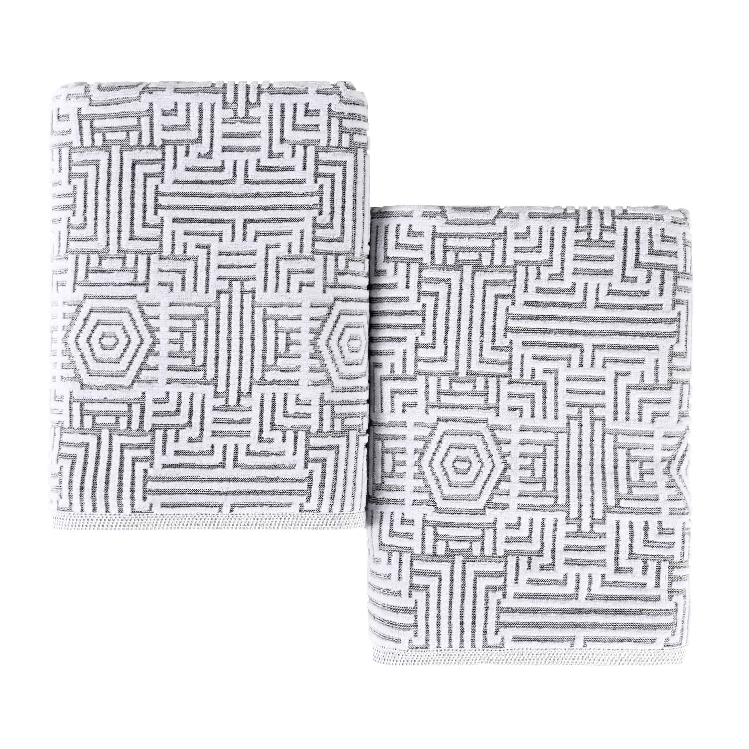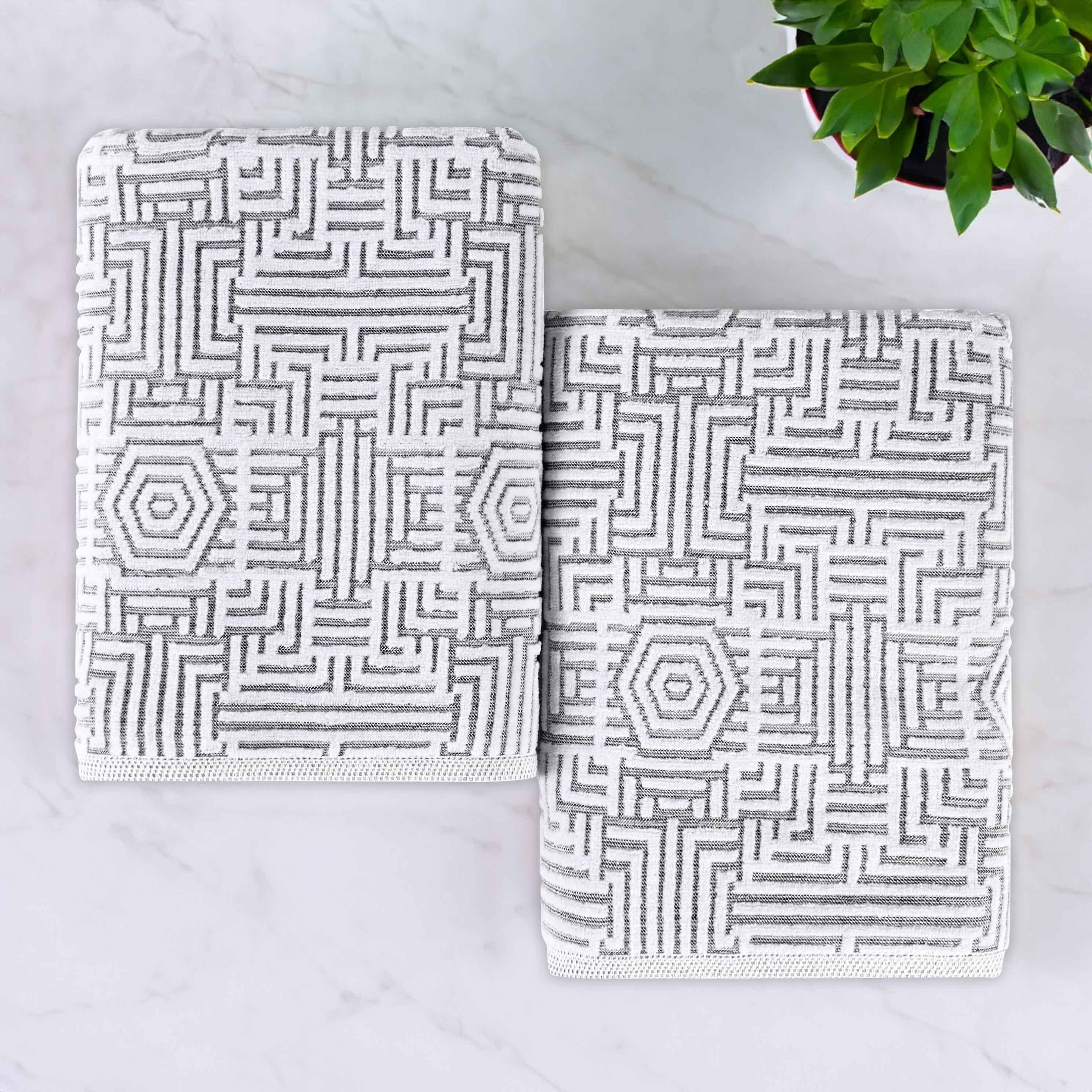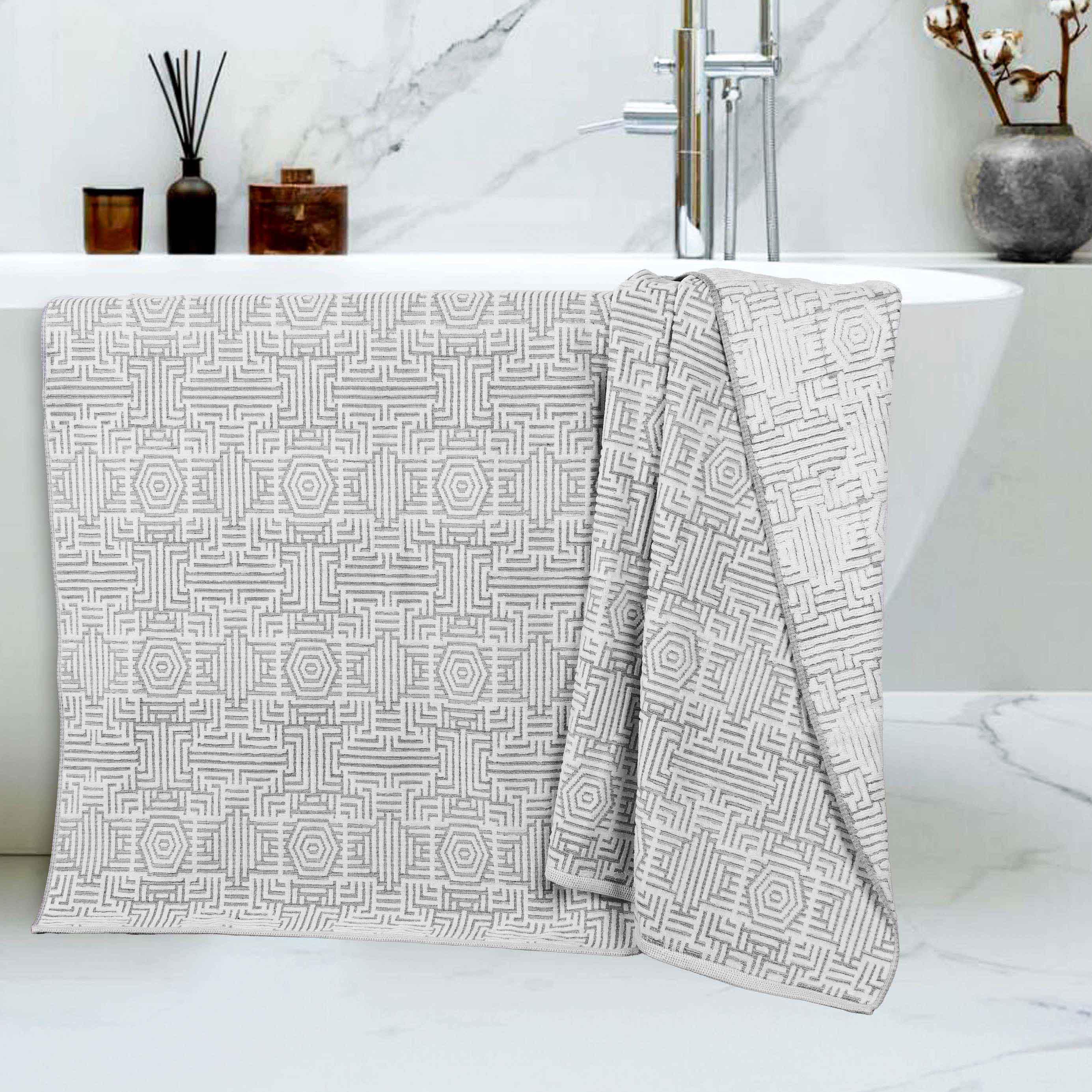 Wrap yourself in a lavish embrace of luxury with the Superior Cotton Modern Geometric Jacquard Plush Soft Absorbent Bath Sheet Set of 2. These 100% Cotton towels are crafted for a soft, absorbent, and luxurious experience. Boasting a textured geometric jacquard pattern, bring unique style to you guest or master bathroom with this bundle. Each towel is finished with secure hemmed edges to avoid fraying and a durable single-ply to withstand countless washes and last you years to come. Featuring a hanging loop on each piece, enjoy both convenience and comfort with this versatile set.