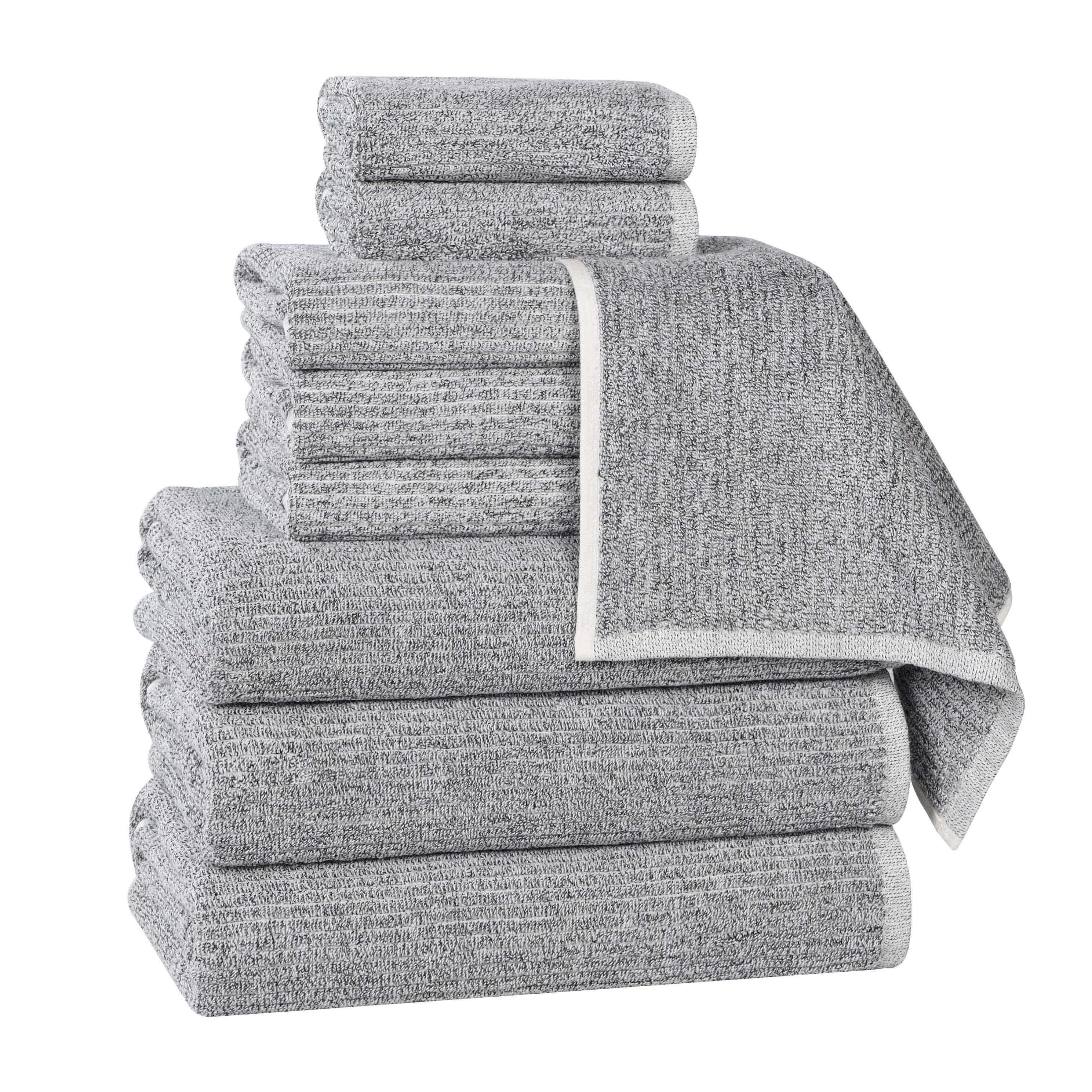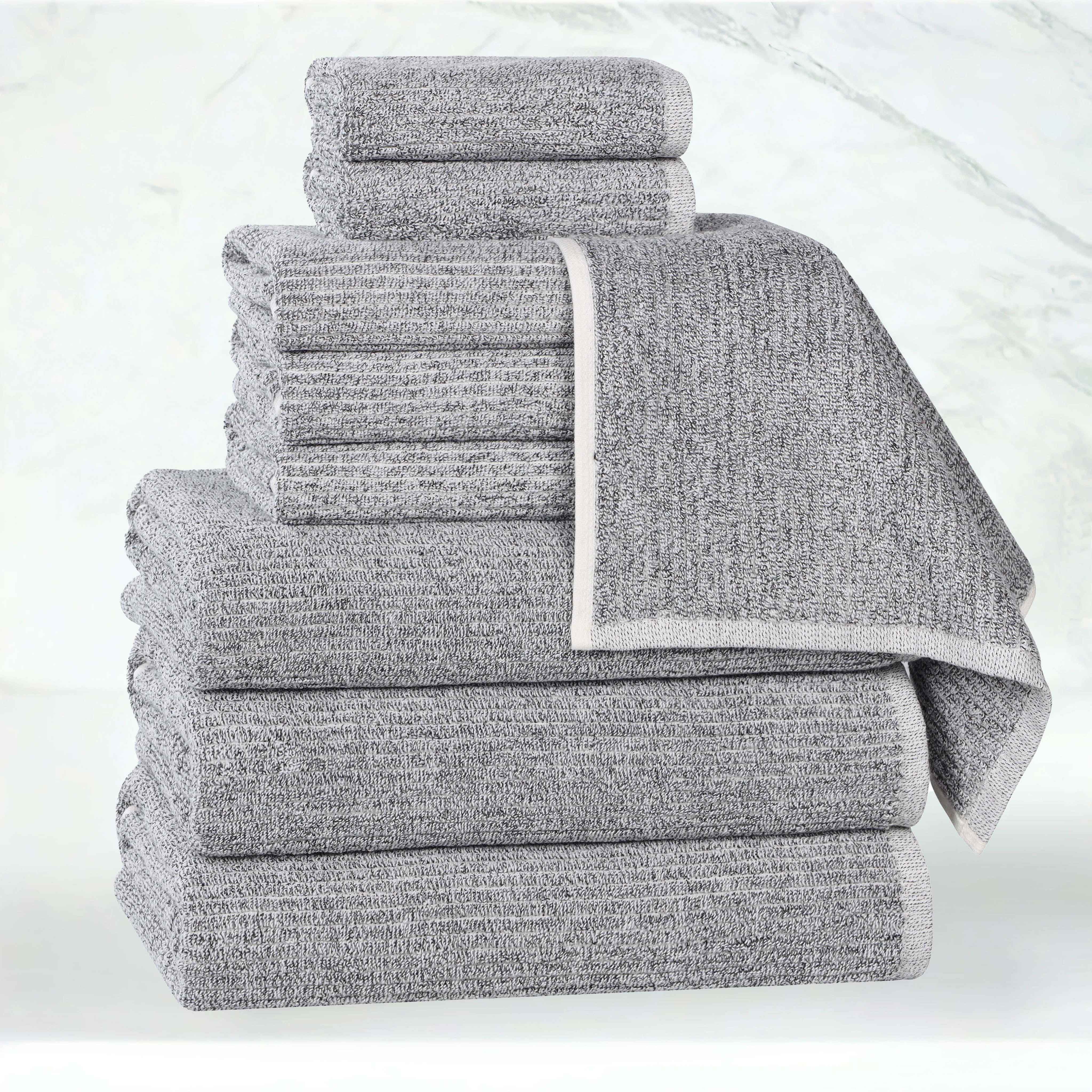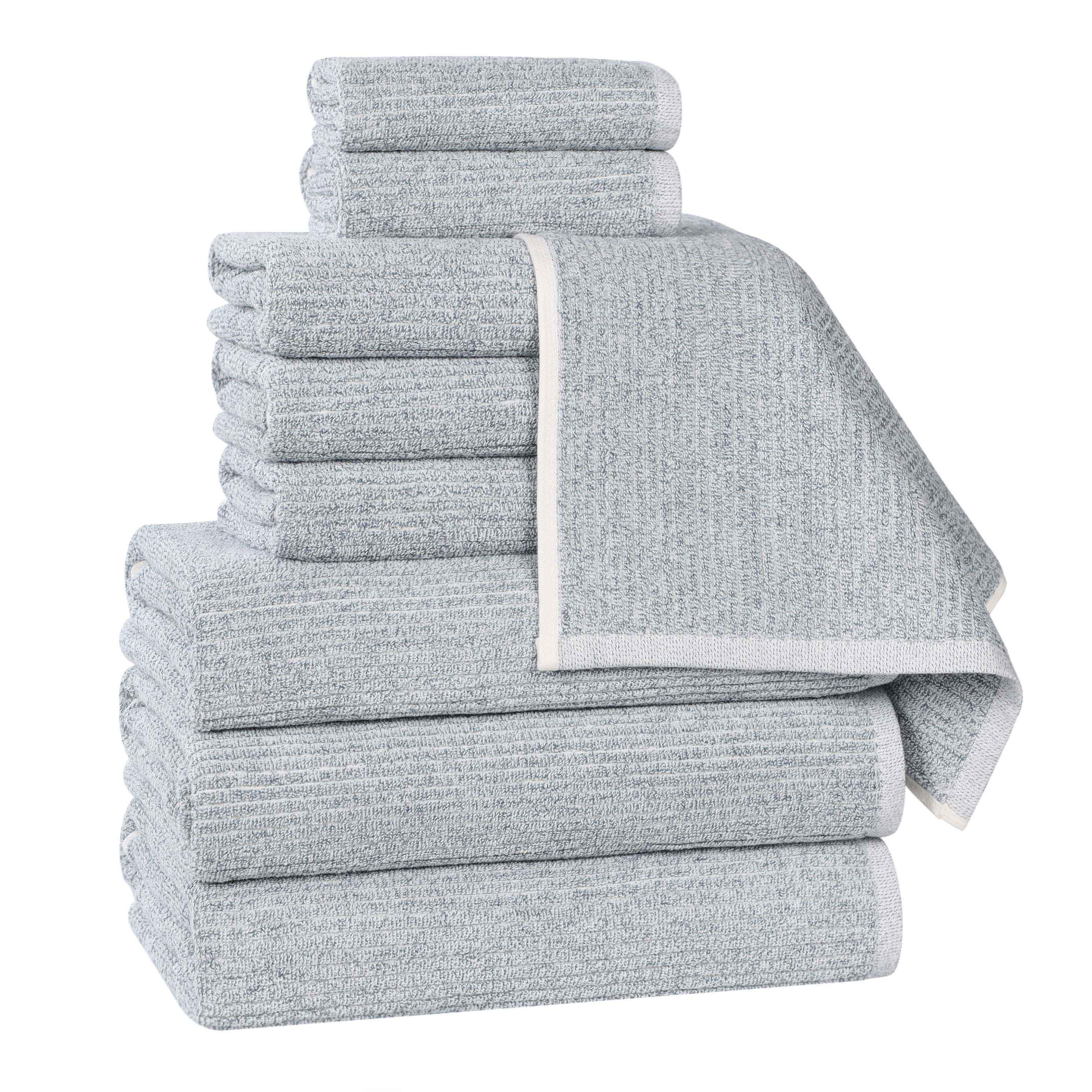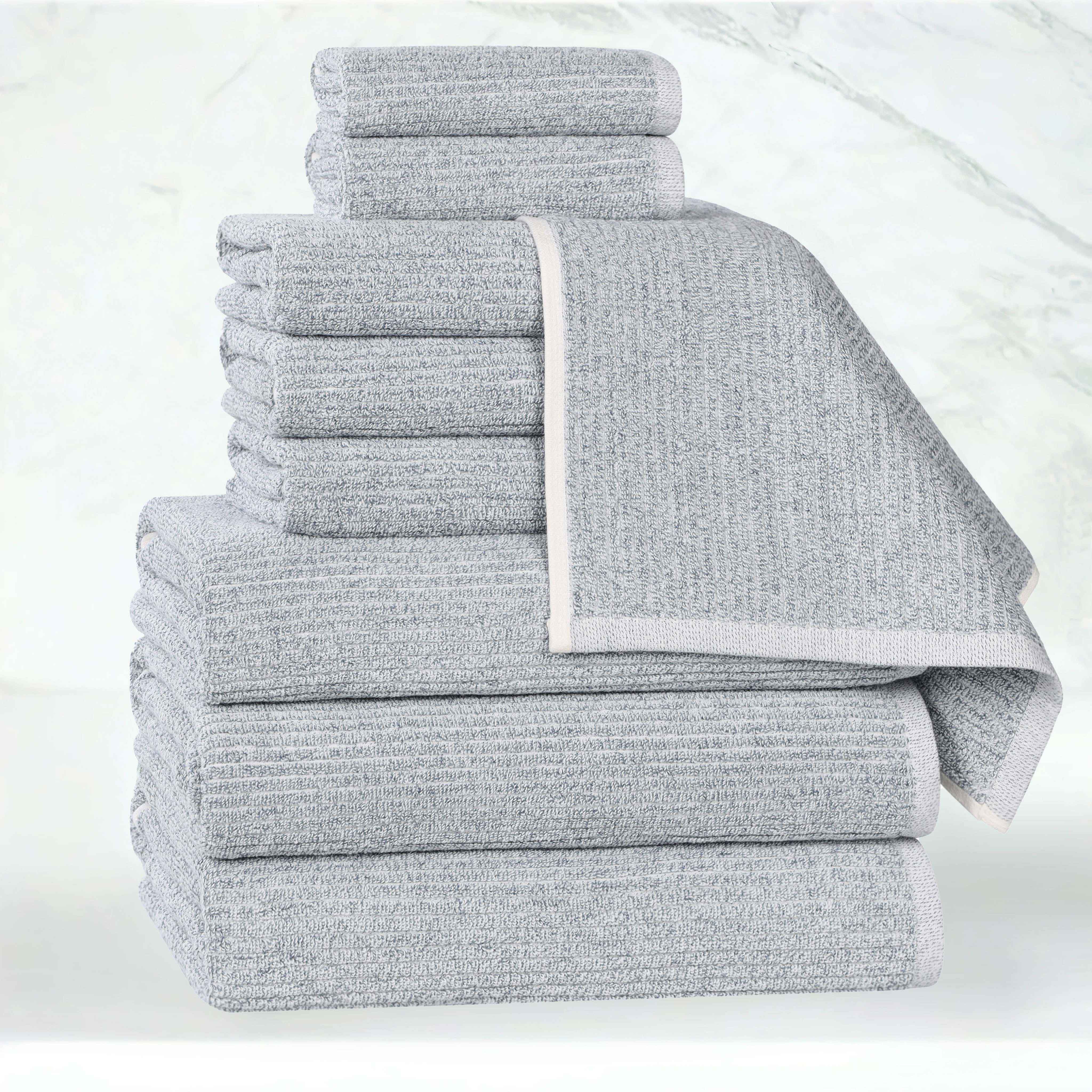 Envelop yourself in a world of unparalleled comfort and sophistication with our Destin Cotton Blend Medium Weight Textured Ribbed 9 Piece Towel Set, designed to transform your bathroom into a personal sanctuary. The distinctive textured ribbed design lends an air of timeless elegance to these exceptionally soft and absorbent towels. Crafted from a premium blend of 80% cotton and 20% viscose, they are meticulously woven to provide lasting comfort and exceptional durability. Experience the difference that superior craftsmanship and exquisite design can make in your everyday life. The addition of viscose not only enhances the softness and absorbency of these towels but also allows for a spectrum of vibrant colors that will enliven your bathroom decor.