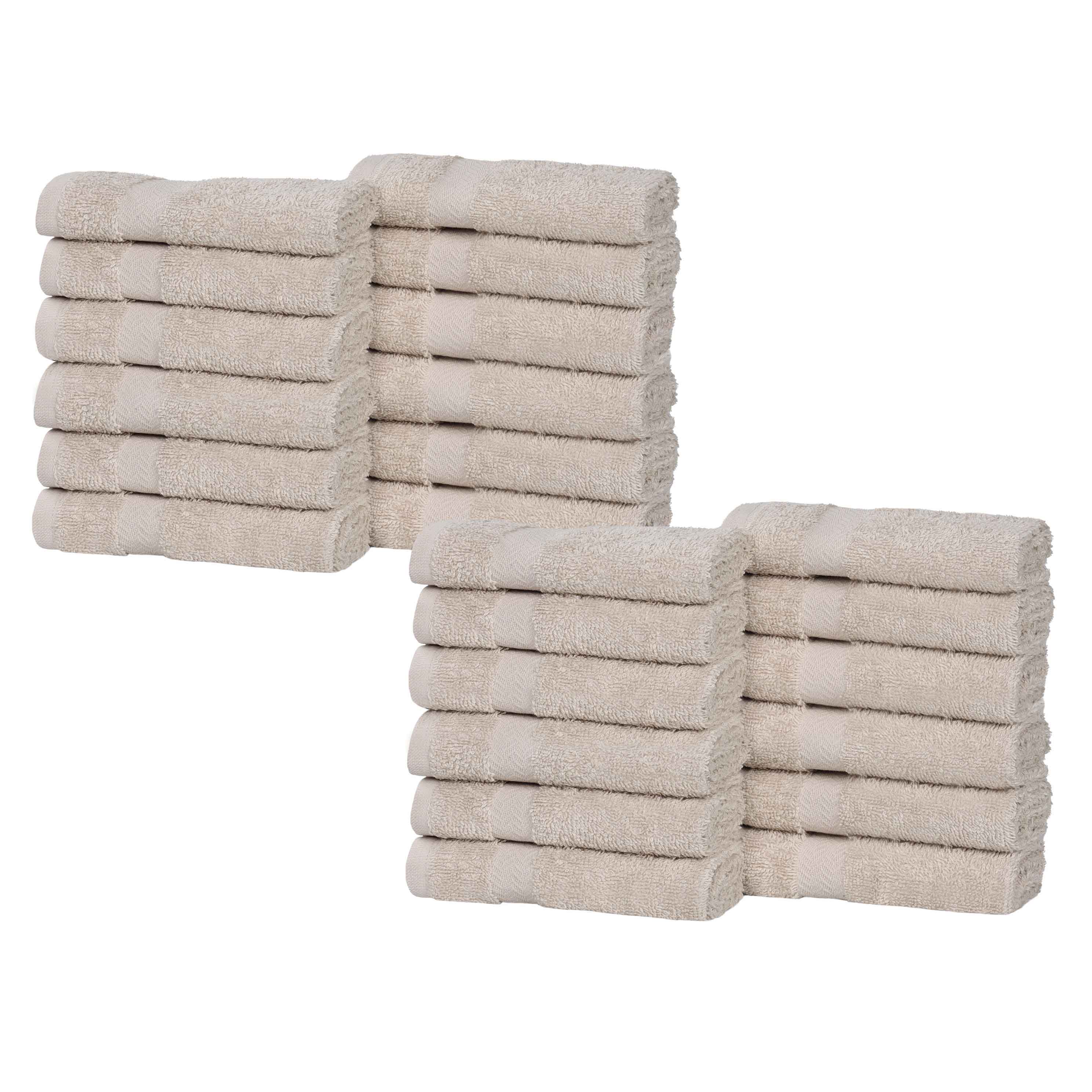 Incredibly absorbent yet surprisingly light and lofty, the Eco-Friendly Cotton Highly Absorbent 24-Piece Washcloth Set will add a subtle splash of color to your surrounding bathroom decor. This ultra-absorbent Cotton bundle is perfect for everyday use, and each solid washcloth is finished with a gorgeous chevron trim. Eco-Friendly dyes give this set a lively feel that's ideal for any master or guest bath, while the end hems are neatly turned and firmly stitched for long-lasting durability. These generously sized face towels are extra absorbent to provide quick drying and only get softer with every wash. Available in an array of cheerful color options, this set is great for the gym, beach, travel or dorm.