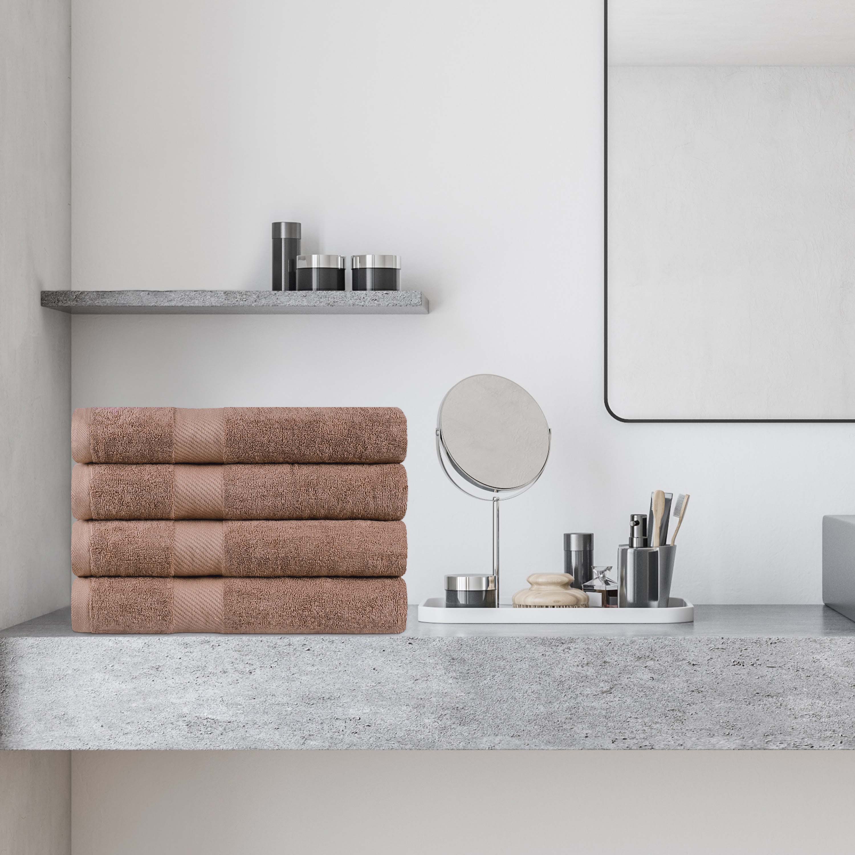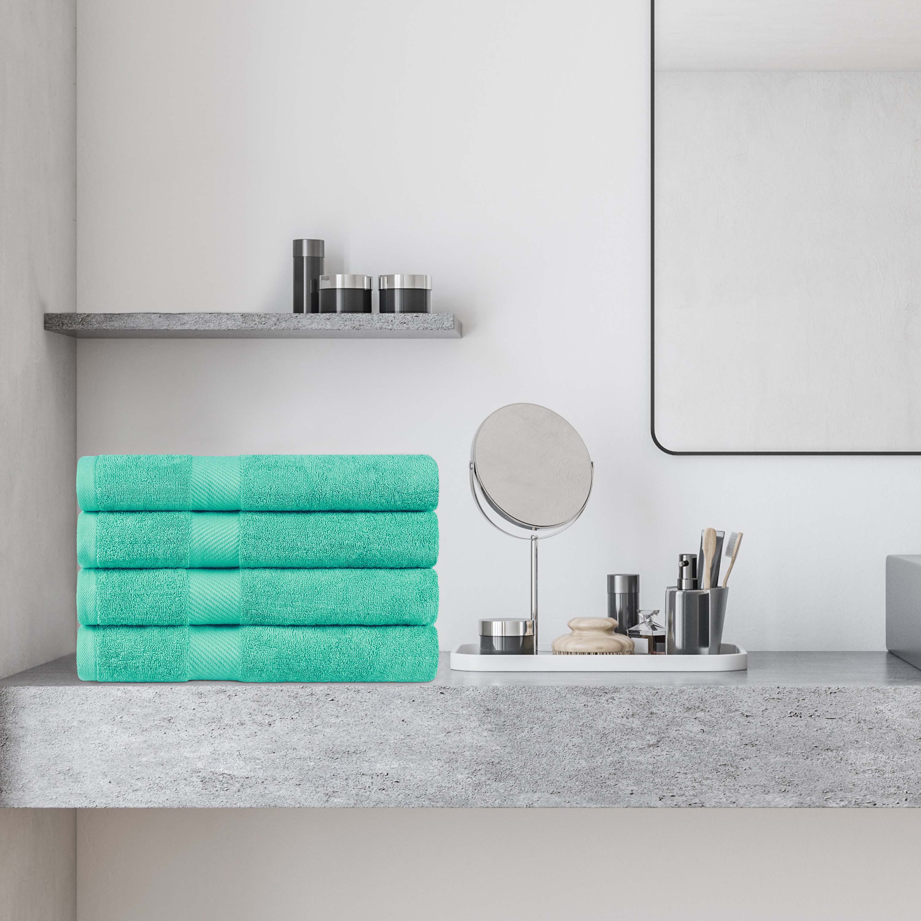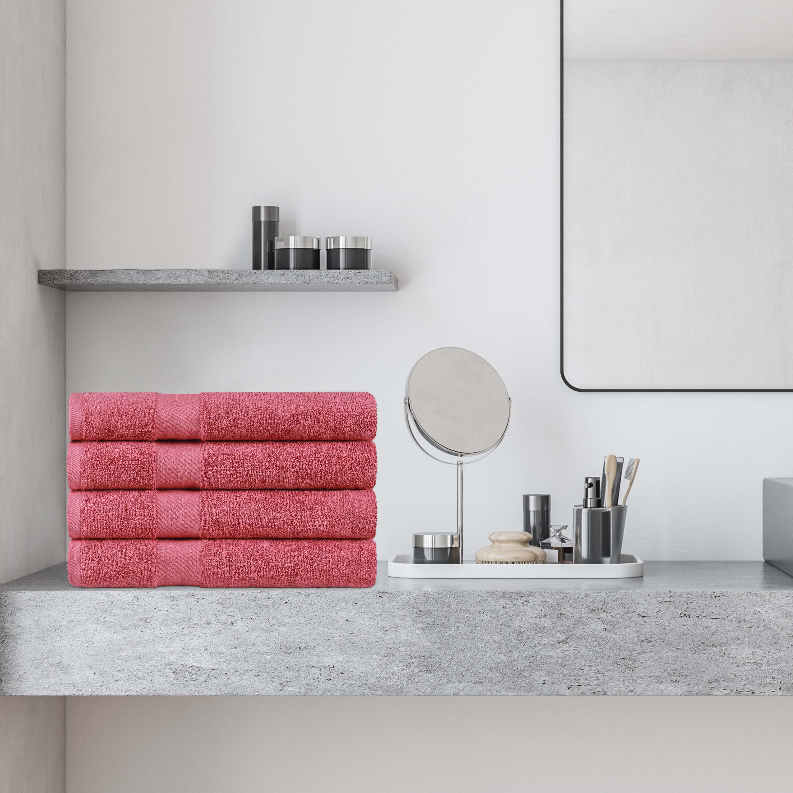 This bath towel set includes four generously sized bath towels, crafted with medium towel weight to soak up water efficiently while drying quickly. Each towel features a convenient hanging loop for easy storage and drying.