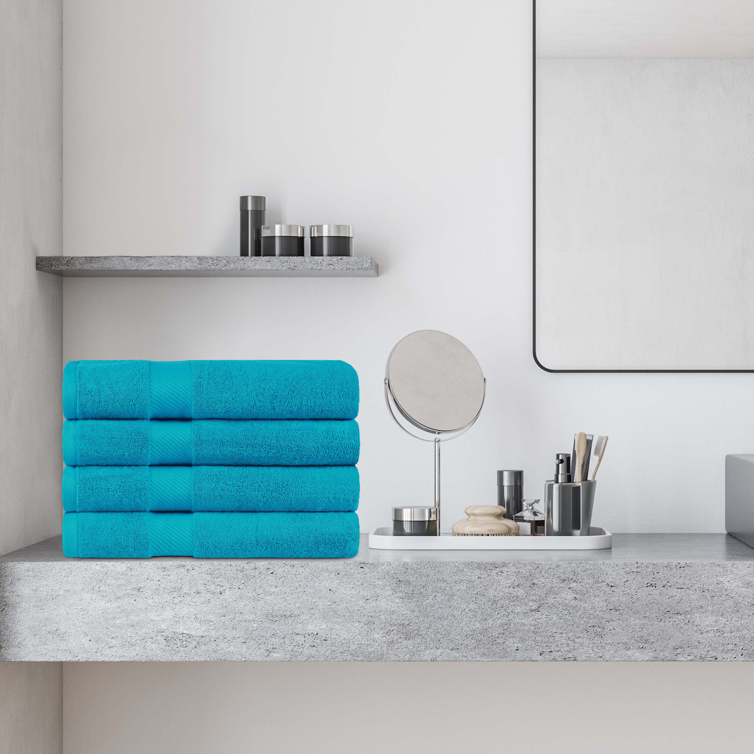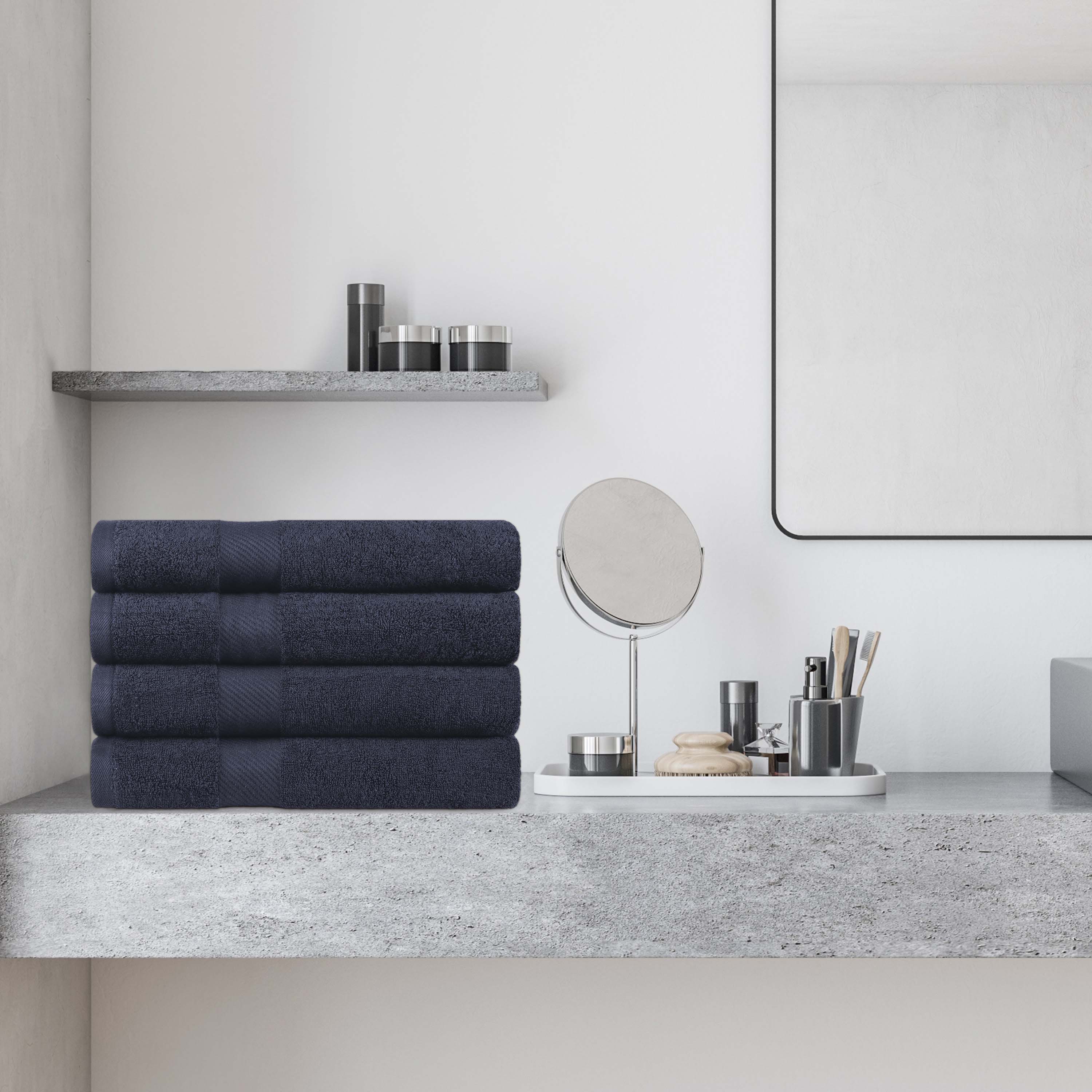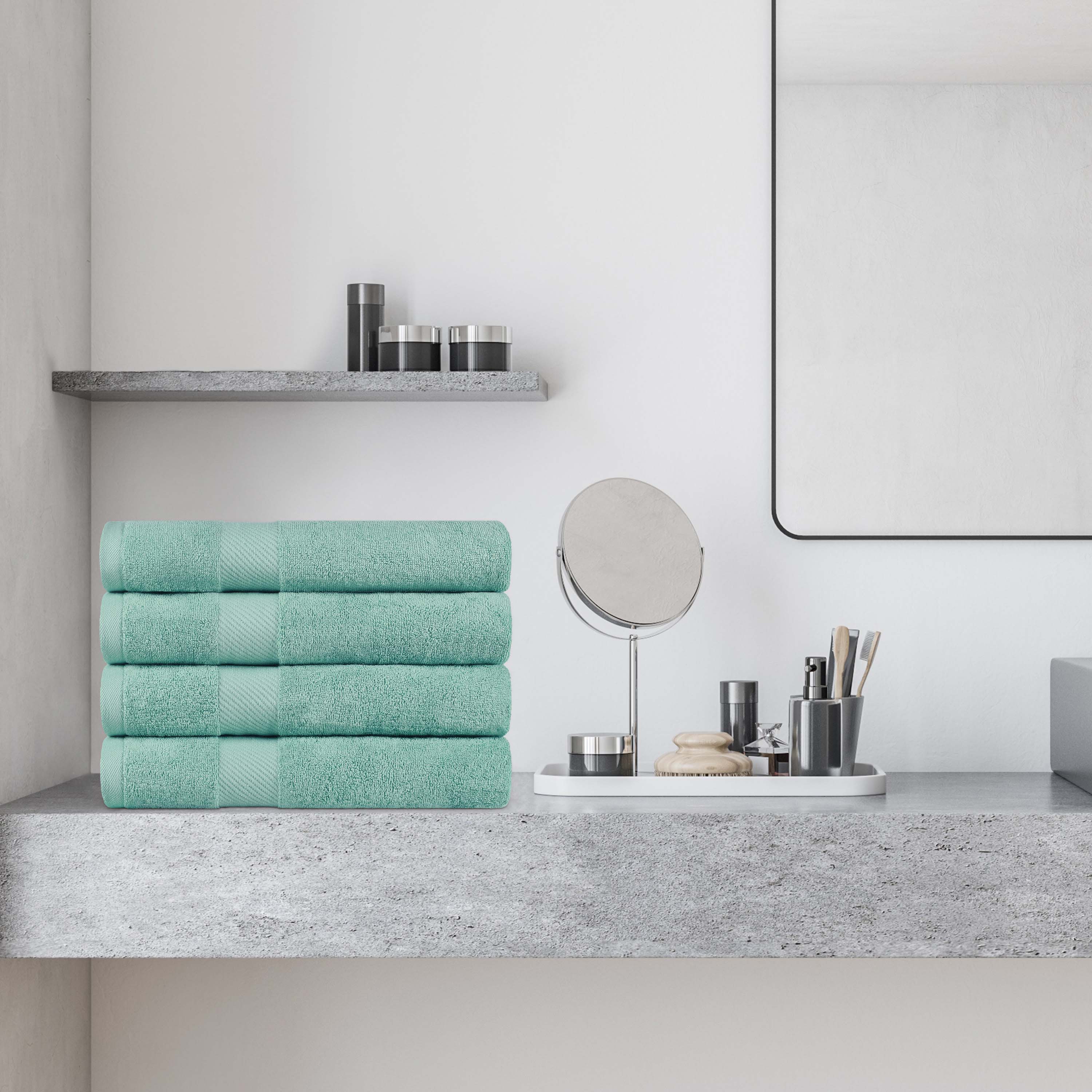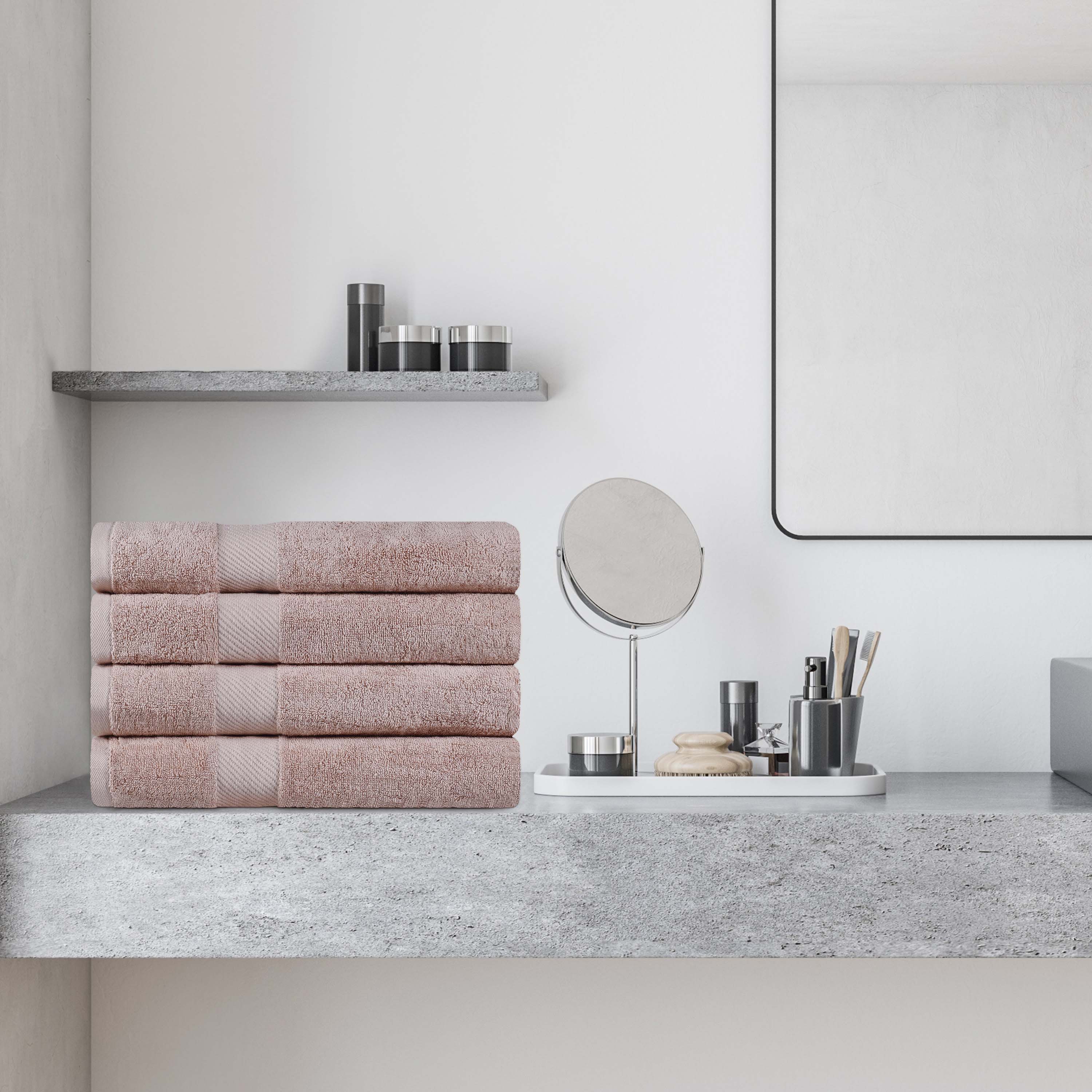 This bath towel set includes four generously sized bath towels, crafted with medium towel weight to soak up water efficiently while drying quickly. Each towel features a convenient hanging loop for easy storage and drying.
