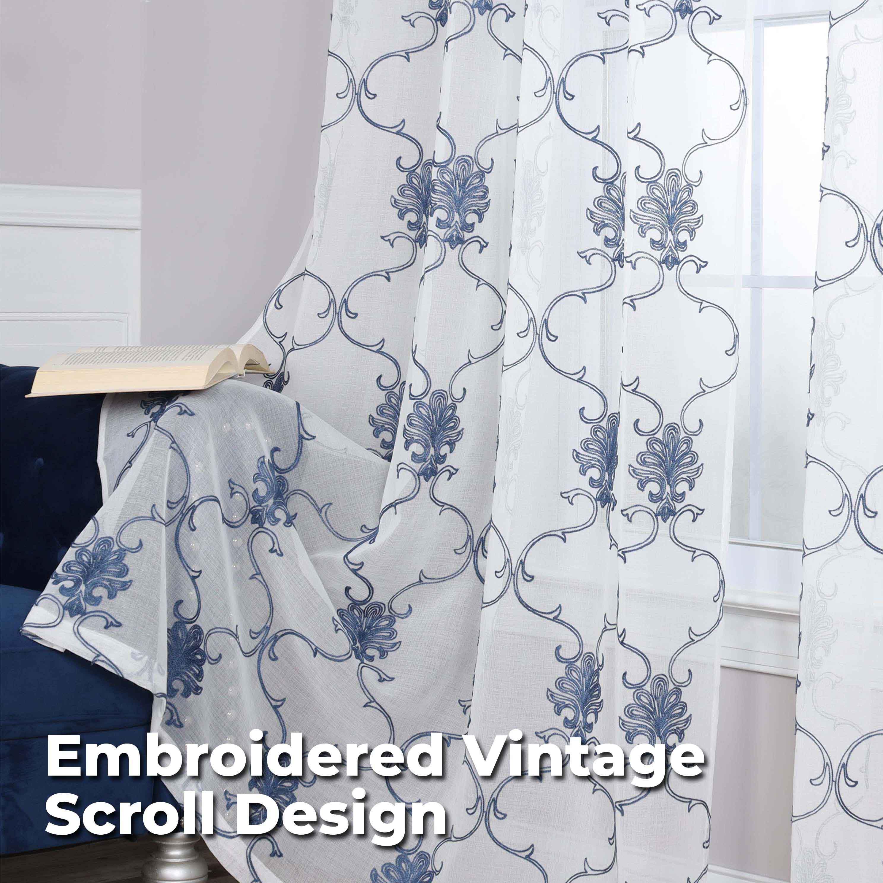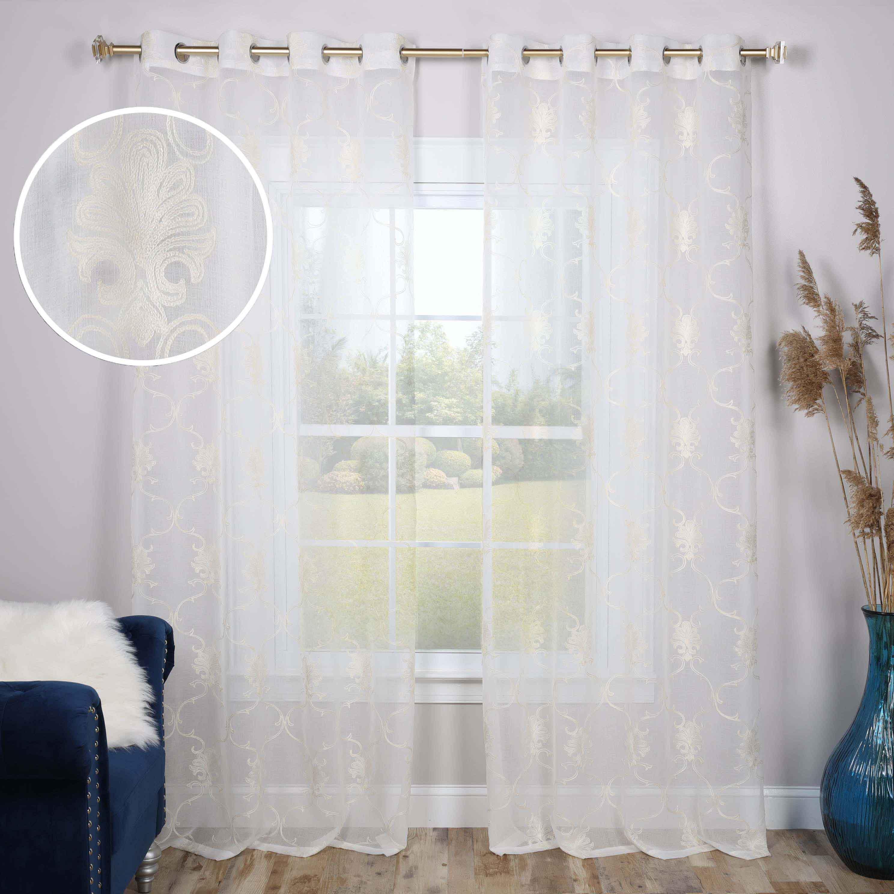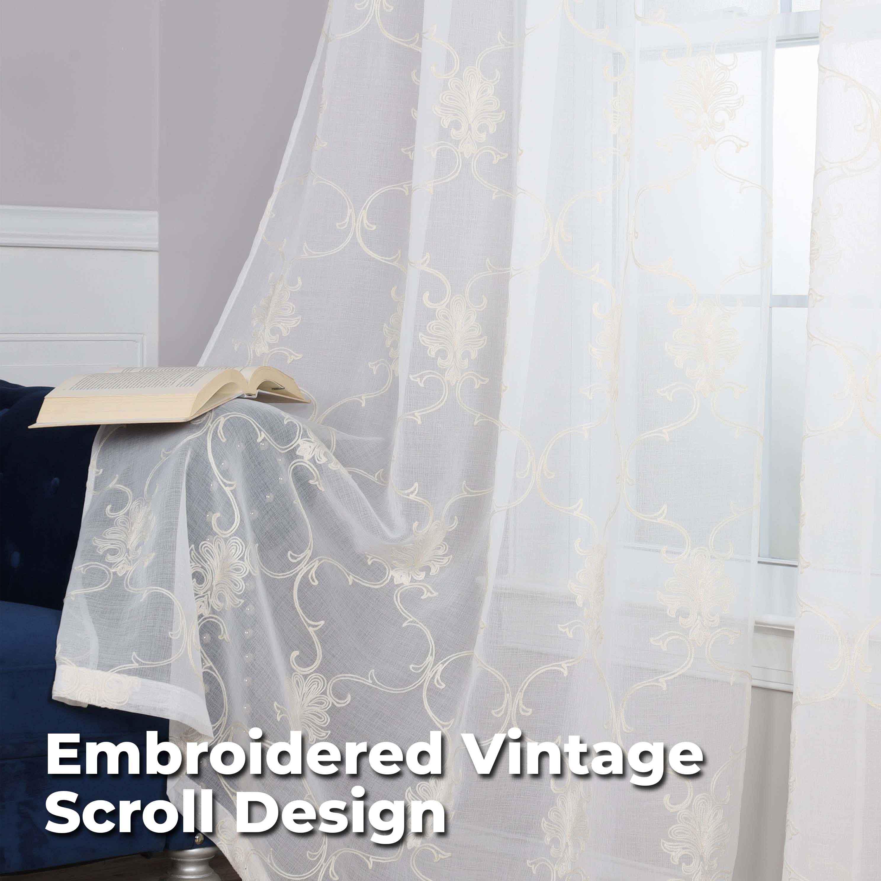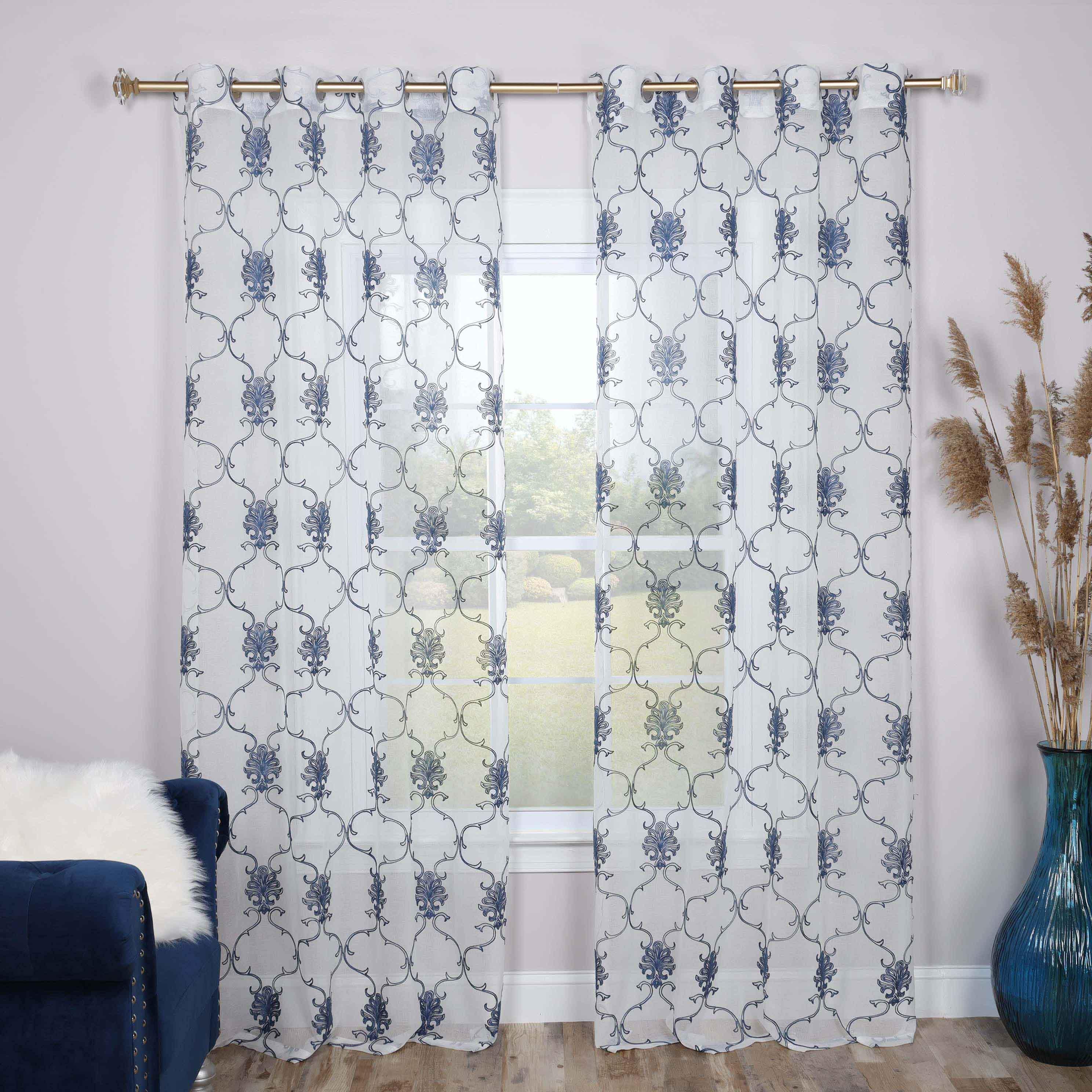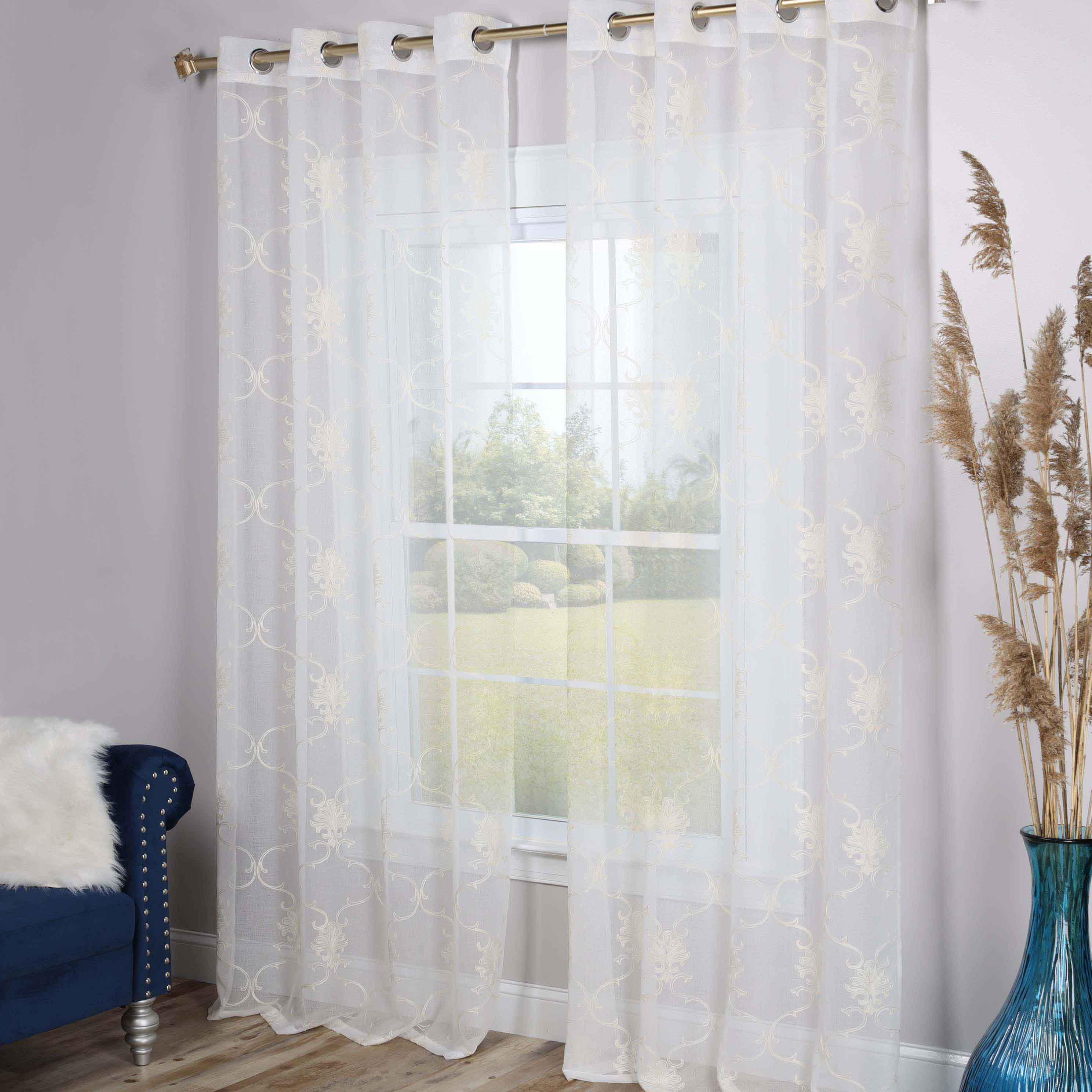 Incorporate an elegant accent to your favorite space with the Elegant Scroll Sheer Curtain Set. Embellished with fancy Victorian scrolls with a vintage-style damask design helps to create an alluring look in your home. These transparent curtains feature quality polyester construction that makes them durableand stylish in design. The polished, stainless grommets lining the tops of these sheers make installation hassle-free and give them a modern flourish. Available in assorted sizes and colors, these panels will bring a soothing accent to your windows while still allowing natural light to filter into your home.