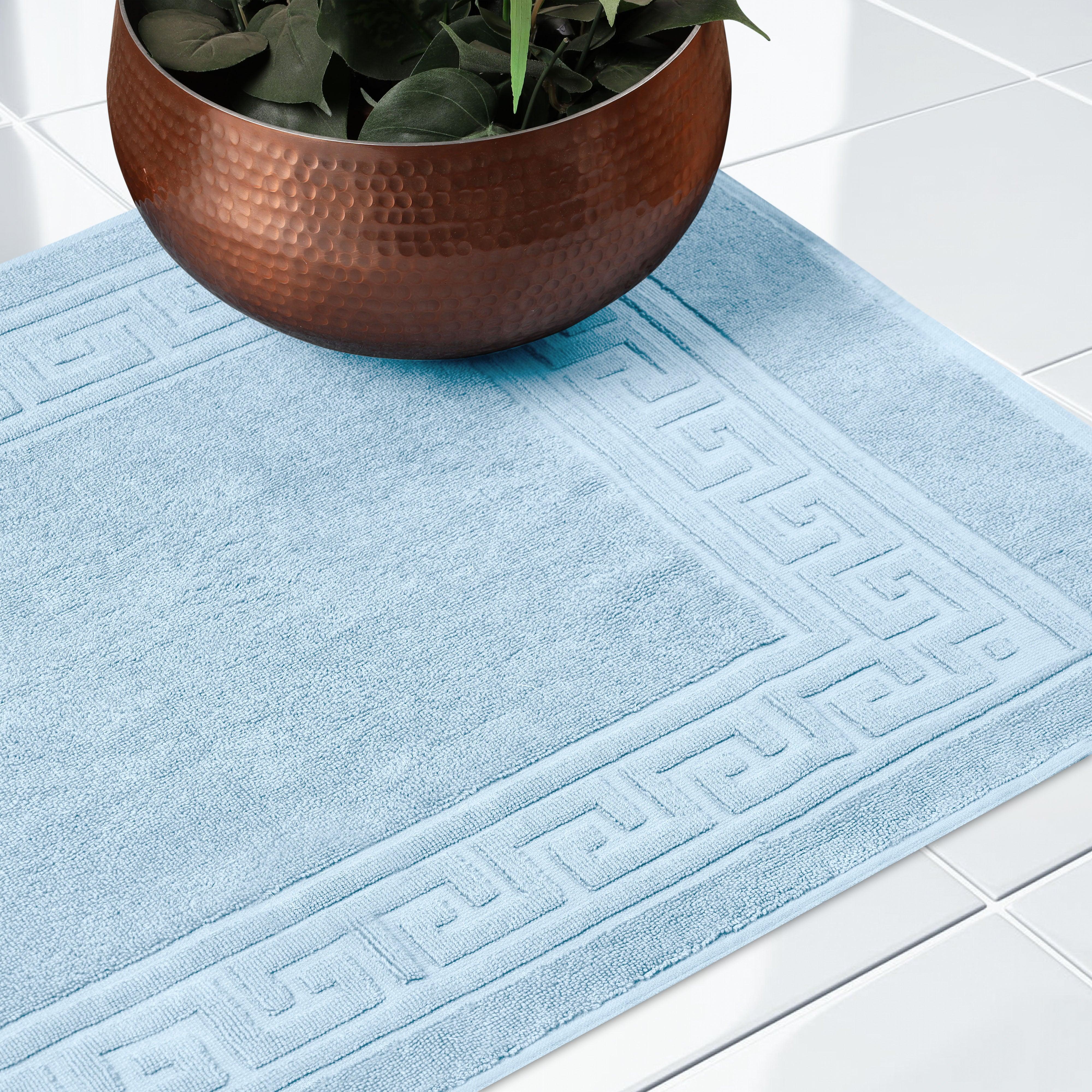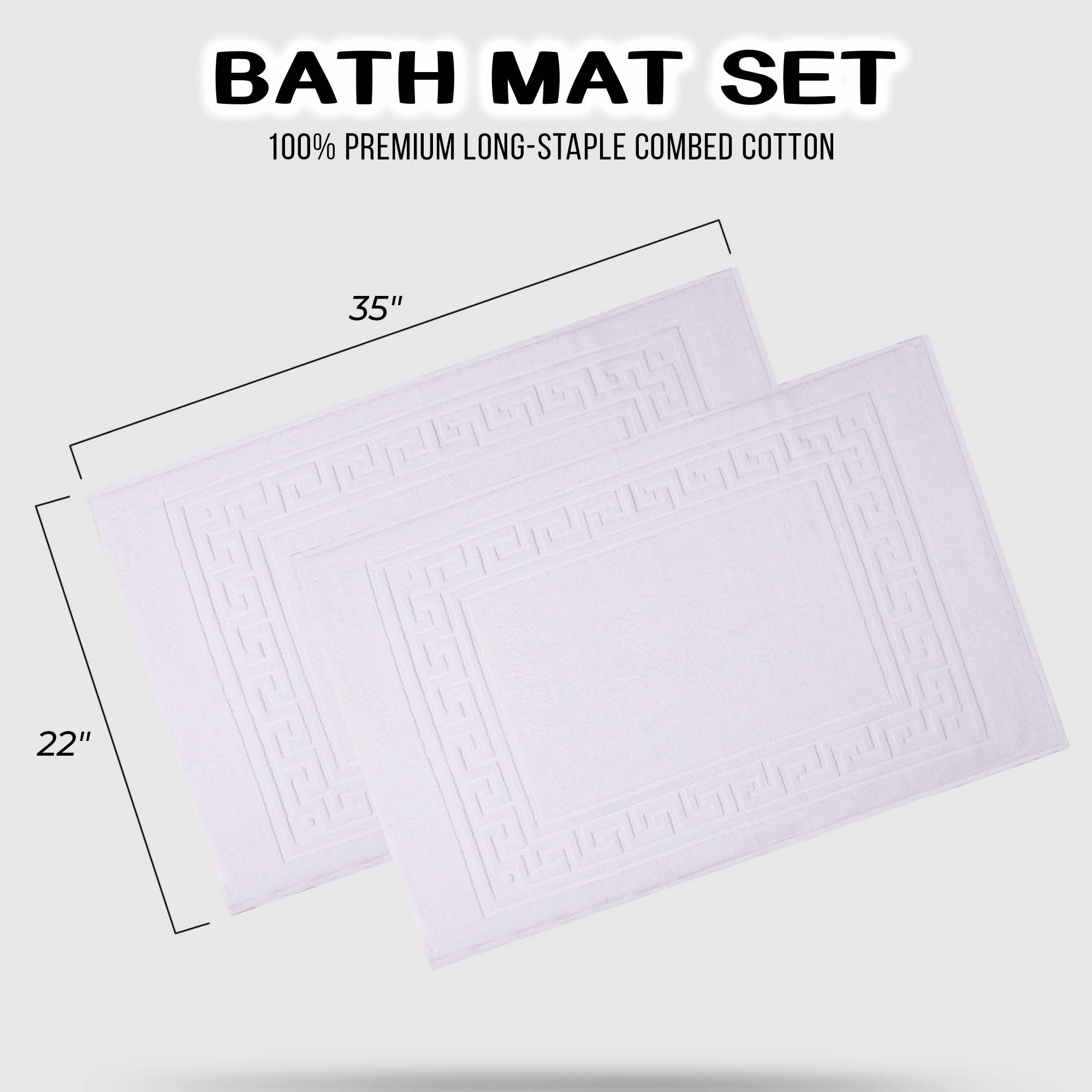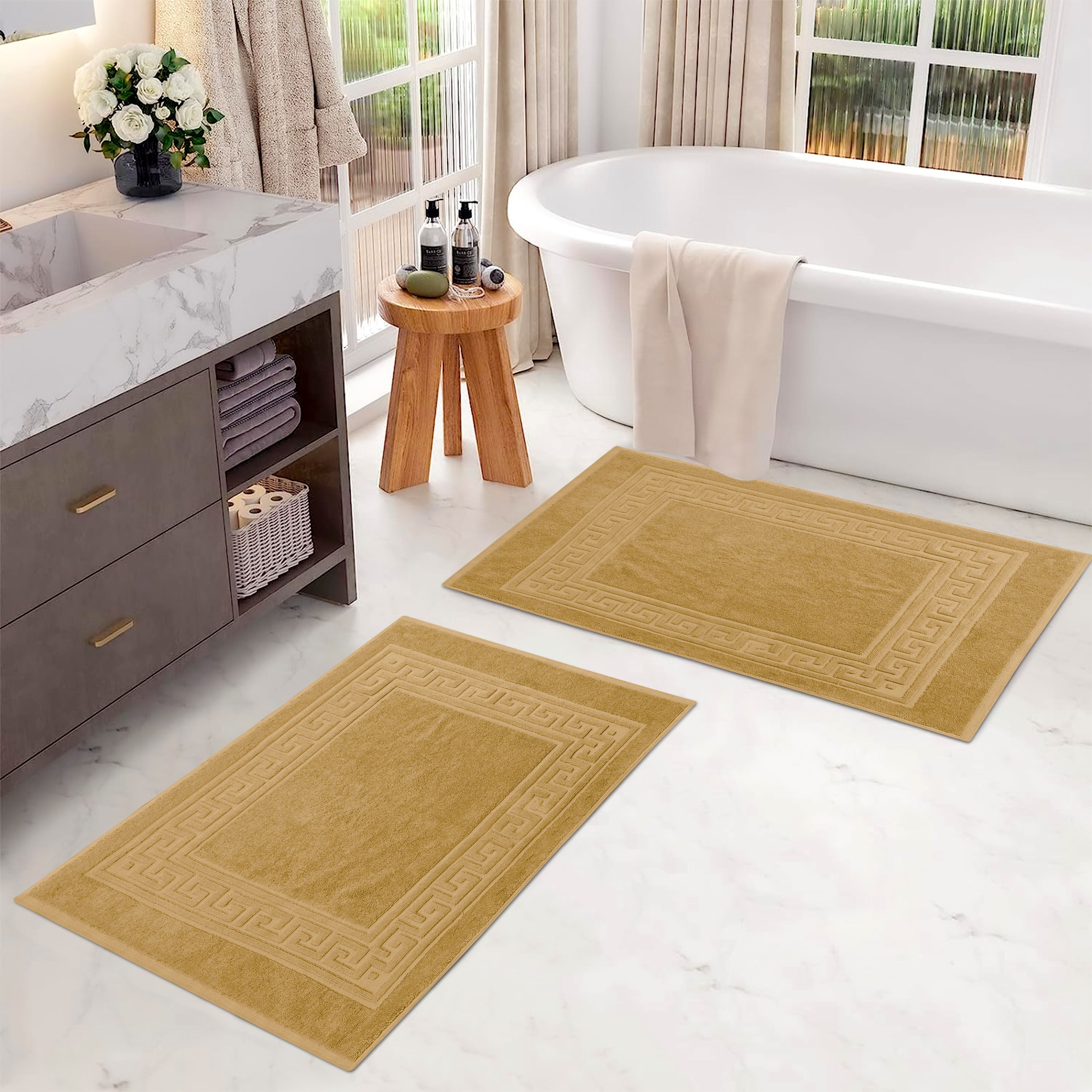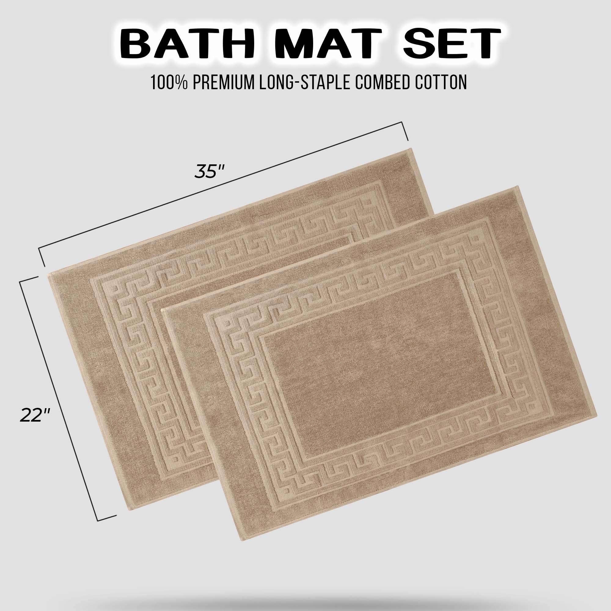 Elevate the look of your bathroom or powder room with the Egyptian Cotton Greek Key Border 2 Piece Bath Mat Set. Crafted from durable Egyptian cotton, our most opulent bath mats feel extremely plush underfoot. This machine washable set features a woven terry surface on both sides giving it enhanced comfort and absorbency. Perfect for everyday use, enjoy cloud-like comfort every time you step out of your shower or bath. Showcasing a traditional Greek key border, add classic elegance to your bathroom style with this luxurious set. This bath mat set is also OEKO-TEX certified, meaning it does not contain any harmful substances or chemicals, ensuring quality, comfort, and wellness.
