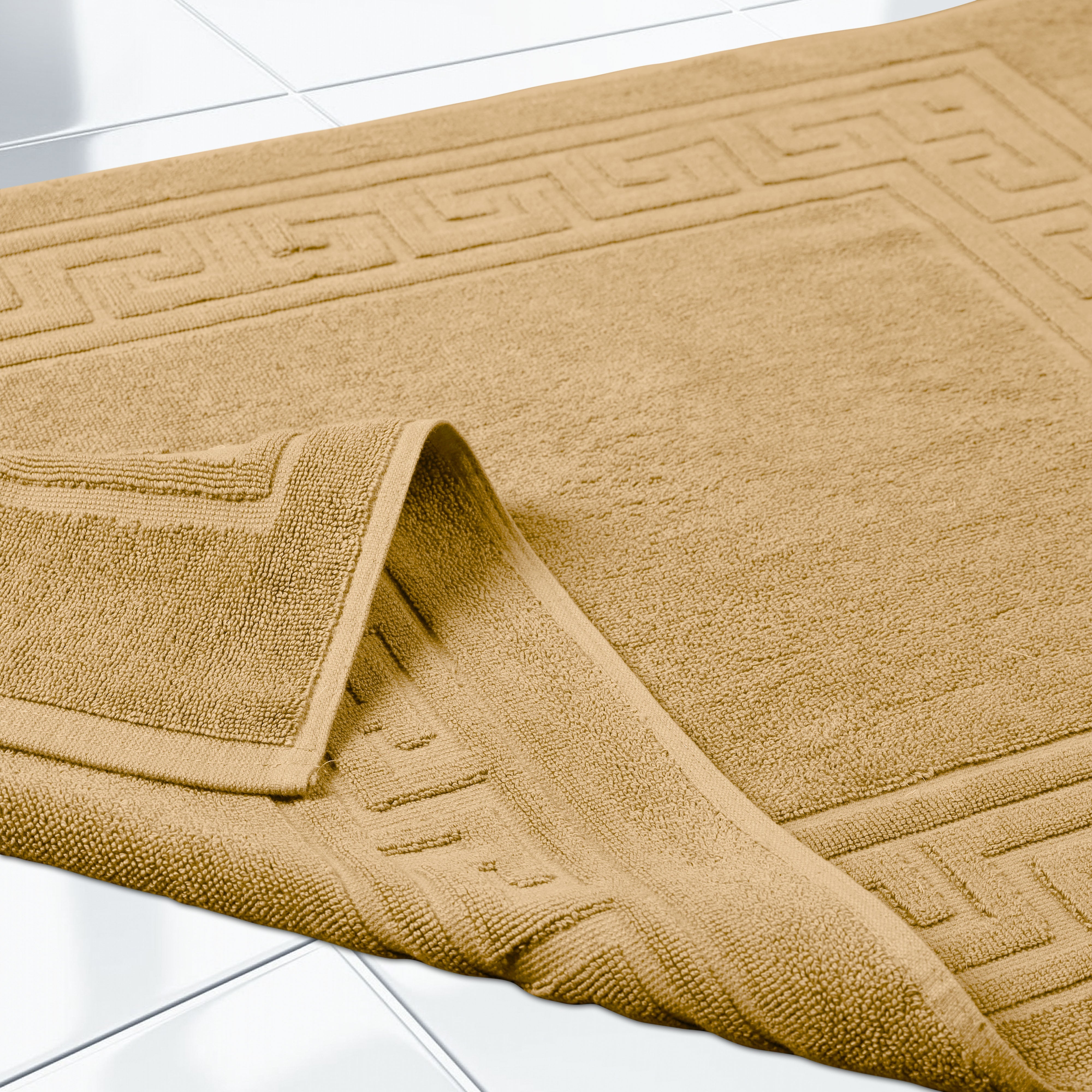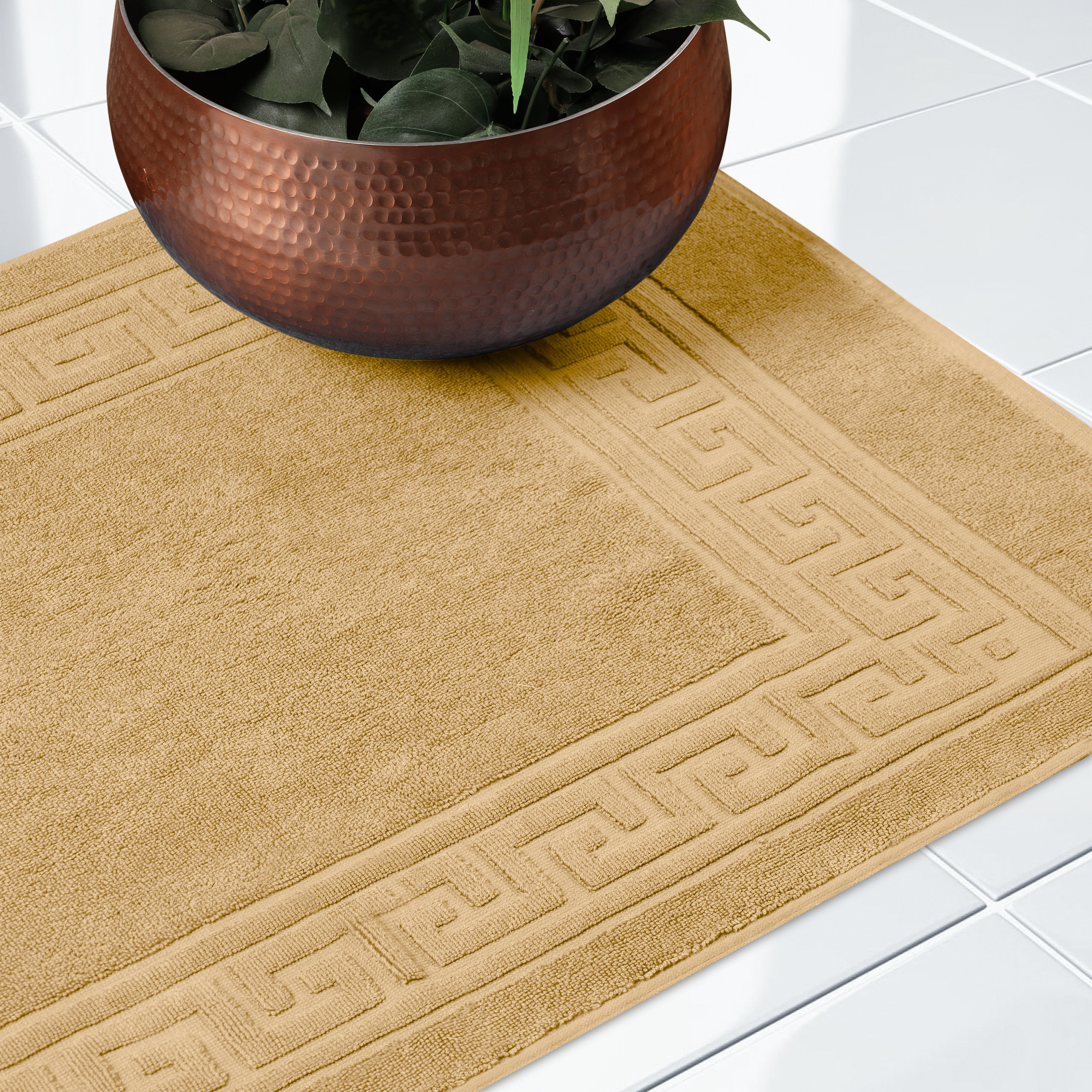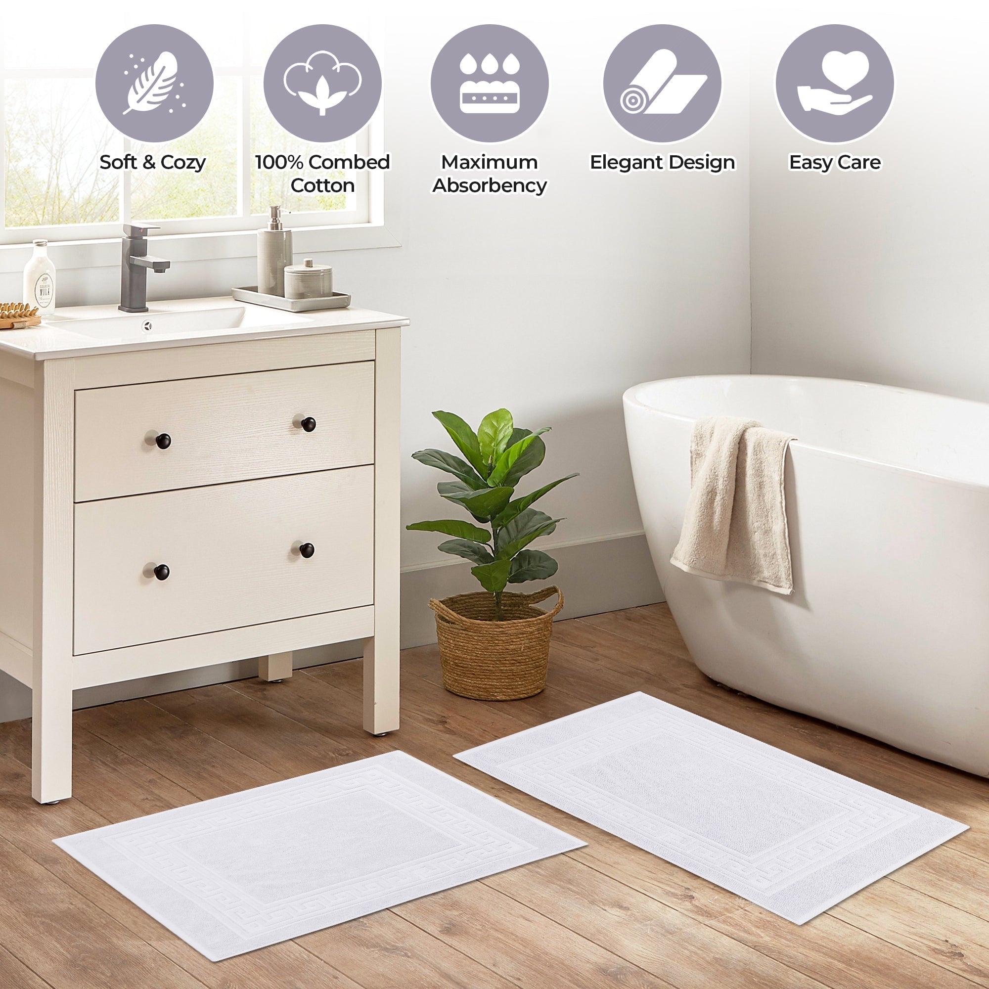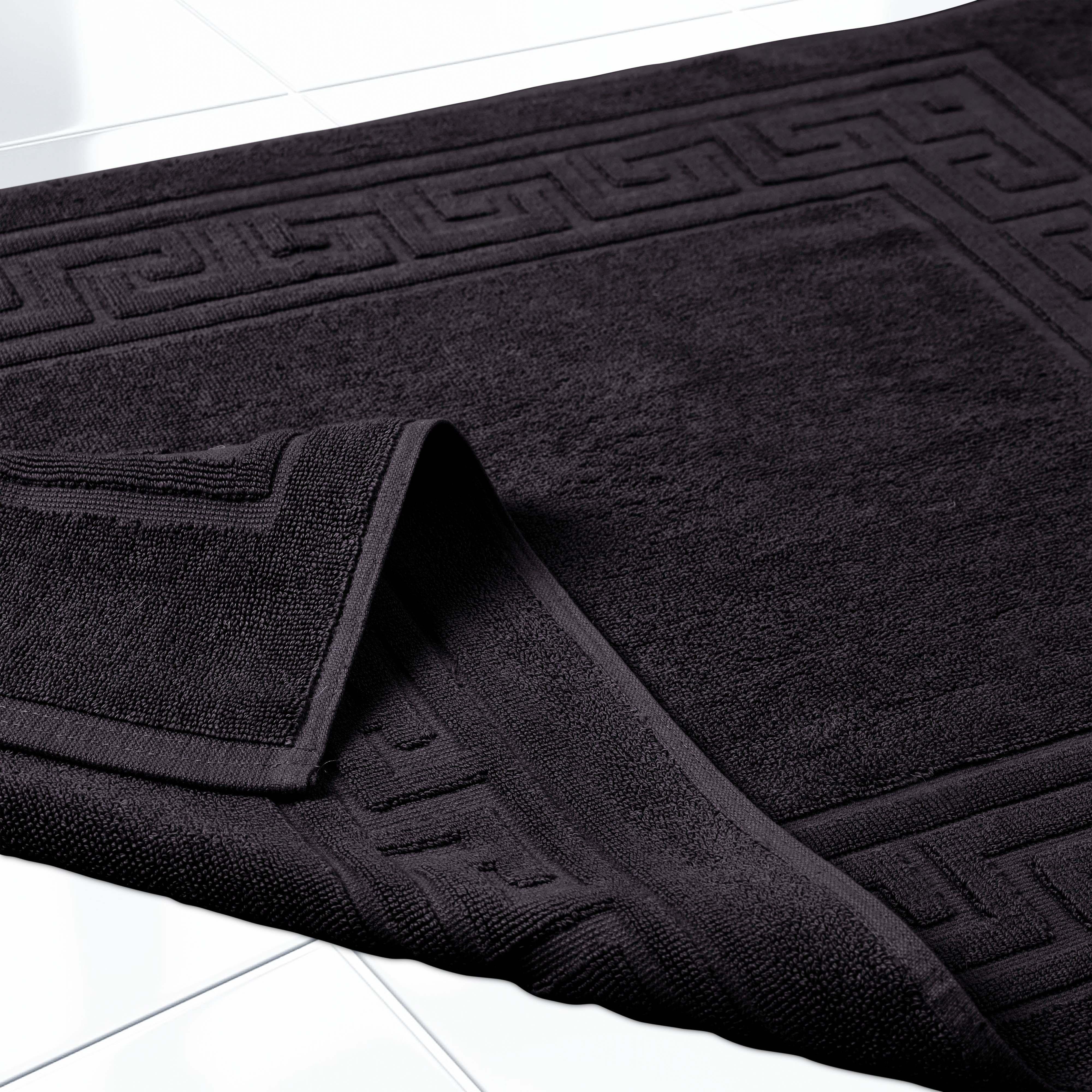 Elevate the look of your bathroom or powder room with the Egyptian Cotton Greek Key Border 2 Piece Bath Mat Set. Crafted from durable Egyptian cotton, our most opulent bath mats feel extremely plush underfoot. This machine washable set features a woven terry surface on both sides giving it enhanced comfort and absorbency. Perfect for everyday use, enjoy cloud-like comfort every time you step out of your shower or bath. Showcasing a traditional Greek key border, add classic elegance to your bathroom style with this luxurious set. This bath mat set is also OEKO-TEX certified, meaning it does not contain any harmful substances or chemicals, ensuring quality, comfort, and wellness.