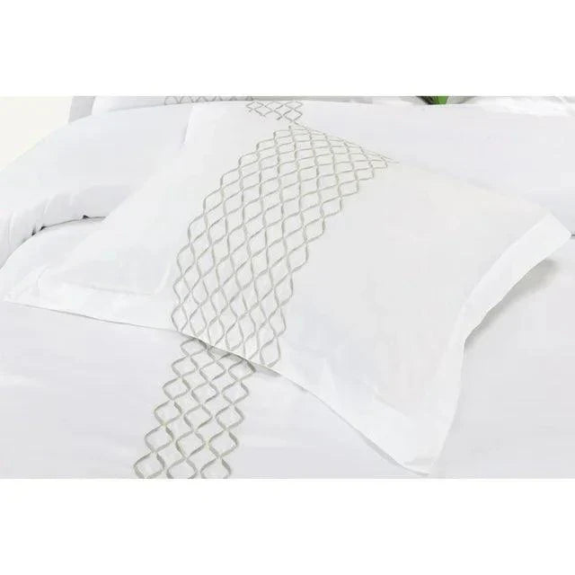 Chic and sophisticated, the Hanna Embroidered Wrinkle Resistant Duvet Cover Set brings luxury and tranquility to your room. The premium quality construction boasts ultra-soft microfiber that's breathable and oh-so-comfy. Embroidered diamond details and lustrous silver thread provide added luxe to the room. The Hanna duvet cover's hidden clear button closure keeps it secure and provides a seamless look. The fabric resists pilling even after multiple washes and gets softer. It folds flat for easy storage and is a cinch to maintain. Your choice of available sizes ensures a perfect fit in your home.