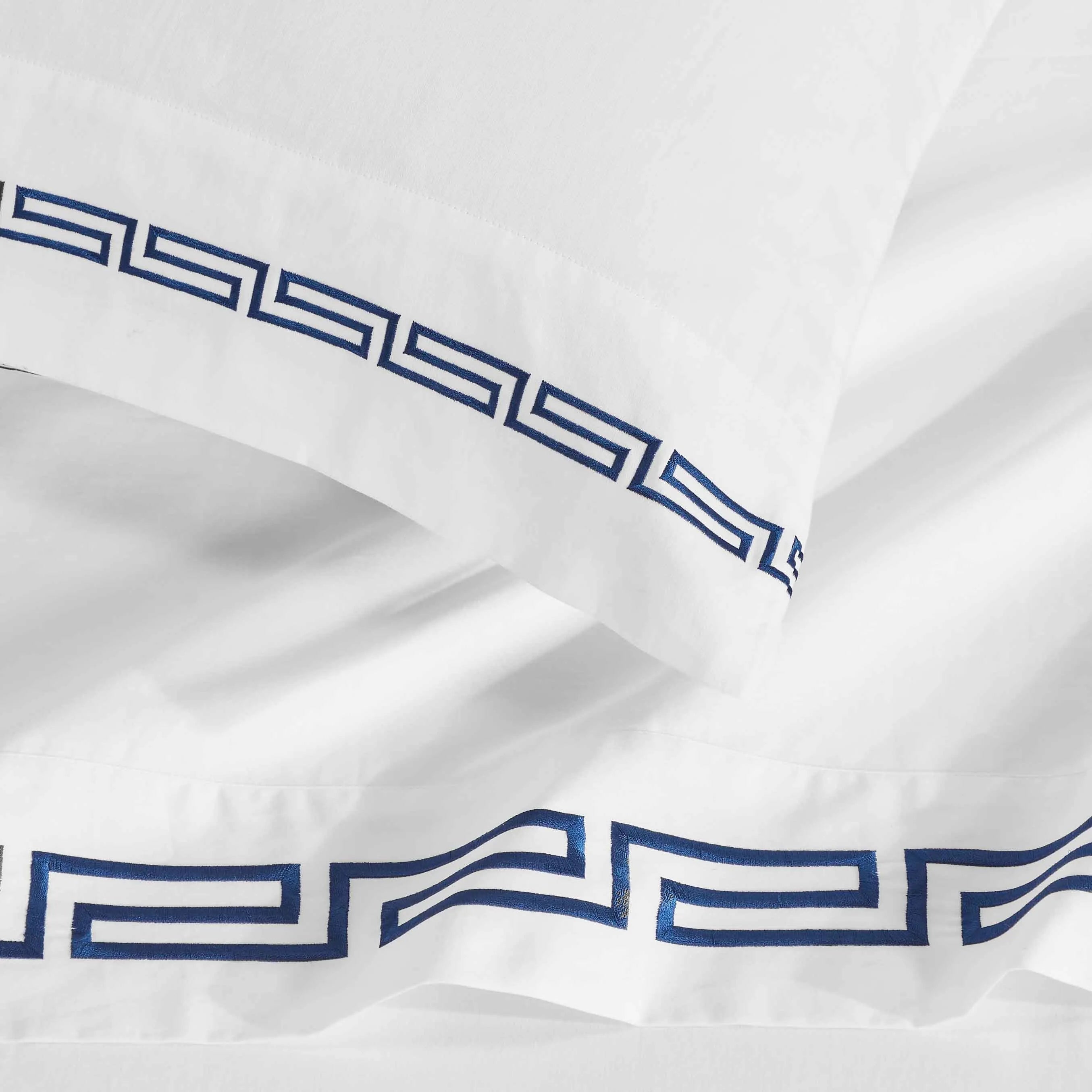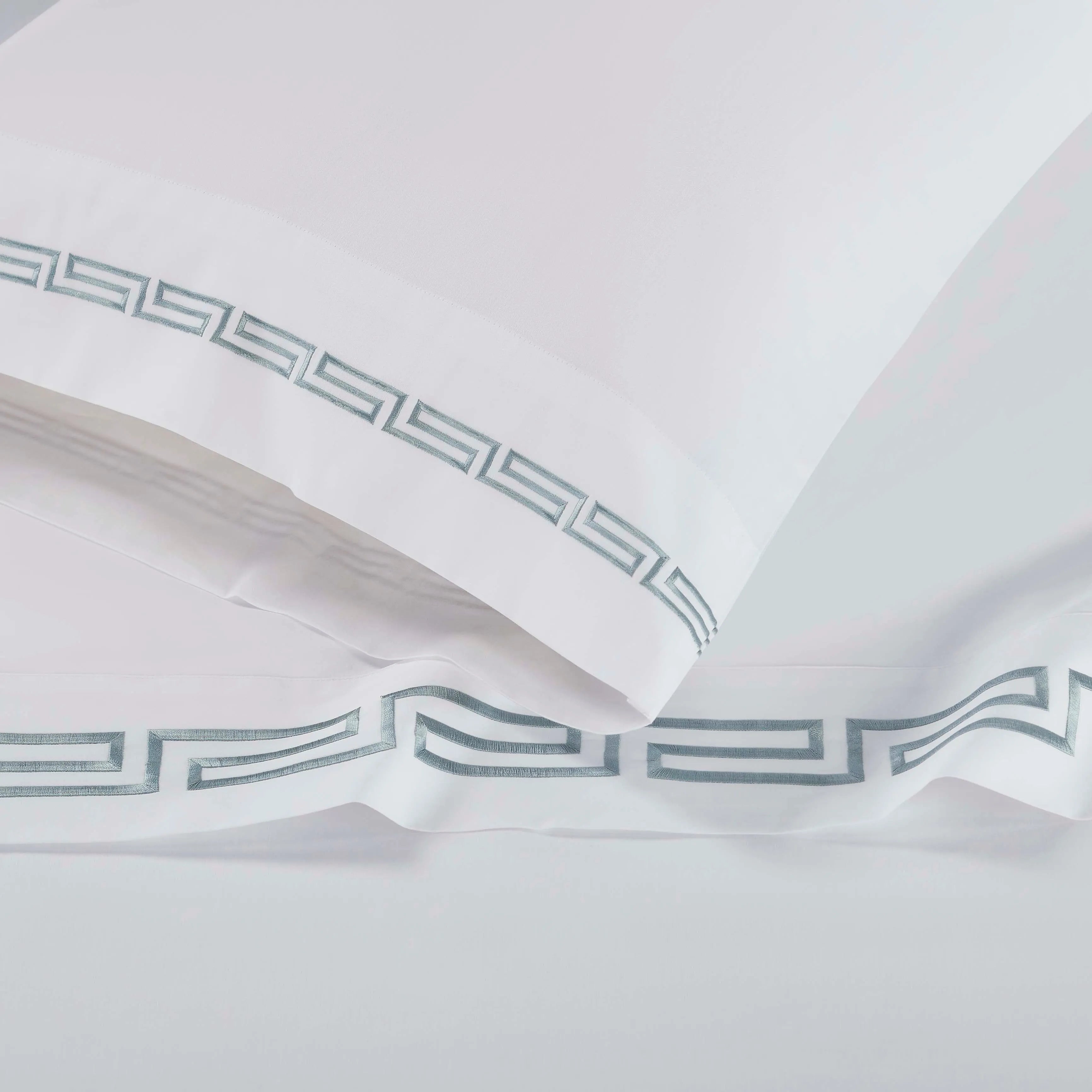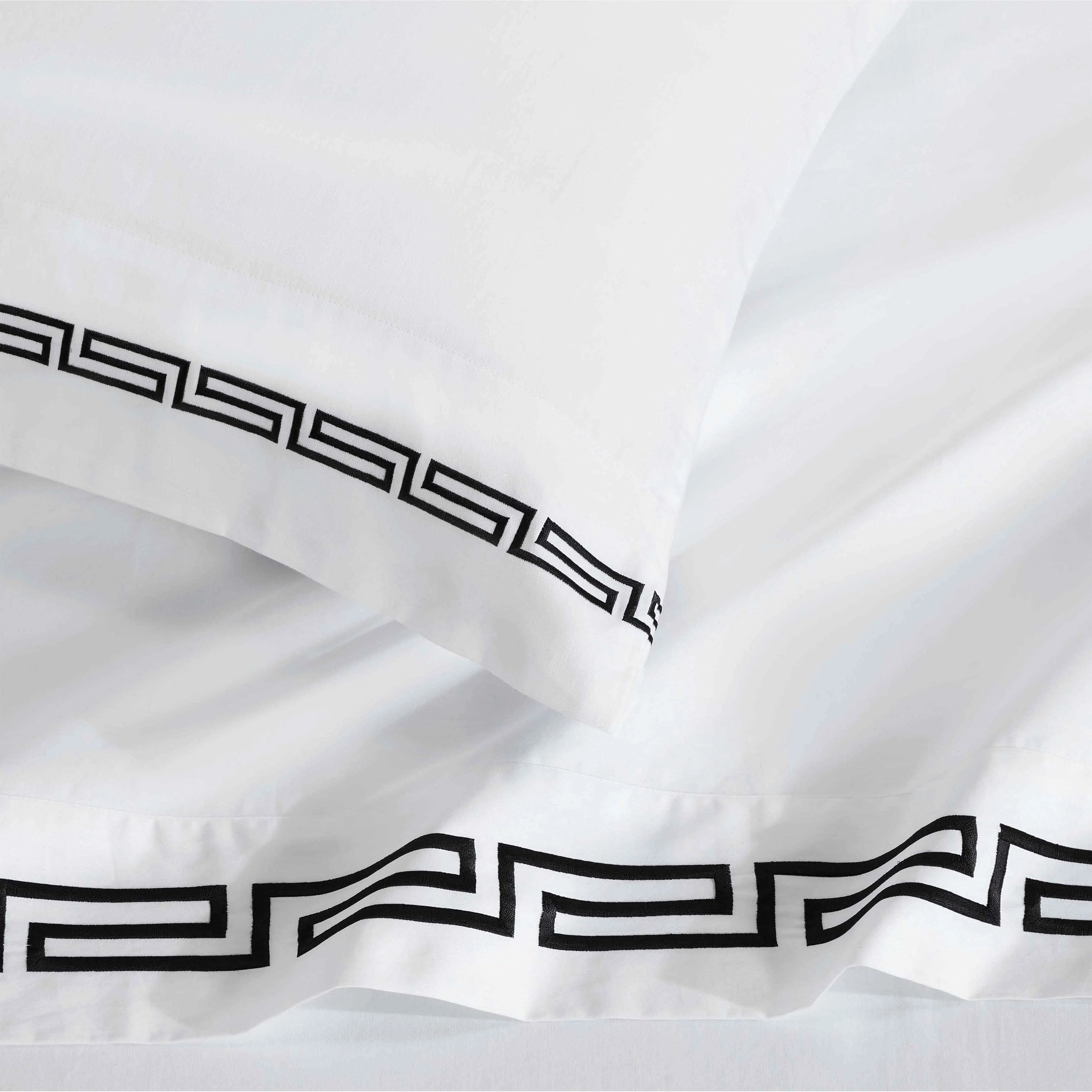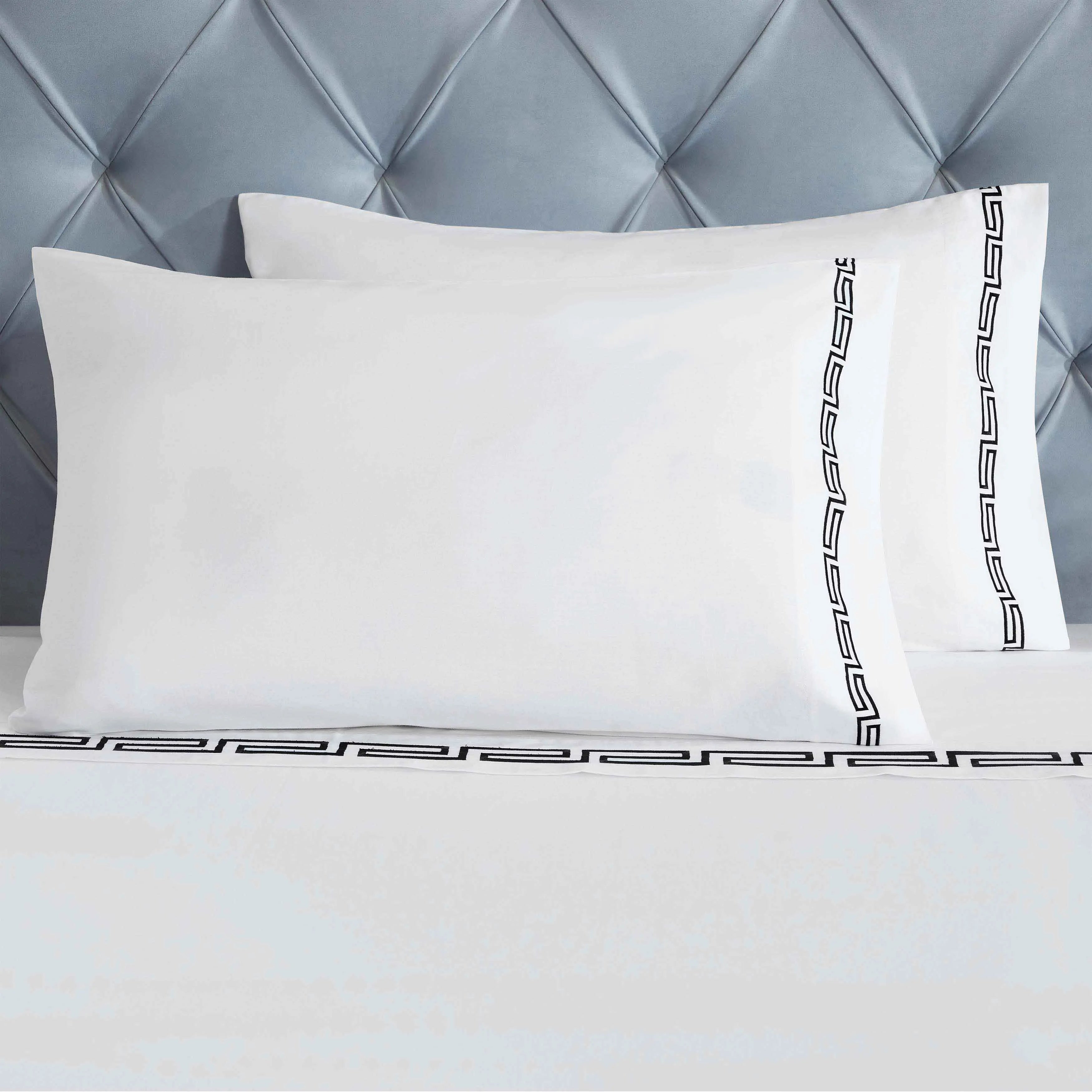 Featuring a modern Greek Key embroidery design and a subtle shimmer from the sateen weave, this sheet set creates a luxurious atmosphere perfect for any bedroom style.