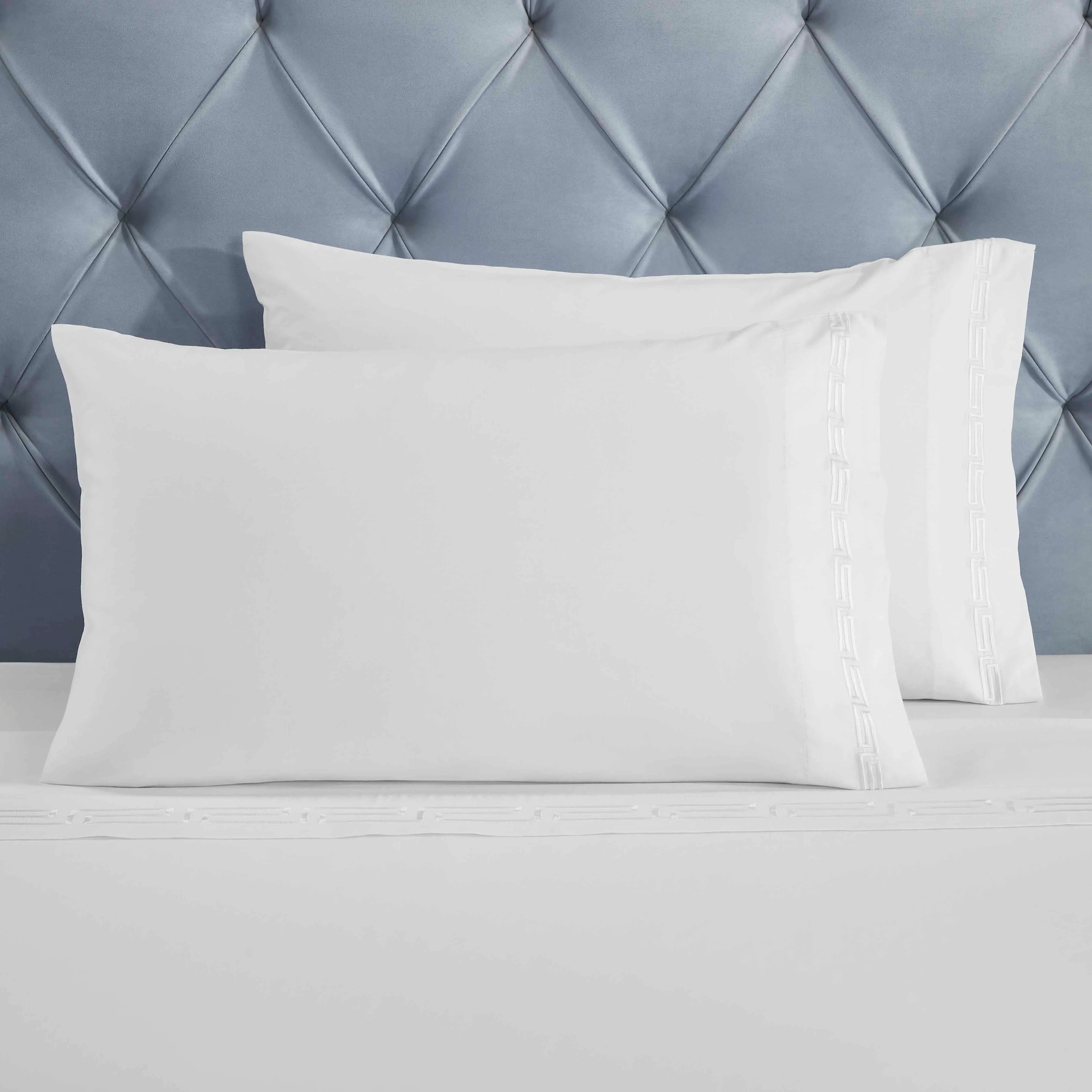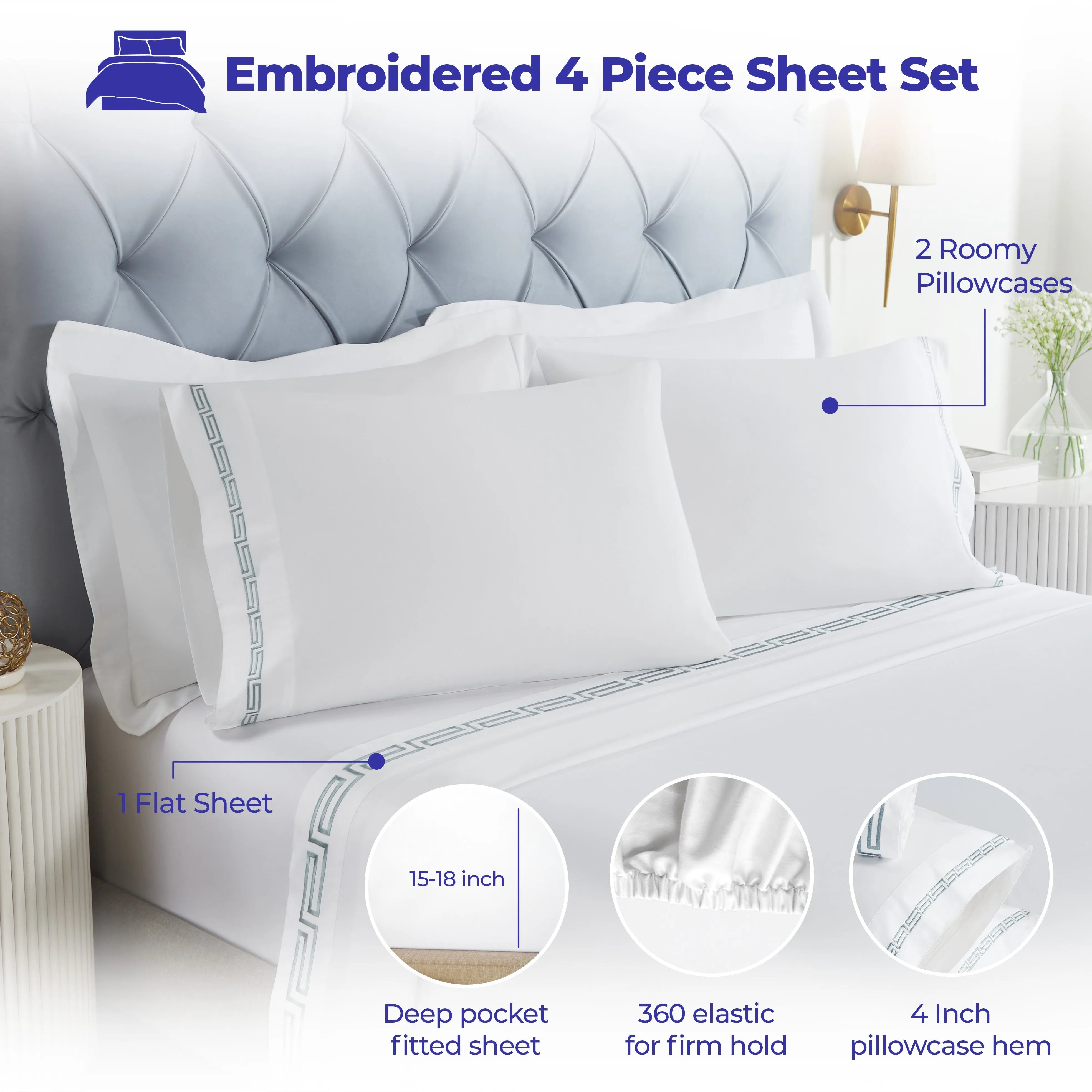 Transform your bedroom with the timeless sophistication of the 100% Cotton Bed Sheet Set Greek Key Embroidered Deep Pocket Harrison, crafted from naturally soft cotton for breathability and durability.