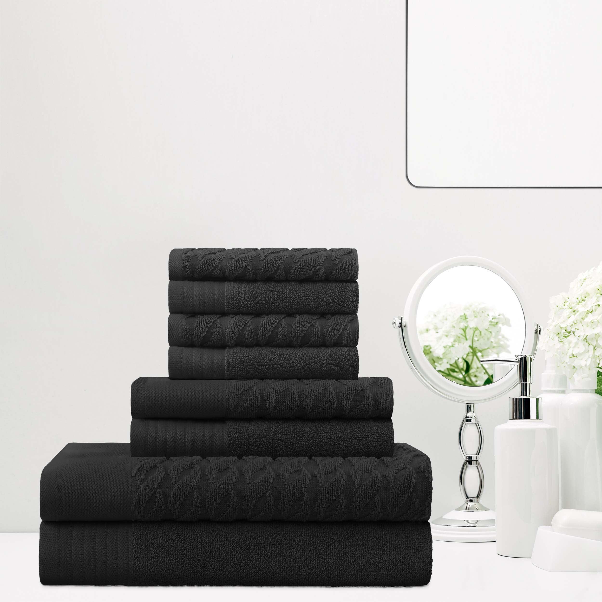 The Premium Turkish Cotton Jacquard Herringbone and Solid 8-Piece Towel Set bring the luxury of the spa to your own home. Each cozy bundle includes 2 bath towels, 2 hand towels, and 4 face towels with a jacquard weave for extra texture and comfort. It also includes a built-in loop so you can hang your towel for fast drying after a hot bath or shower. These towels are expertly crafted from premium Turkish Cotton fibers with a single-ply terry loop construction which makes them lightweight, durable, plush, and ultra-absorbent. They wick moisture from your skin and get you warm and dry fast. The towel set includes 2 unique designs, solid and sculpted for added texture and elegance. Bring a festive accent to your master or guest bathroom with this bundle which provides style and long-lasting comfort.