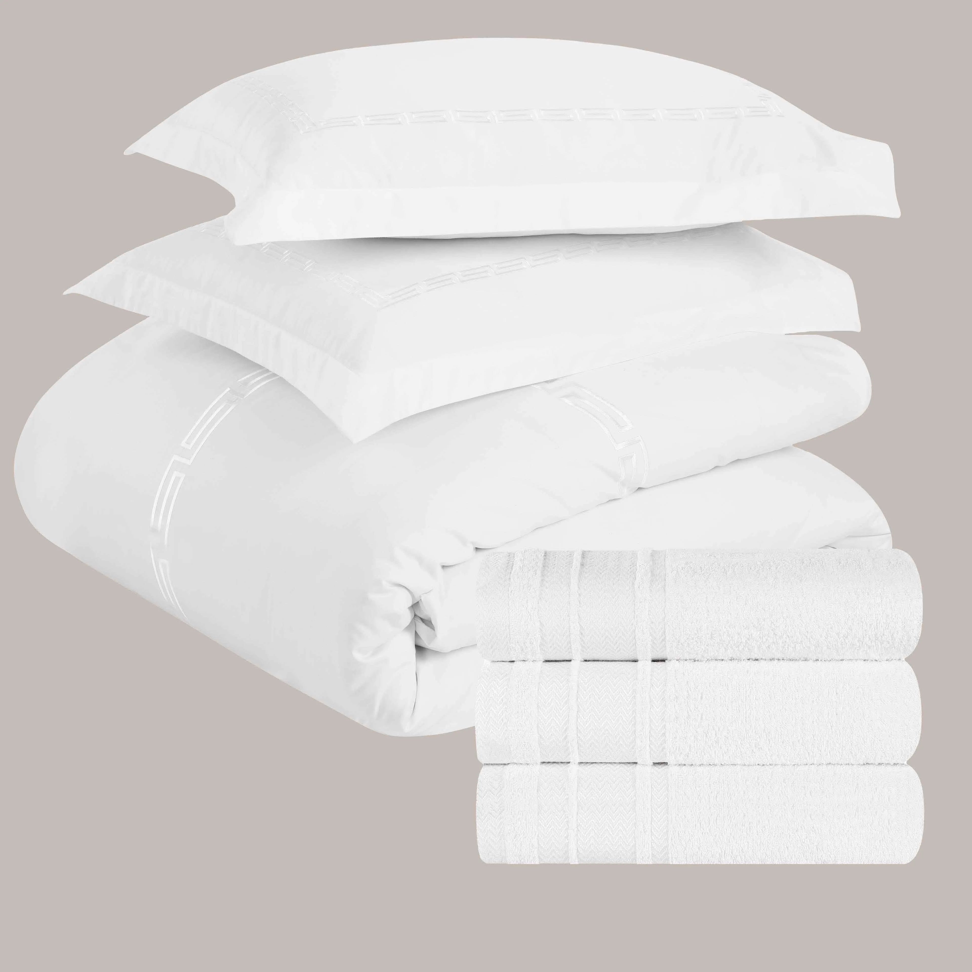 Transform your bedroom into a sanctuary of refined elegance with our Luxury Embroidered Duvet Cover Bed & Bath Bundle. This exquisite 6-piece set combines the artistry of your chosen embroidered duvet cover design—Riverton's cross-stitch, Harrison's Greek key, Chain Links, Fieldstone's two-line, or Moonlawn's dreamy elegance—with the unparalleled comfort of our soft bath towels. Each element, from the soft, sateen-finished duvet cover to the highly-absorbent, dobby-bordered towels, has been meticulously crafted to provide a cohesive and indulgent experience, elevating your daily rituals to moments of pure, luxurious relaxation.