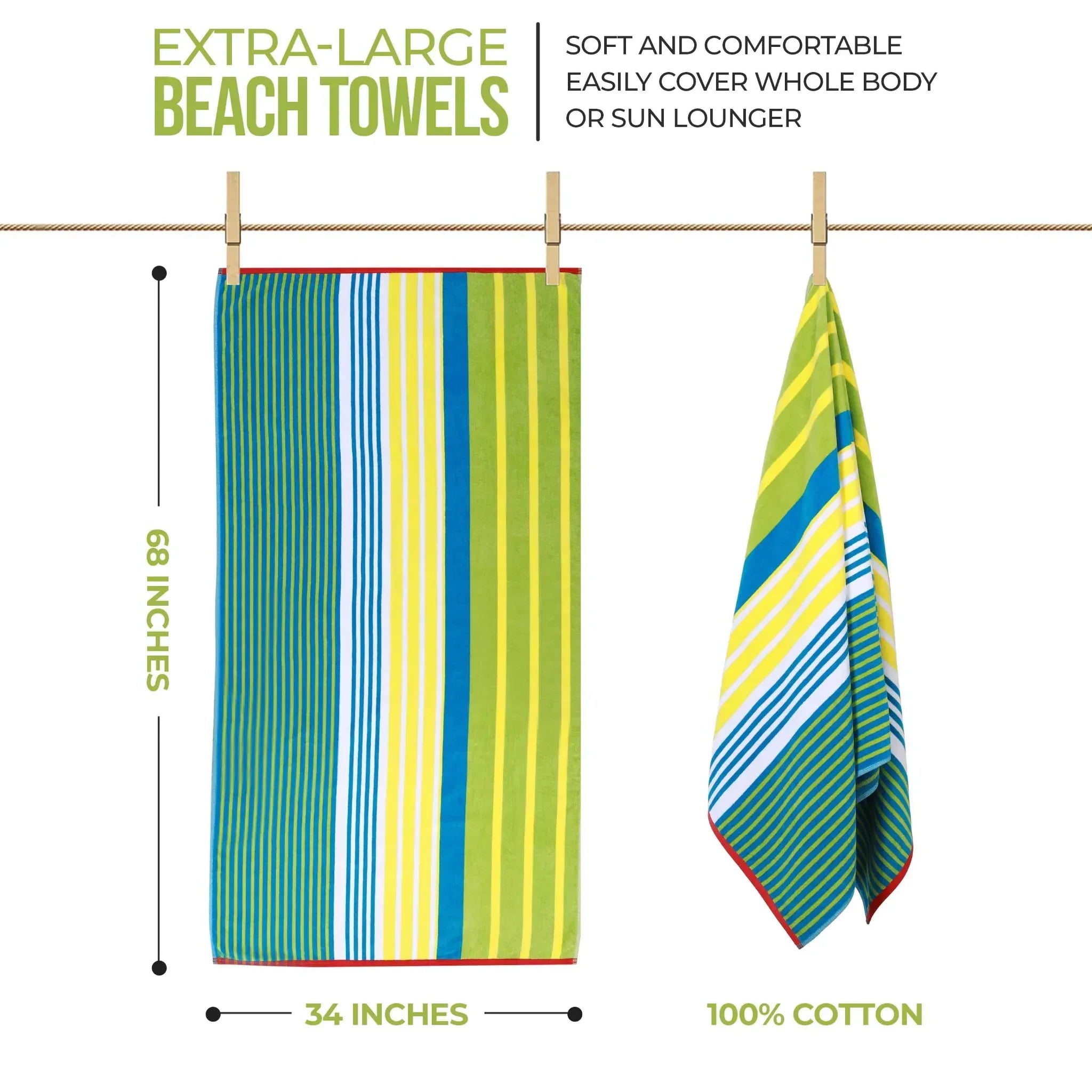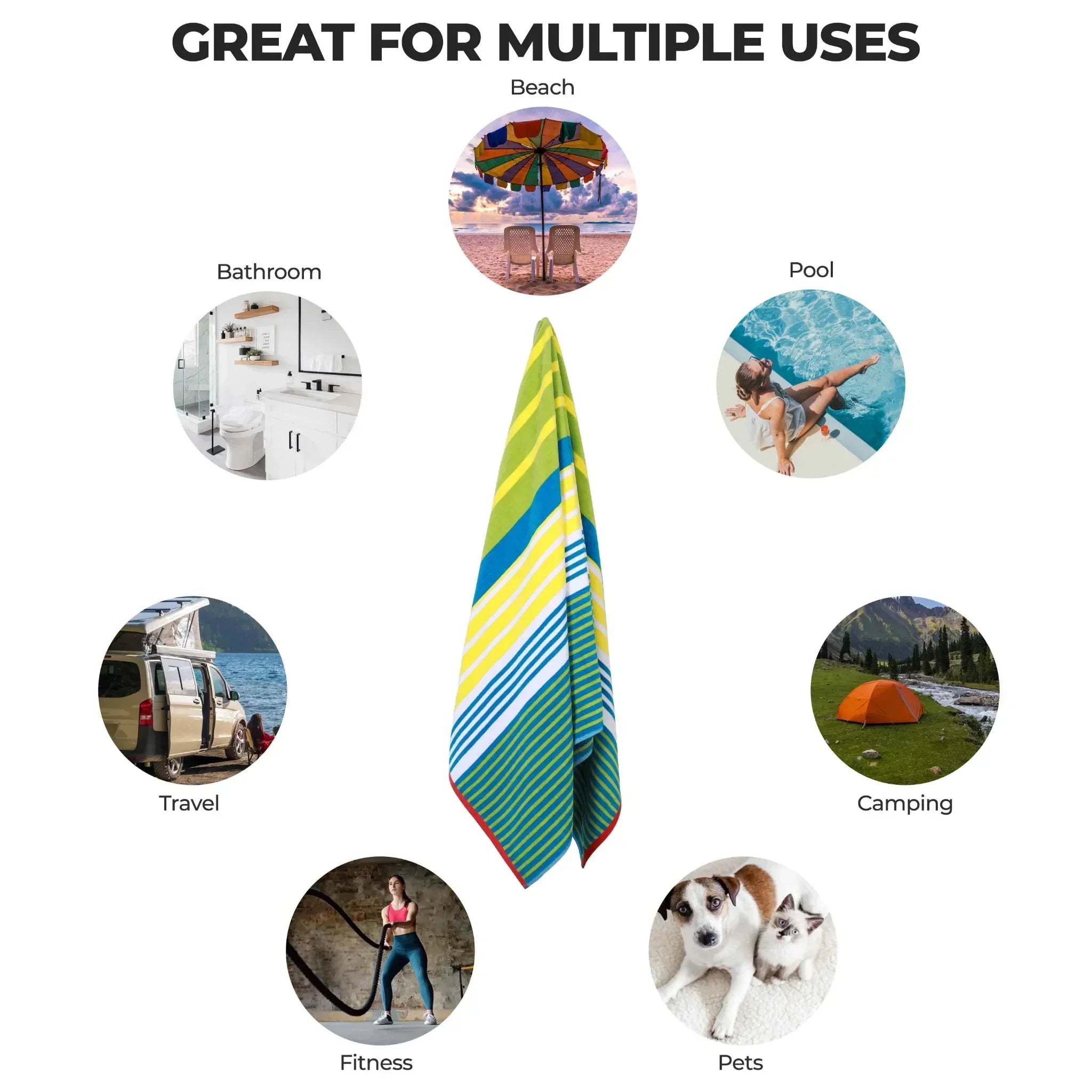 Featuring a modern twist on the classic striped design, these beach towels are available in yellow/ green and blue/ navy color options to match your beach accessories. Ideal for travel, you can carry this towel to the beach, keep it poolside, or decorate your bathroom in style. Durable and ultra-soft, these beach towels will keep you warm and comfortable wherever your adventures take you.