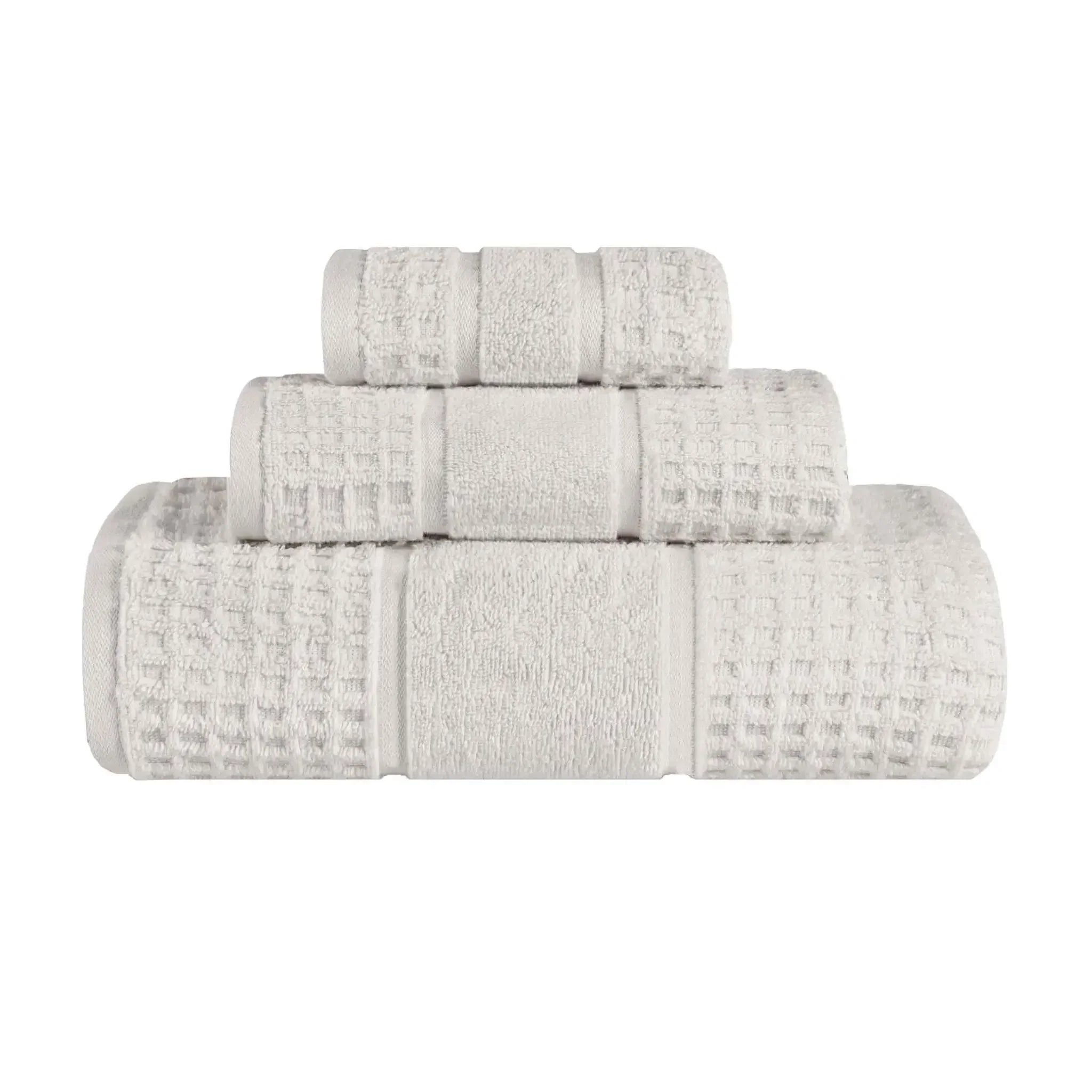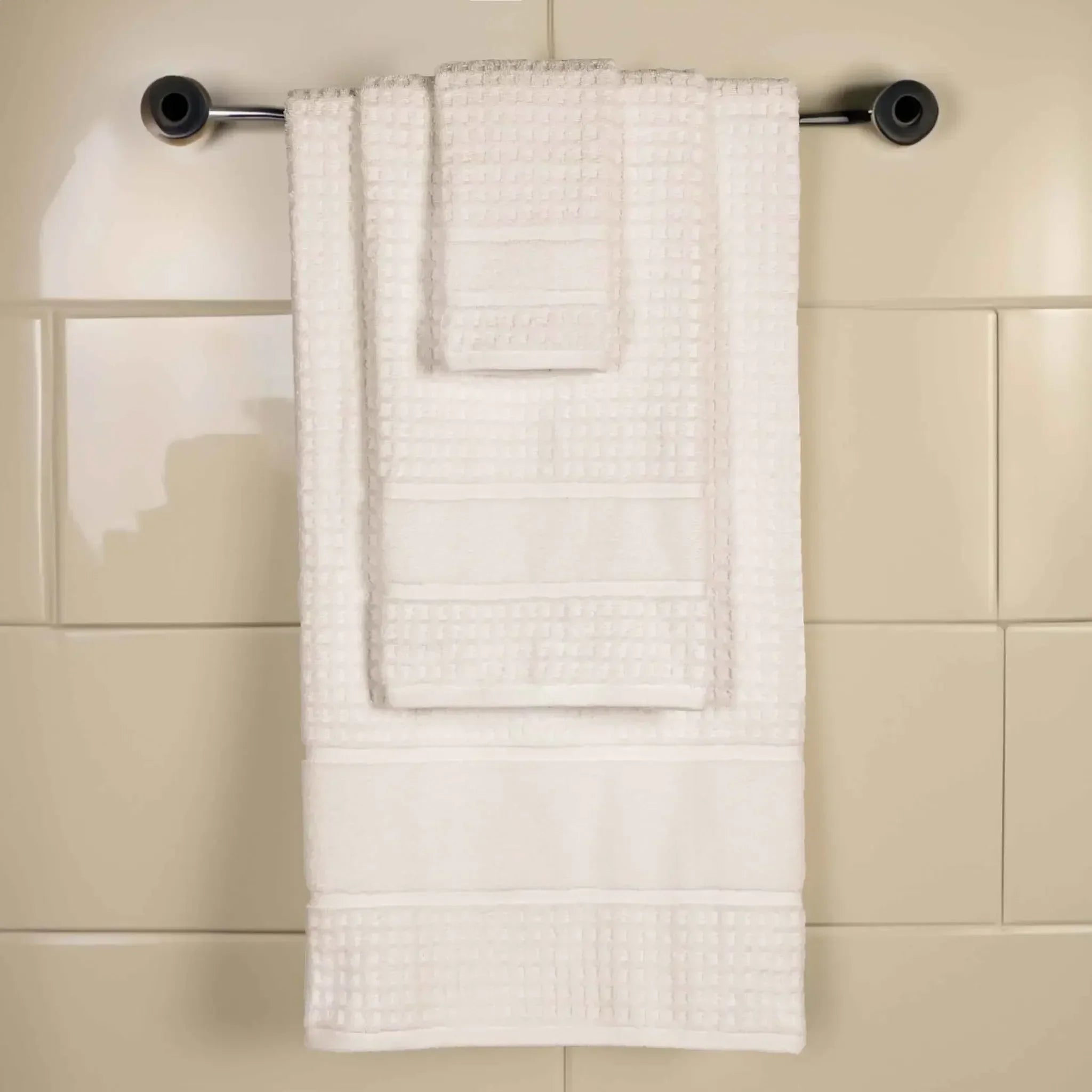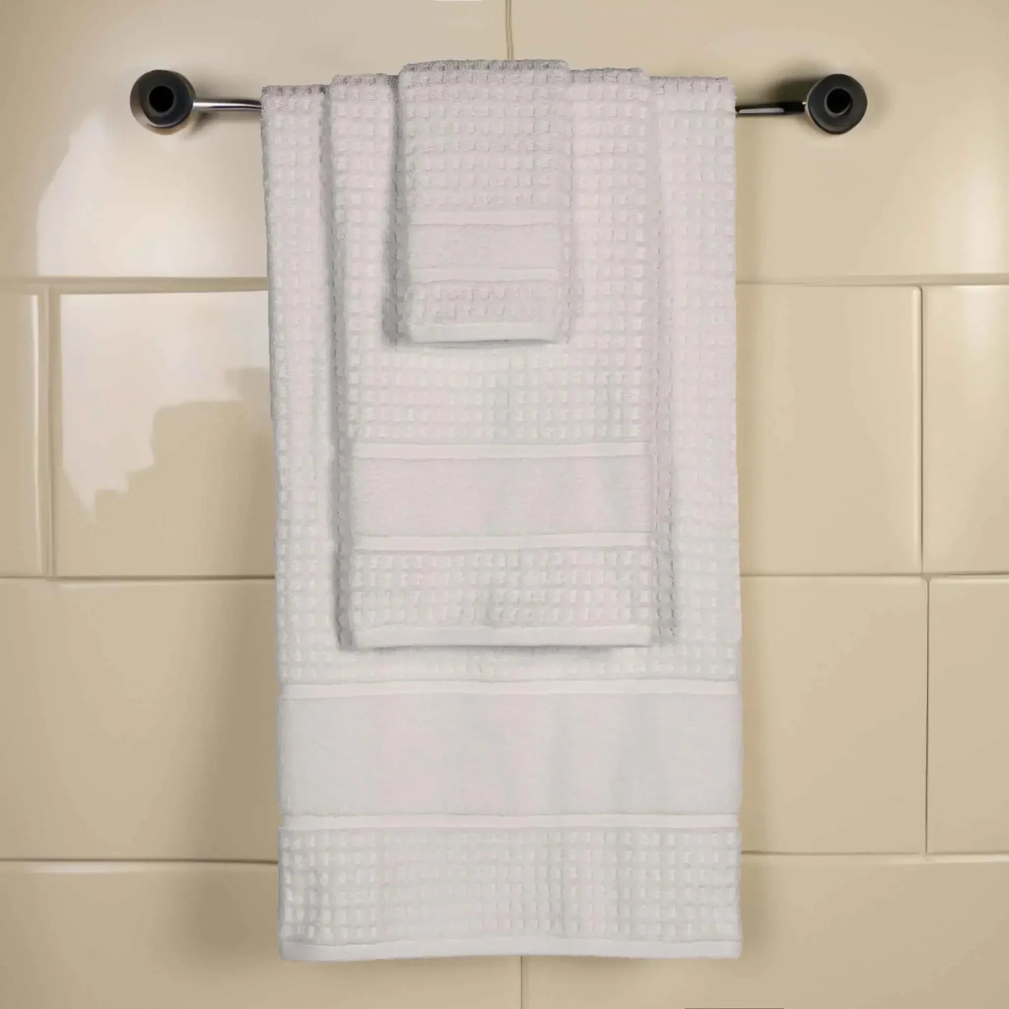 Elevate your bathroom to new heights with our Napa 3 Piece Towel Set. These naturally soft cotton towels are crafted with a zero twist technique for a more absorbent and luxurious quality towel. Displaying a textured waffle honeycomb border, bring unique style to you guest or master bathroom with this set of bathroom essentials. Each towel is finished with secure hemmed edges to avoid fraying and a durable single-ply to withstand countless washes. Featuring a hanging loop on each piece, enjoy both convenience and comfort with this versatile set.
