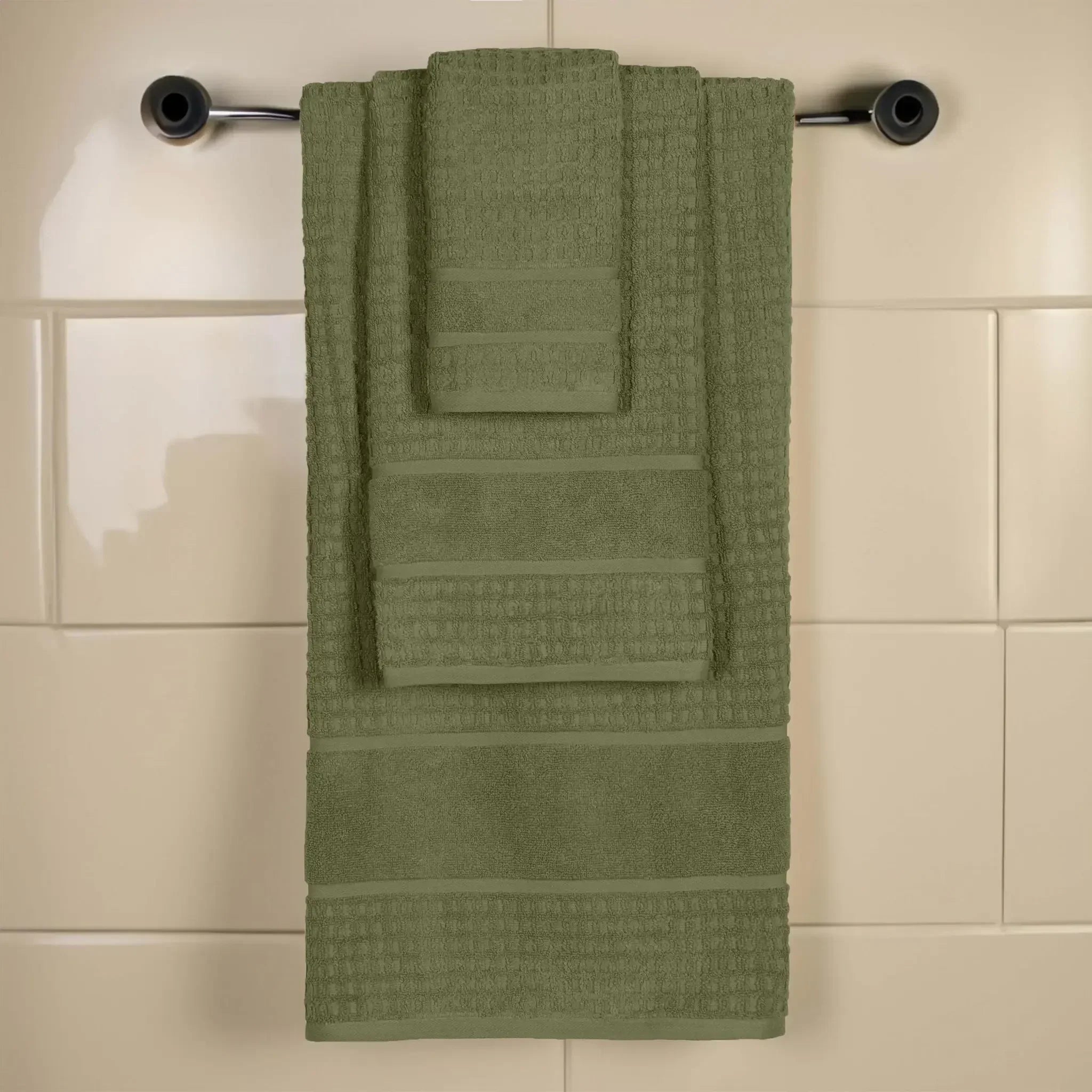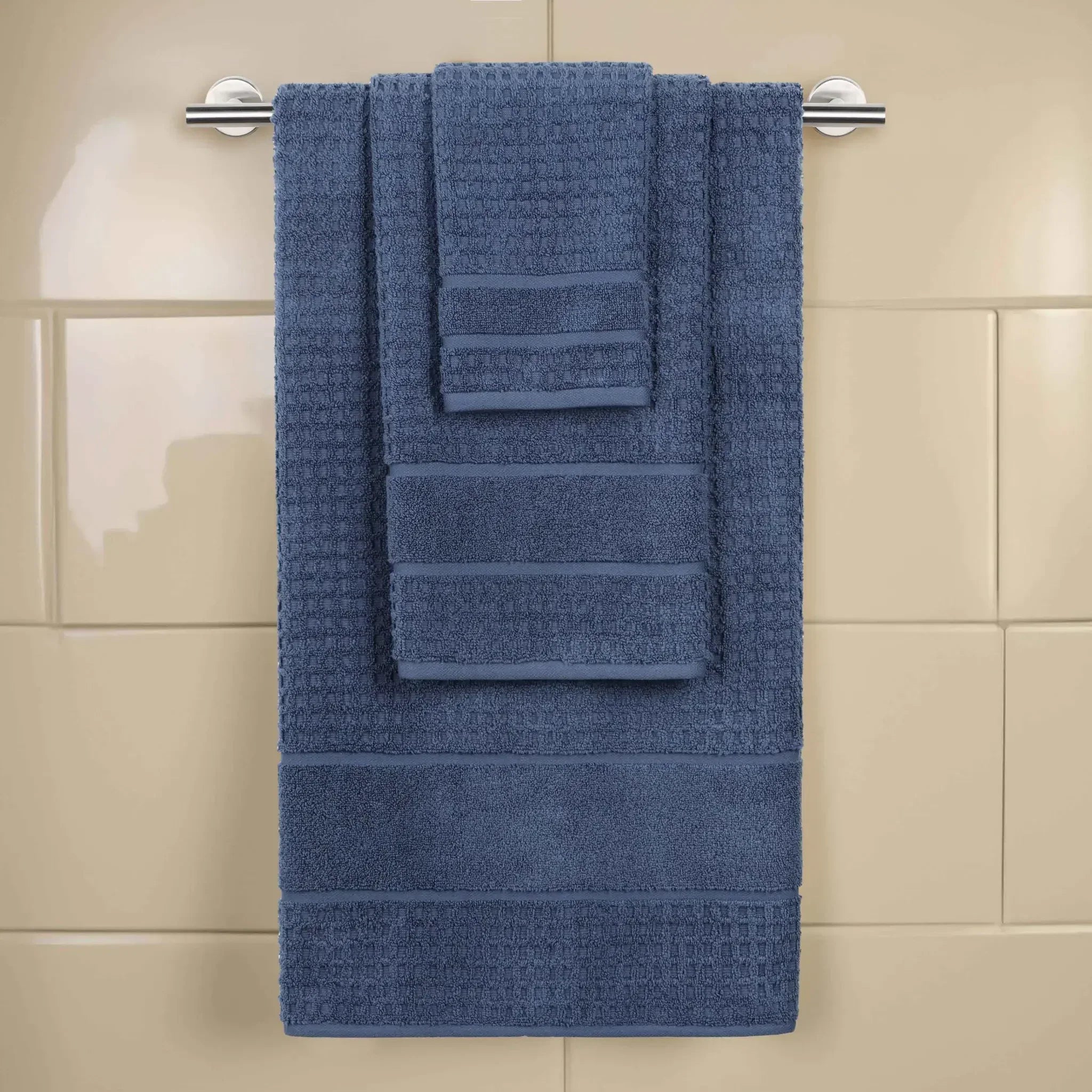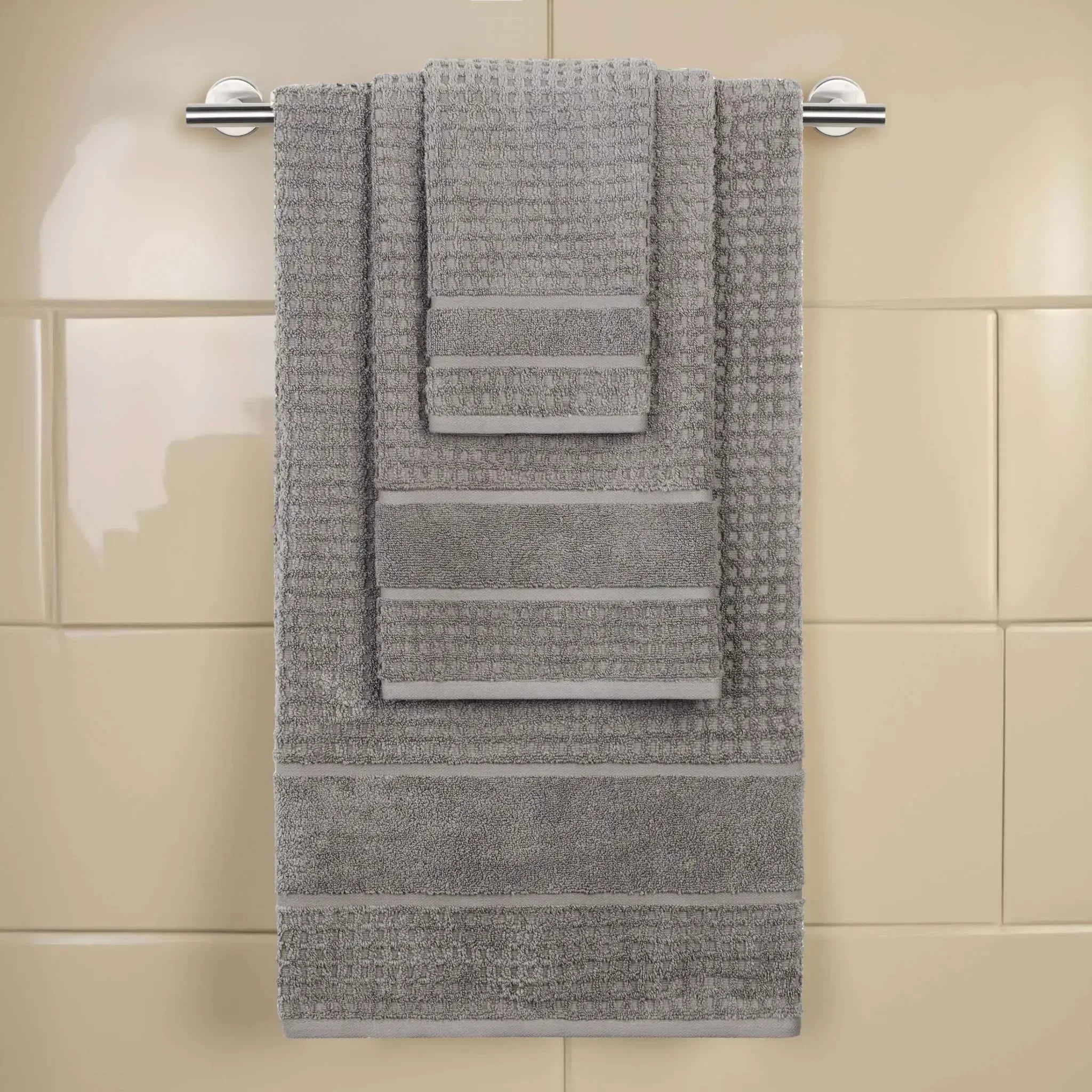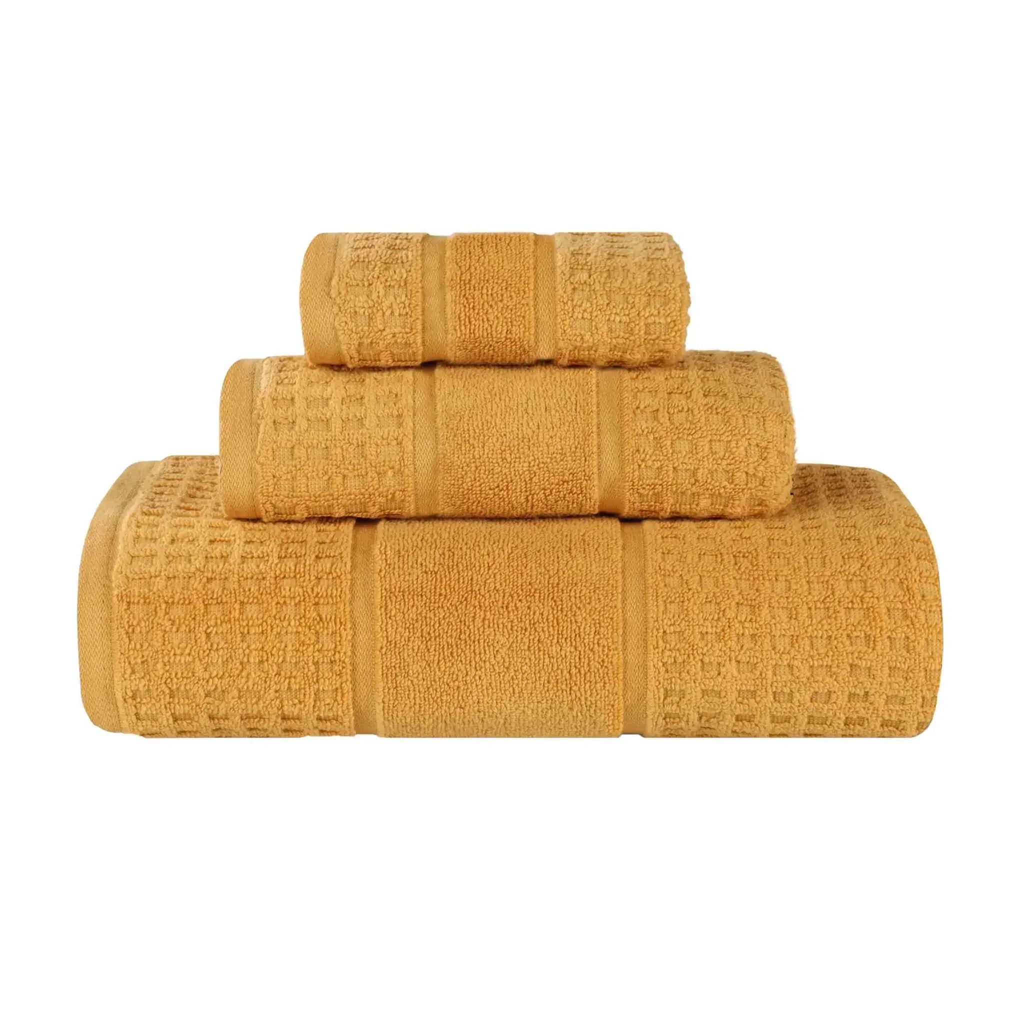 Elevate your bathroom to new heights with our Napa 3 Piece Towel Set. These naturally soft cotton towels are crafted with a zero twist technique for a more absorbent and luxurious quality towel. Displaying a textured waffle honeycomb border, bring unique style to you guest or master bathroom with this set of bathroom essentials. Each towel is finished with secure hemmed edges to avoid fraying and a durable single-ply to withstand countless washes. Featuring a hanging loop on each piece, enjoy both convenience and comfort with this versatile set.