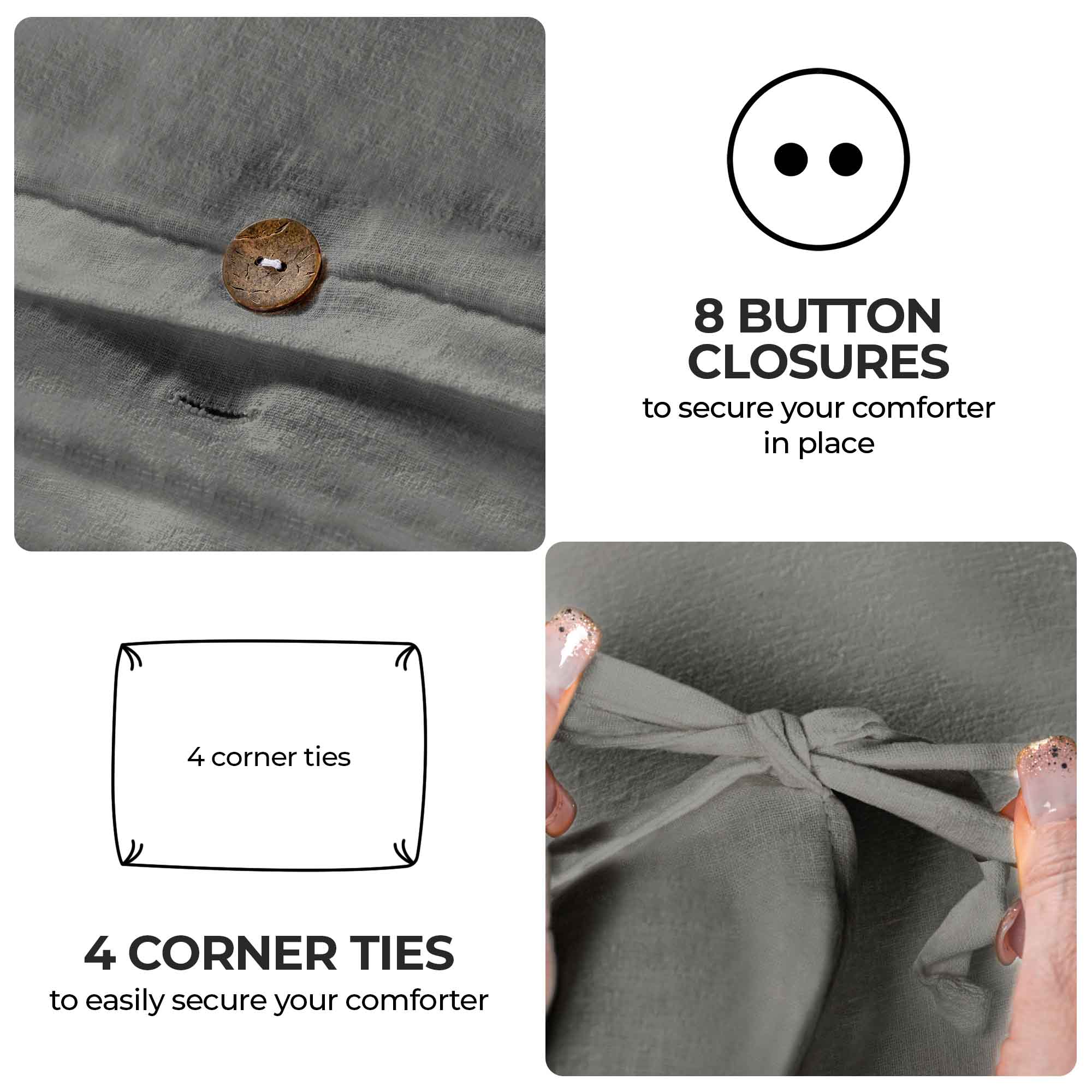 Trendy, visible rustic buttons secure your insert (7 on Full/Queen and 9 on King/Cal King), while pillow shams with 2-inch flanges and envelope closures complete the cohesive look. Ideal for modern, bohemian, rustic, or minimalist decor, this eco-friendly blend is perfect for all seasons.