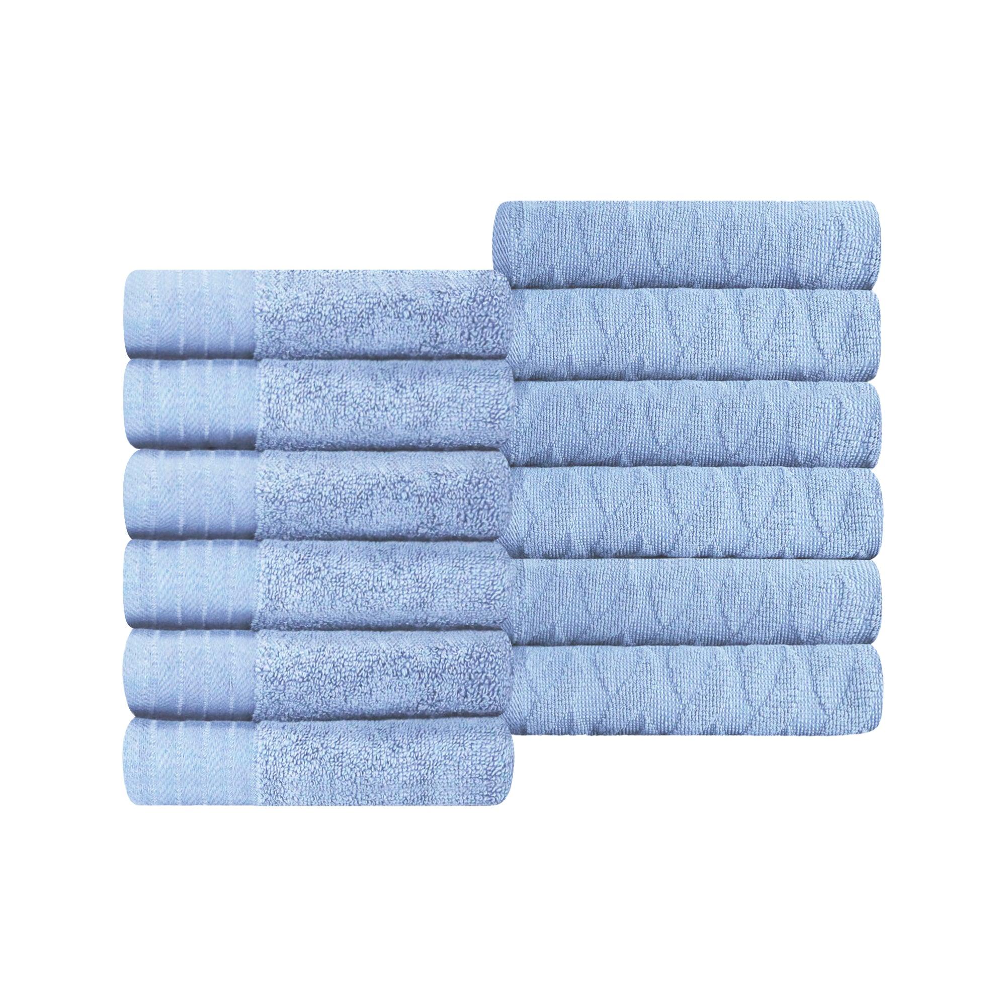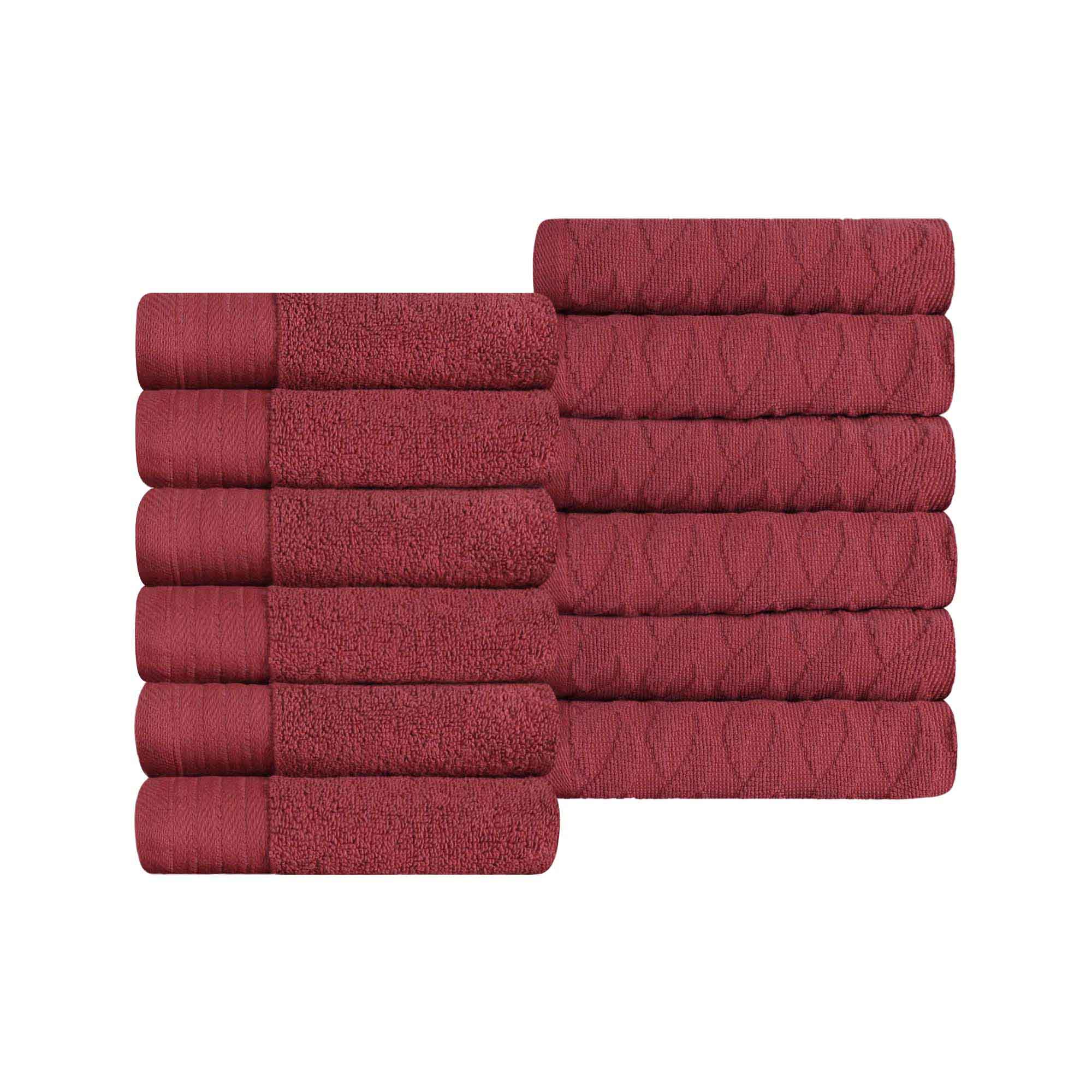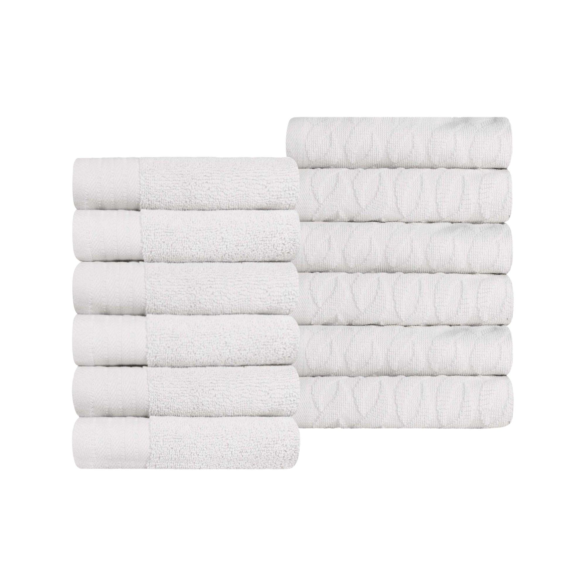 The Premium Turkish Cotton Jacquard Herringbone and Solid 12-Piece Face Towel/ Washcloth Set brings the luxury of the spa to your own home. Each cozy bundle includes 12 face towels/ washcloths with a jacquard weave for extra texture and comfort. It also includes a built-in loop so you can hang your towel for fast drying after a hot bath or shower. These towels are expertly crafted from premium Turkish Cotton fibers with a single-ply terry loop construction which makes them lightweight, durable, plush, and ultra-absorbent. They wick moisture from your skin and get you warm and dry fast. The towel set includes 2 unique designs, solid and sculpted for added texture and elegance. Bring a festive accent to your master or guest bathroom with this bundle which provides style and long-lasting comfort.