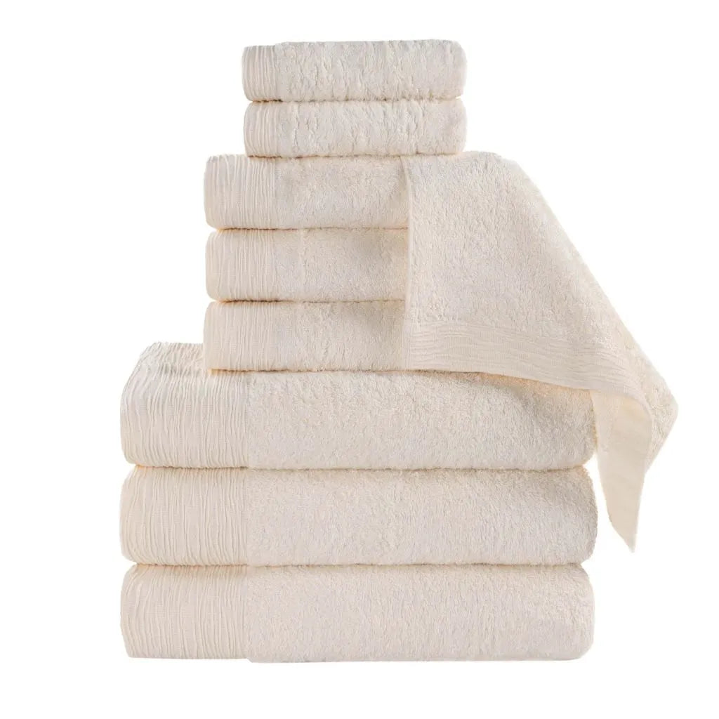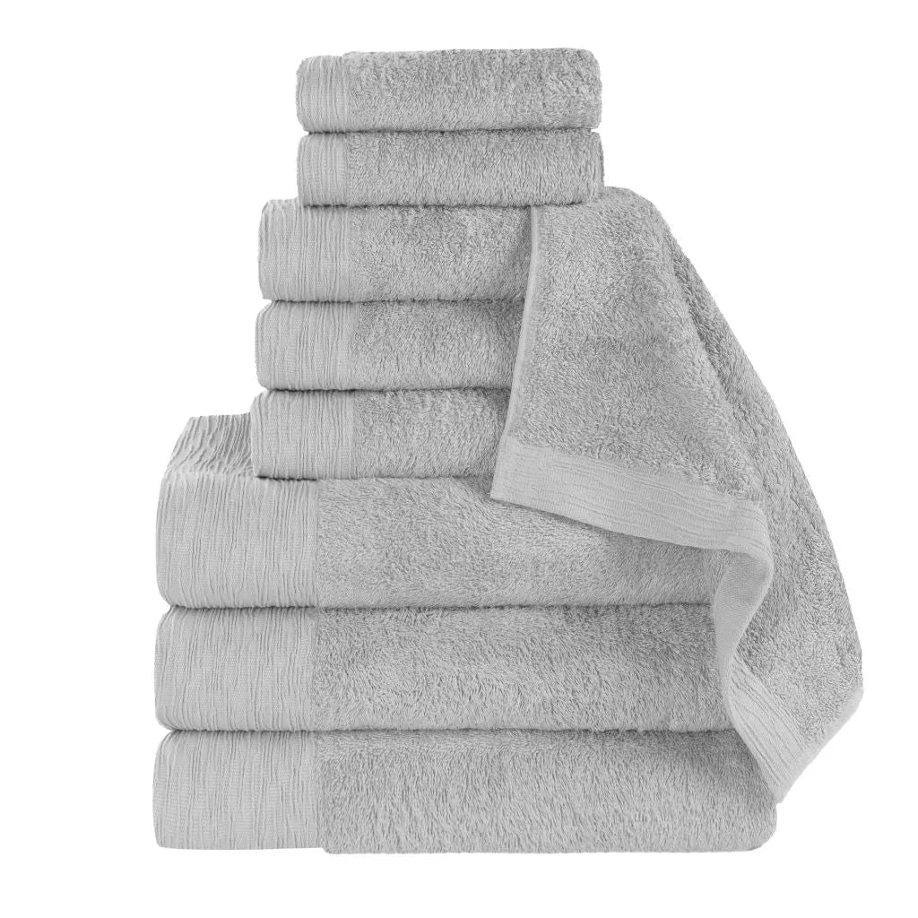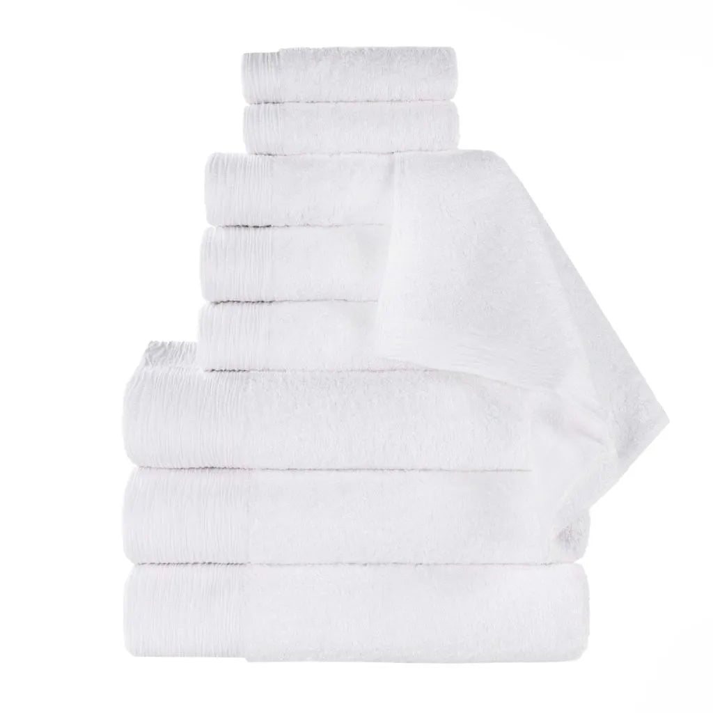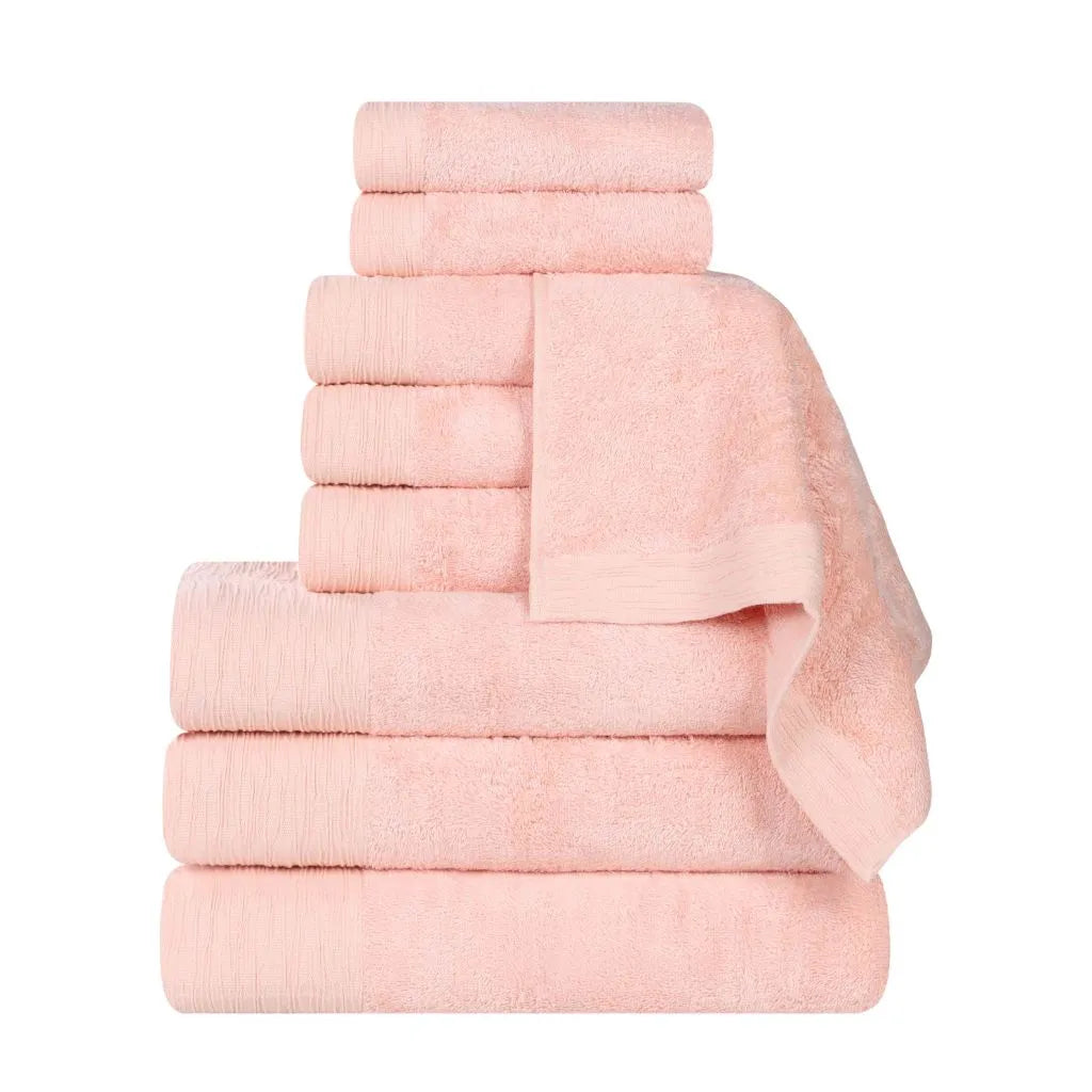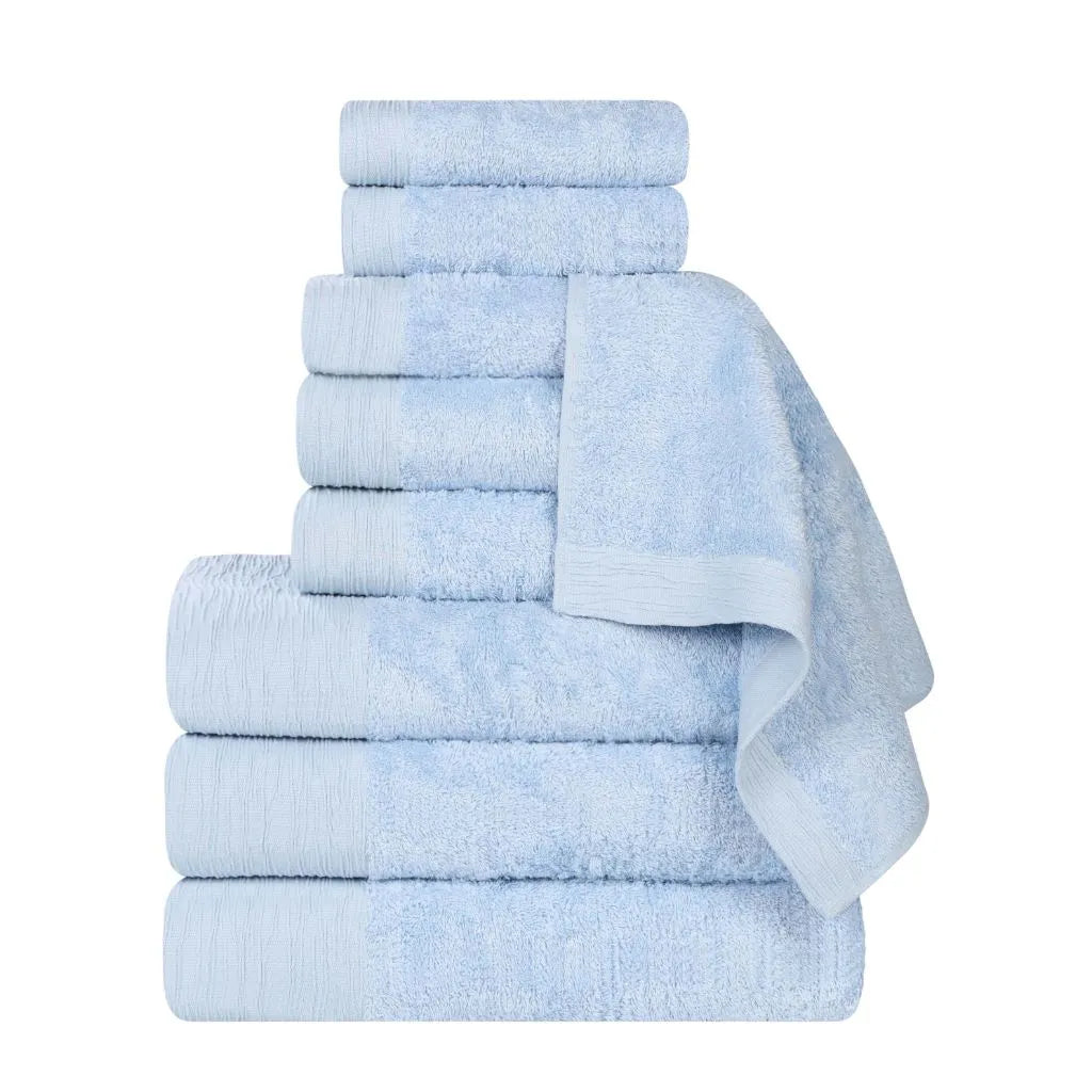 Add a touch of contemporary elegance to your bathroom with the Superior Rayon from Bamboo Eco-Friendly Fluffy Soft Modern Solid 9-Piece Towel Set. This 40% Rayon from Bamboo 60% Cotton towel set is crafted for a soft, absorbent, and luxurious experience. Boasting a classic solid design and wave textured border, bring a unique style to your guest or master bathroom with this bundle. Each towel is finished with secure hemmed edges to avoid fraying and a durable single-ply to withstand countless washes and last you years to come. Featuring a hanging loop on each piece, enjoy both convenience and comfort with this versatile set.