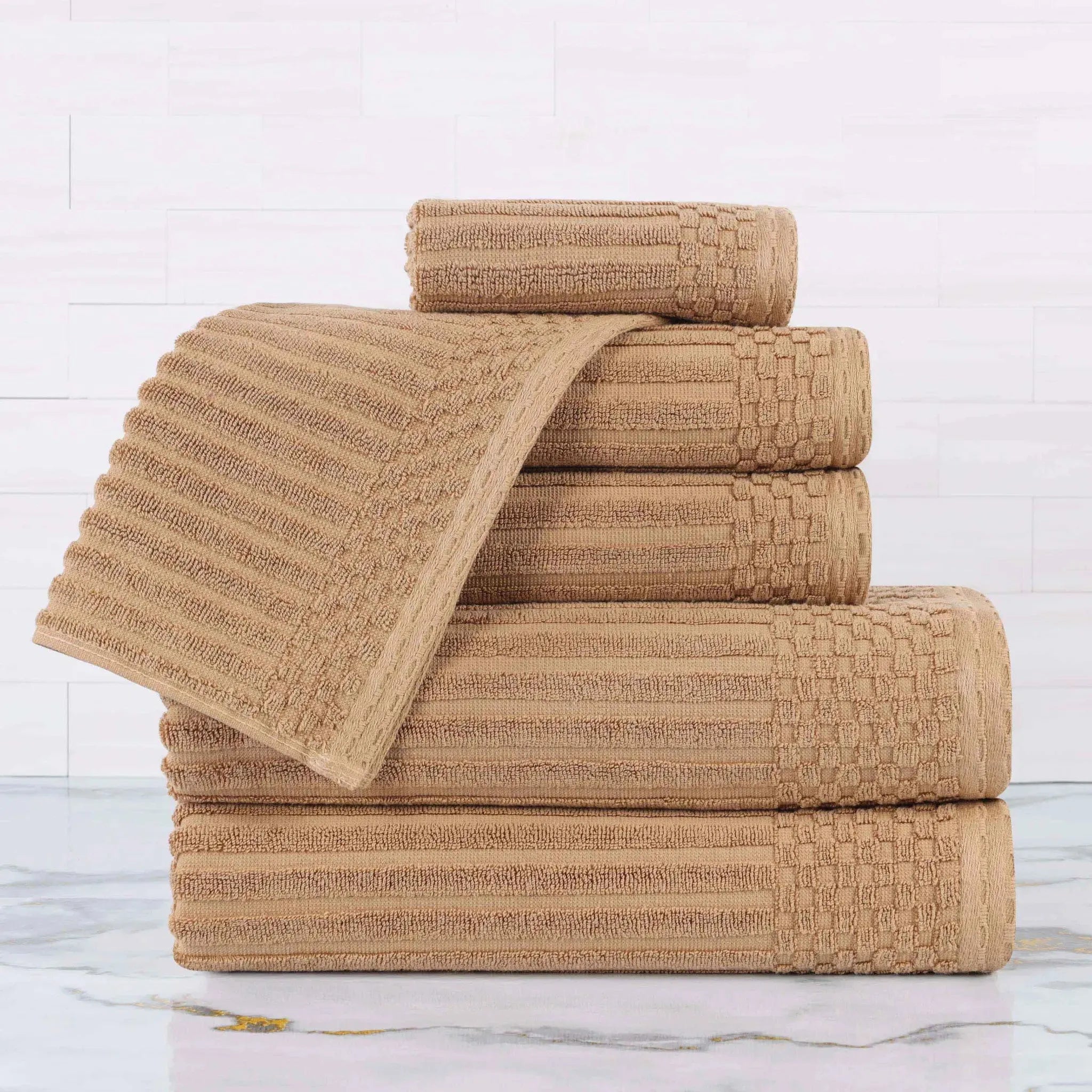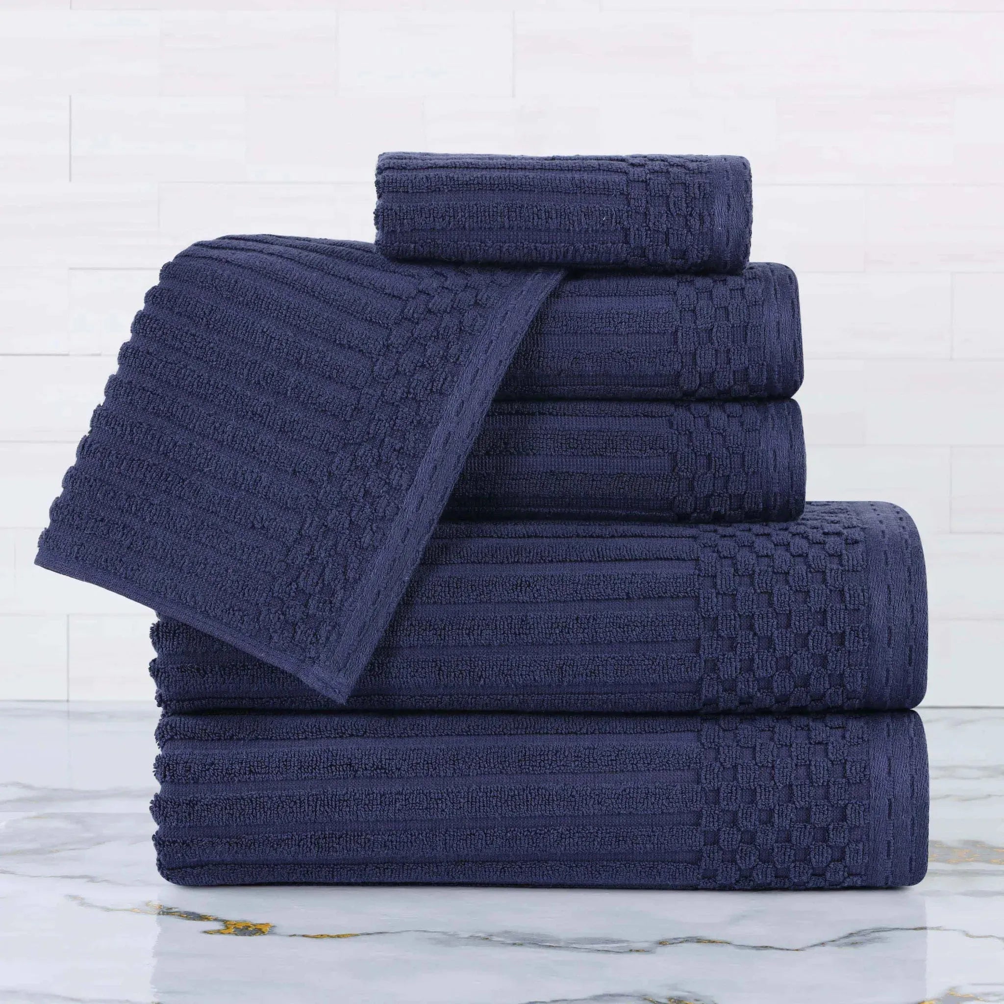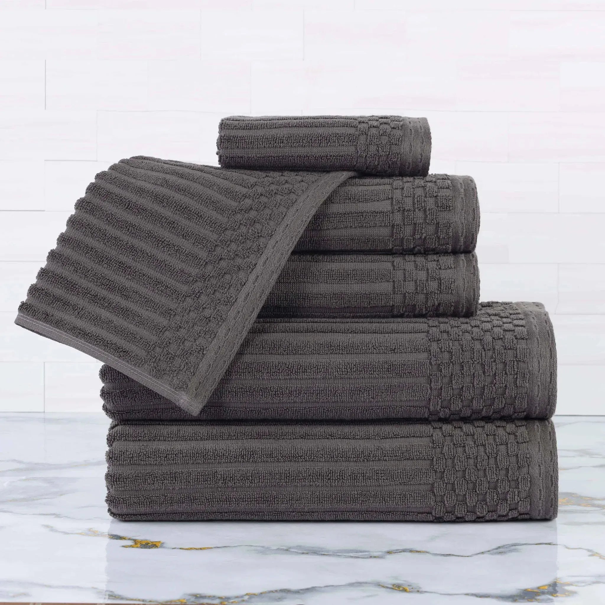 Upgrade your bathroom with our ultra-absorbent Soho ultra-absorbent Soho Living Bath Towels. Crafted from premium cotton, this 6-piece collection features a unique ribbed texture that not only looks elegant but also enhances absorbency and air-drying properties. Designed to provide a quick and efficient drying experience, this is the ideal solution for anyone searching for Soho Living Quick Dry Towels.