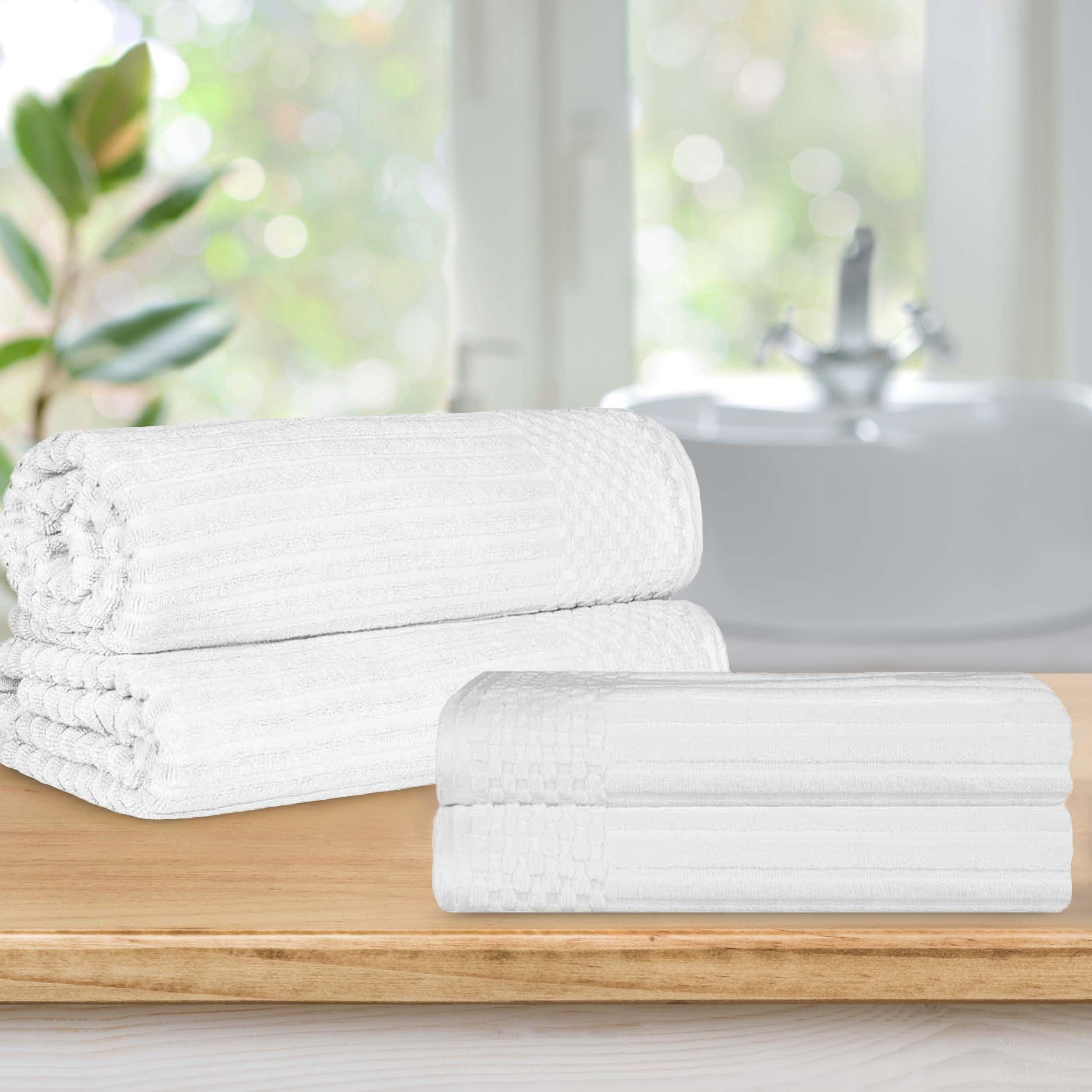 Bring the spa-vibe home with our amazingly soft and oversized Superior Soho Ribbed Textured Cotton Ultra-Absorbent Bath Sheet/ Bath Towel Set. The ribbed texture features a checkered pattern along the border of the towel that will effortlessly make a stylish statement and wow your guests. Each towel is made with a singly-ply construction to ensure that you will get dried quickly and comfortably after each use. The towel is crafted with premium quality Cotton which will withstand many washes. This incredibly soft towel set includes two bath towels and two bath sheets in an assortment of solid colors to match any modern or transitional style.