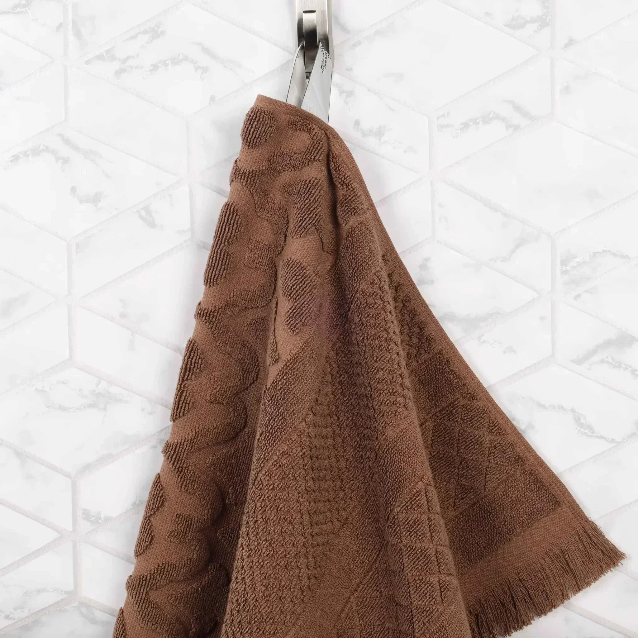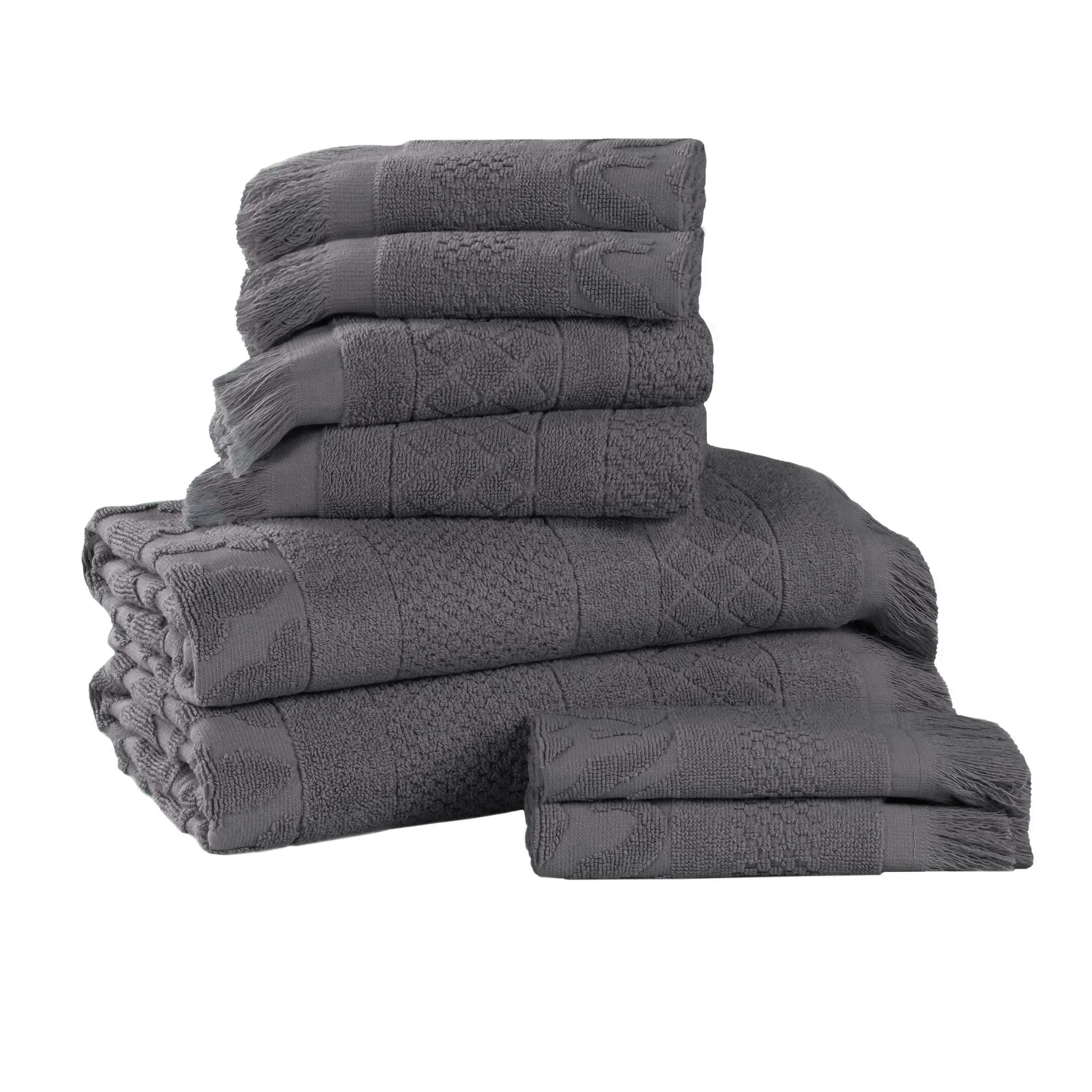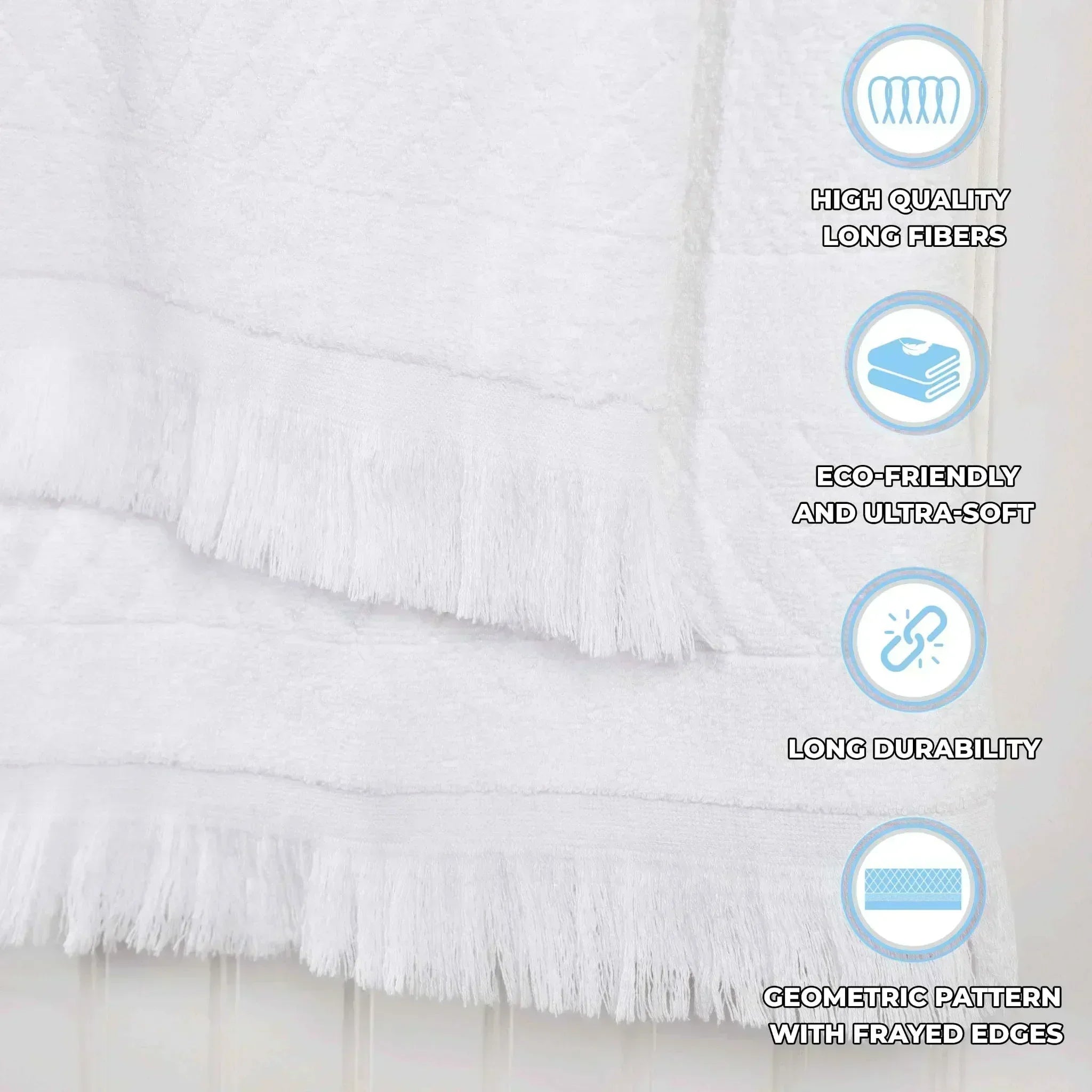 Effortlessly incorporate an aura of elegance into your bathroom routine with the captivating Superior Rolla Cotton Geometric Jacquard Plush Soft Absorbent 8 Piece Towel Set. These Cotton towels are crafted for a soft, absorbent, and luxurious experience. Boasting a geometric pattern with frayed edges, bring unique style to your guest or master bathroom with this bundle. Each towel is finished with a durable single-ply to withstand countless washes and last you years to come. Featuring a hanging loop on each piece, enjoy both convenience and comfort with this versatile set.