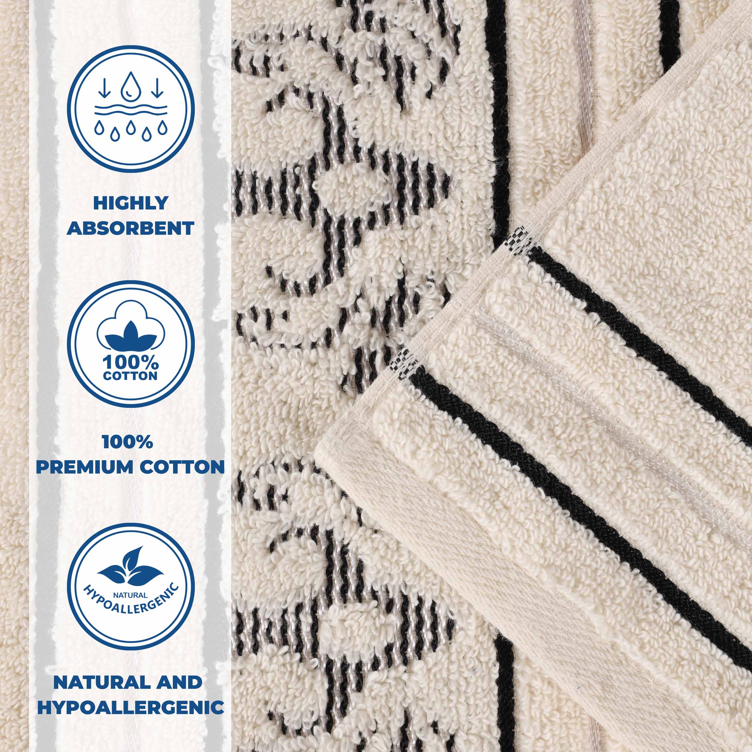 Add a luxurious touch to your bathroom decor with our Sadie Zero Twist Cotton Floral Solid and Jacquard Hand Towel Set. These 100% Cotton towels are crafted with a zero twist technique for a softer, more absorbent, and more luxurious towel those of regularly twisted towels. Featuring an assortment of solid and jacquard towels that boast an elegant floral motif, bring unique style to your guest or master bathroom with this bundle. Each towel is finished with secure hemmed edges to avoid fraying and a durable single-ply to withstand countless washes and last you years to come. Finished with a hanging loop on each piece, enjoy both convenience and comfort with this versatile set.