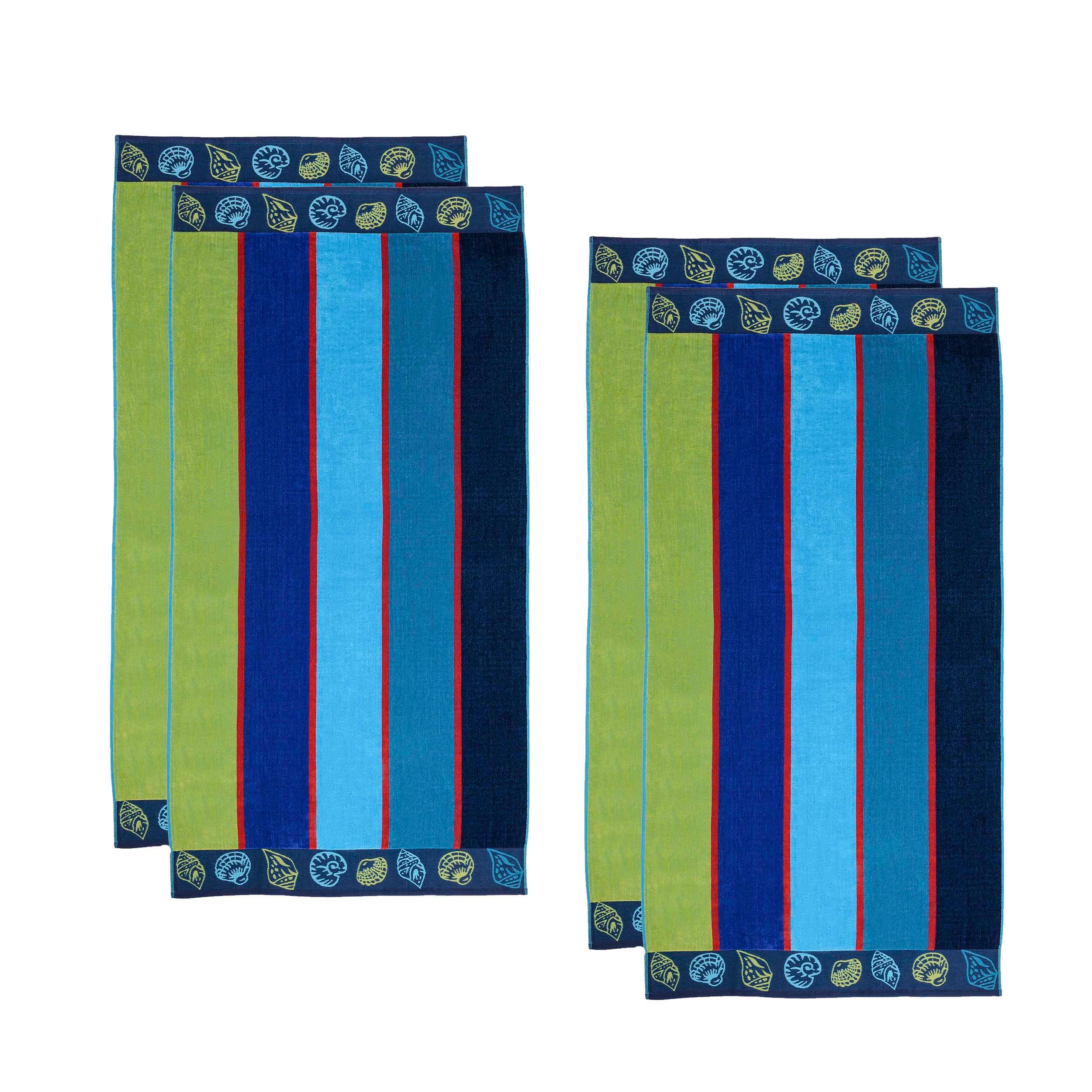 Enjoy the perfect accessory at the beach or lounging poolside with the Sea Shells Oversized Beach Towel. This lovely towel features soft velour on one side that repels water and sand, and ,on the reverse, an absorbent Cotton terry construction to keep you cozy and warm. Crafted from Cotton, this oversized design displays stripes in varying shades of blue and green that are surrounded by dainty shells. Perfect for adults and kids alike, this beautiful towel is a summer essential.