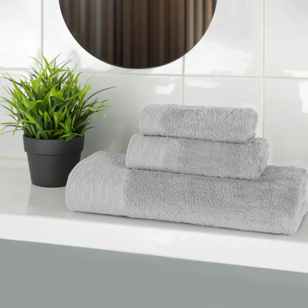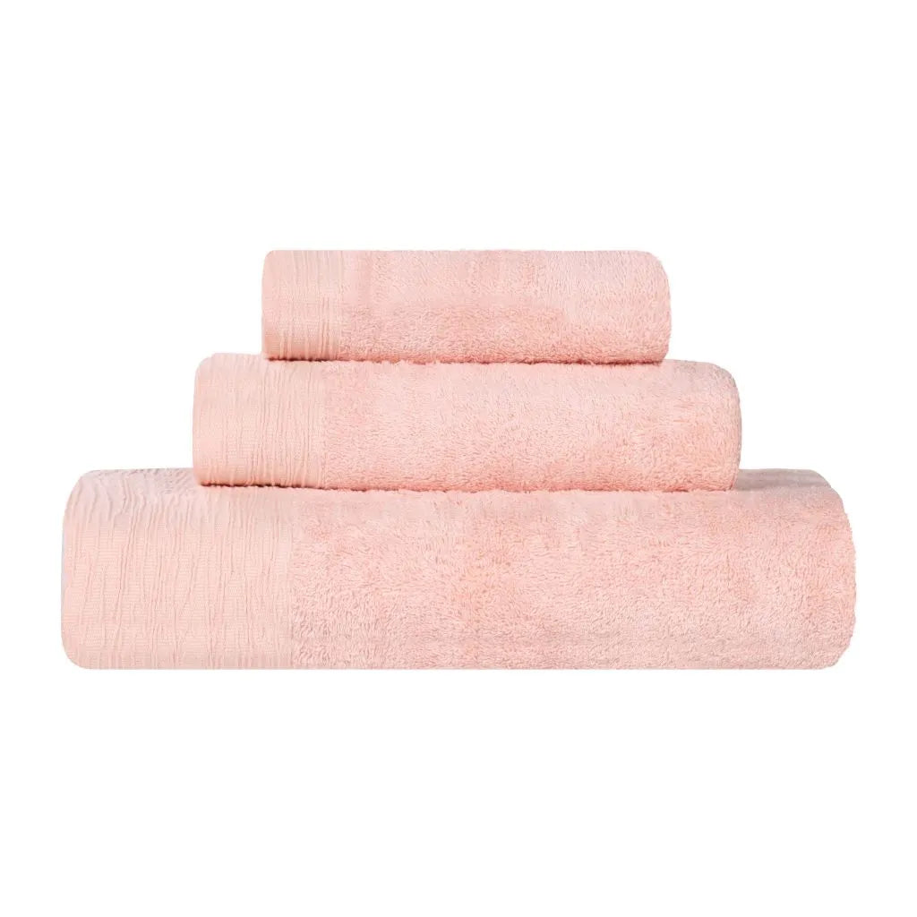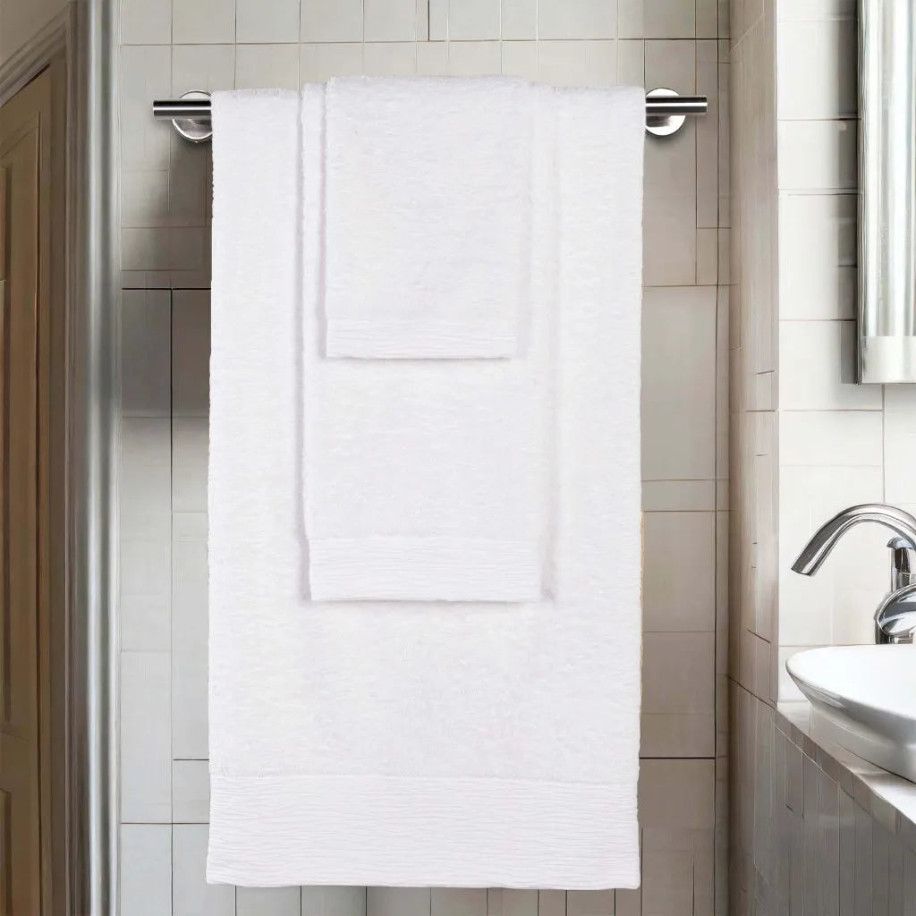 Effortlessly introduce new levels of luxury to your guest or master bathroom with the Superior Rayon from Bamboo Eco-Friendly Fluffy Soft Modern Solid 3-Piece Towel Set. This 40% Rayon from Bamboo 60% Cotton towel set is crafted for a soft, absorbent, and luxurious experience. Boasting a classic solid design and wave textured border, bring a unique style to your guest or master bathroom with this bundle. Each towel is finished with secure hemmed edges to avoid fraying and a durable single-ply to withstand countless washes and last you years to come. Featuring a hanging loop on each piece, enjoy both convenience and comfort with this versatile set.
