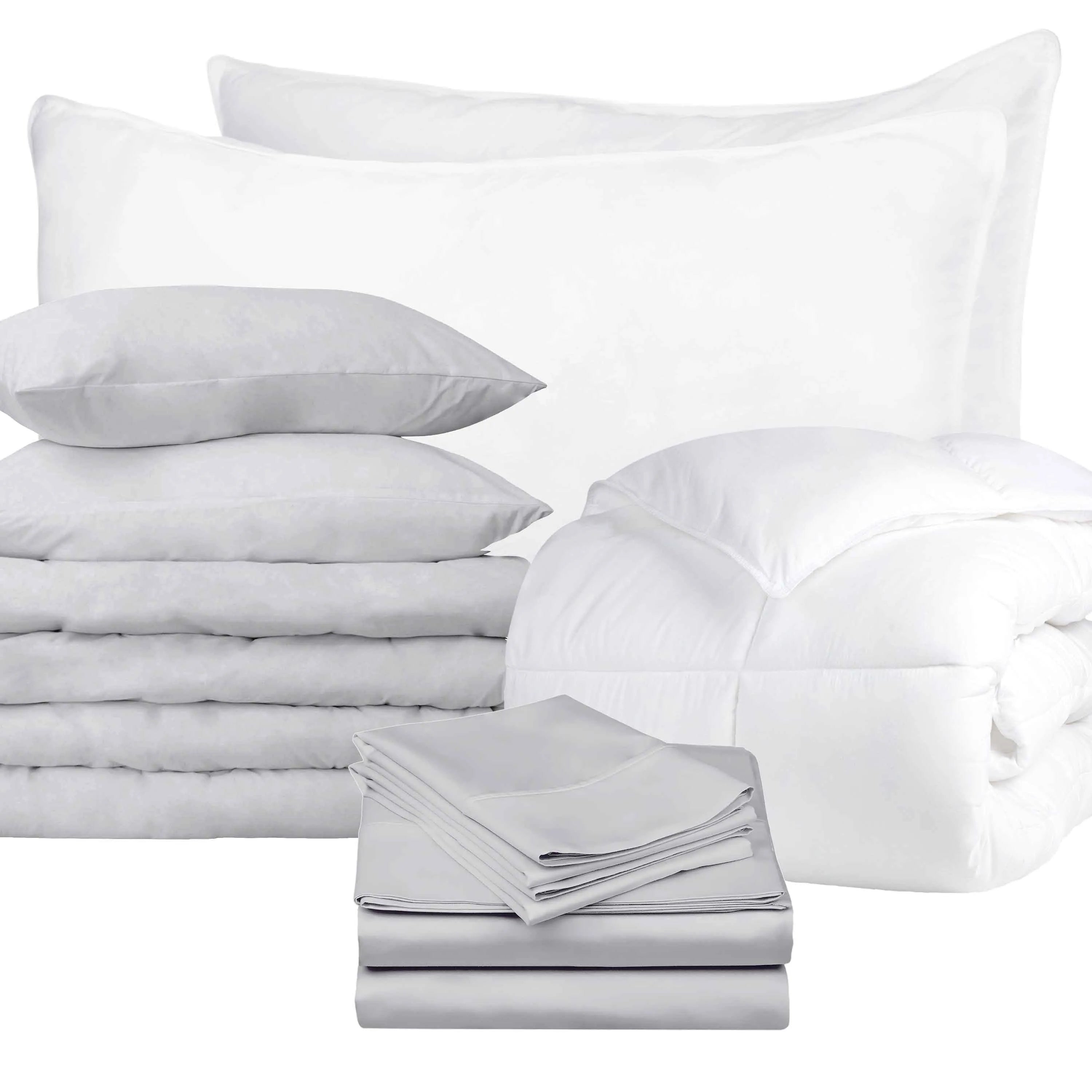 Embrace the refreshing feel of classic percale with The Crisp Comfort Move-In Bundle, a thoughtfully curated 10-piece bedding collection designed for cool, breathable comfort. This set, available in king and queen sizes with elegant ivory, platinum silver, tan, and white hues, features crisp 100% Cotton Percale sheets and a matching duvet cover and shams, paired with a plush down alternative comforter and supportive gusset pillows. Enjoy a complimentary travel laundry essential to keep your new bedding fresh from the start.