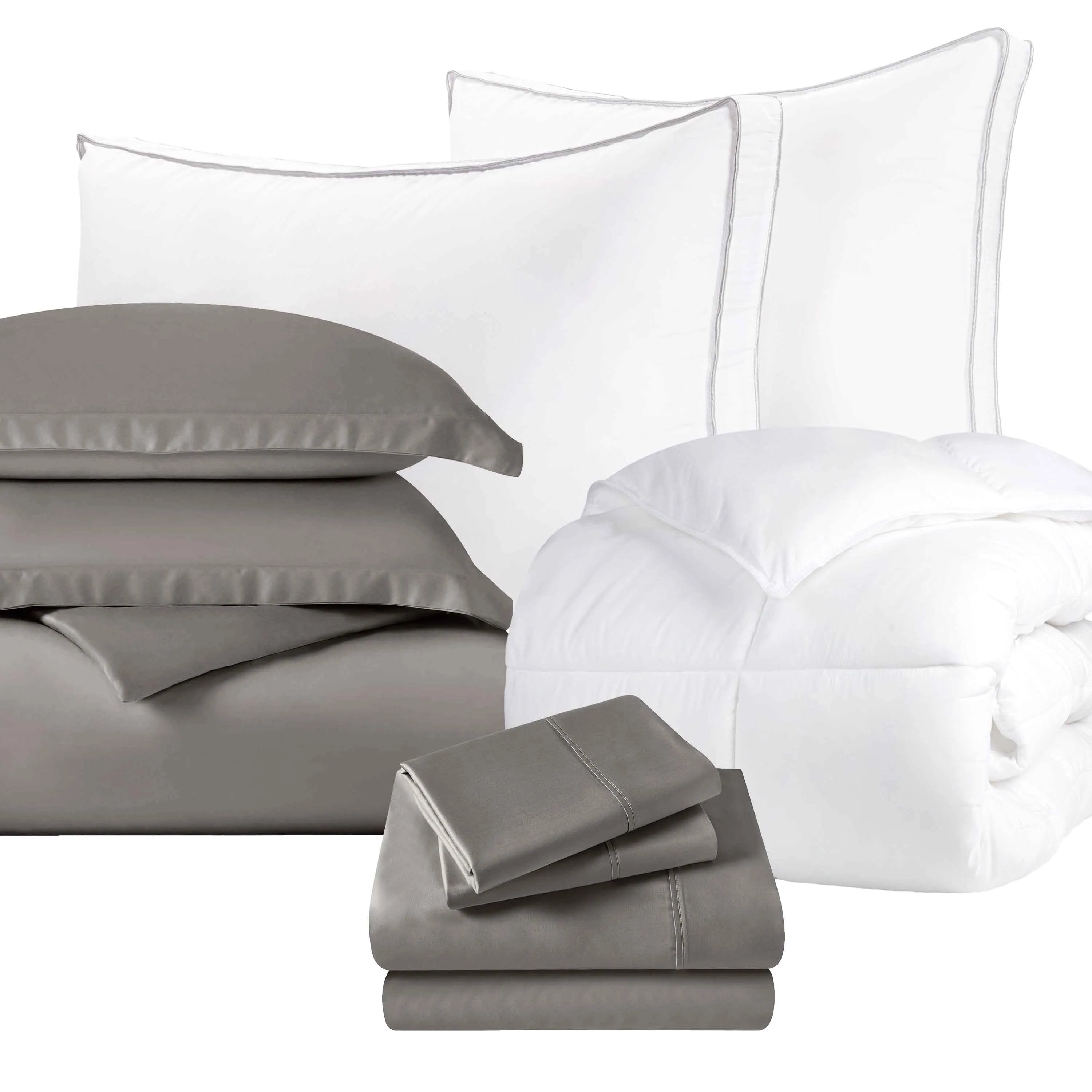 Elevate your new home with The Refined Comfort Move-In Bundle, a thoughtfully assembled 10-piece bedding collection designed for serene comfort and sophisticated style. This set, available in king and queen sizes with elegant hues of grey, ivory, tan, and white, features sumptuous 400 thread count Egyptian Cotton sheets, a matching duvet cover and shams, a plush down alternative comforter, and supportive gusset pillows. Enjoy a complimentary travel laundry essential to keep your sanctuary fresh from the start.