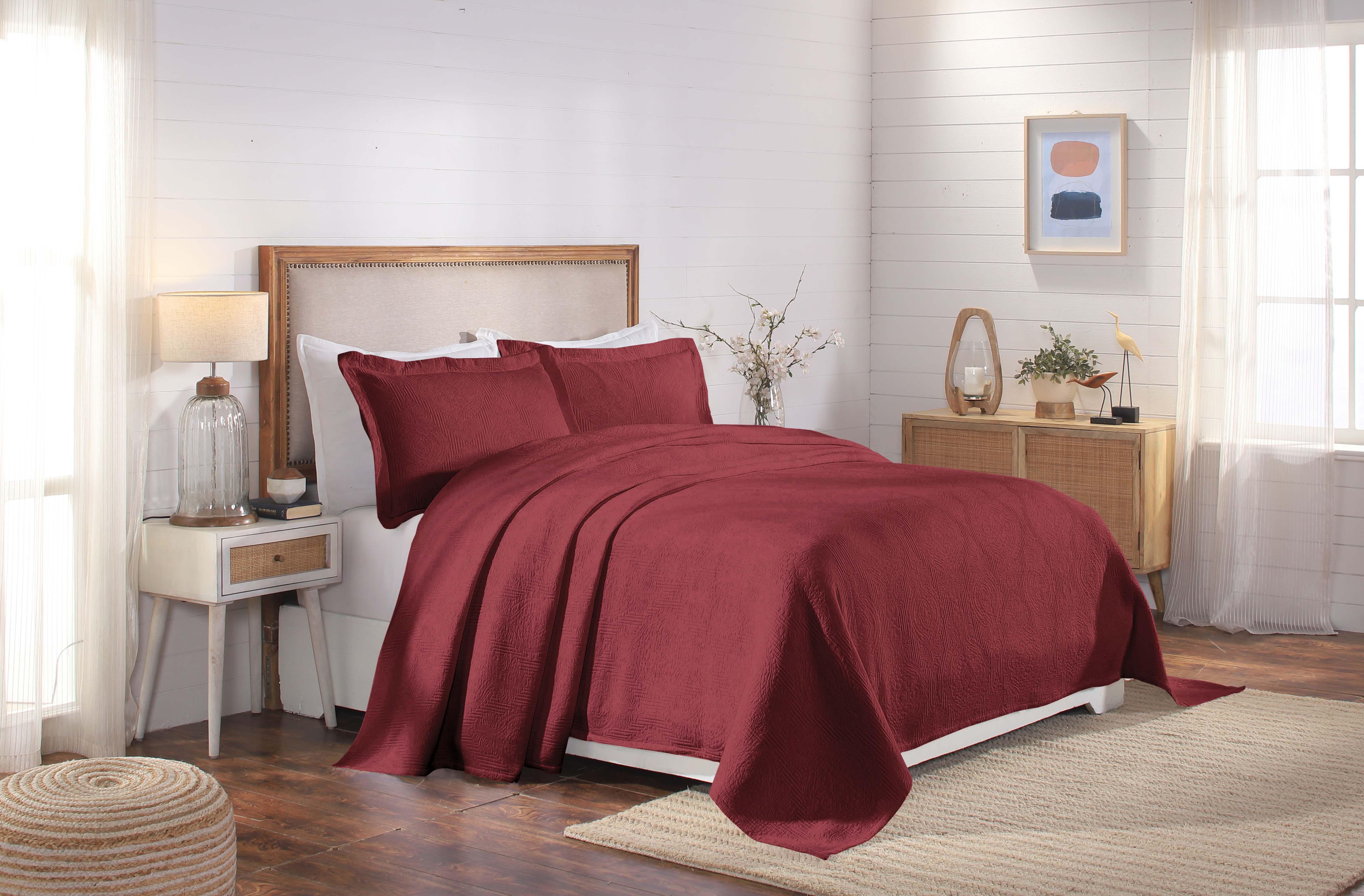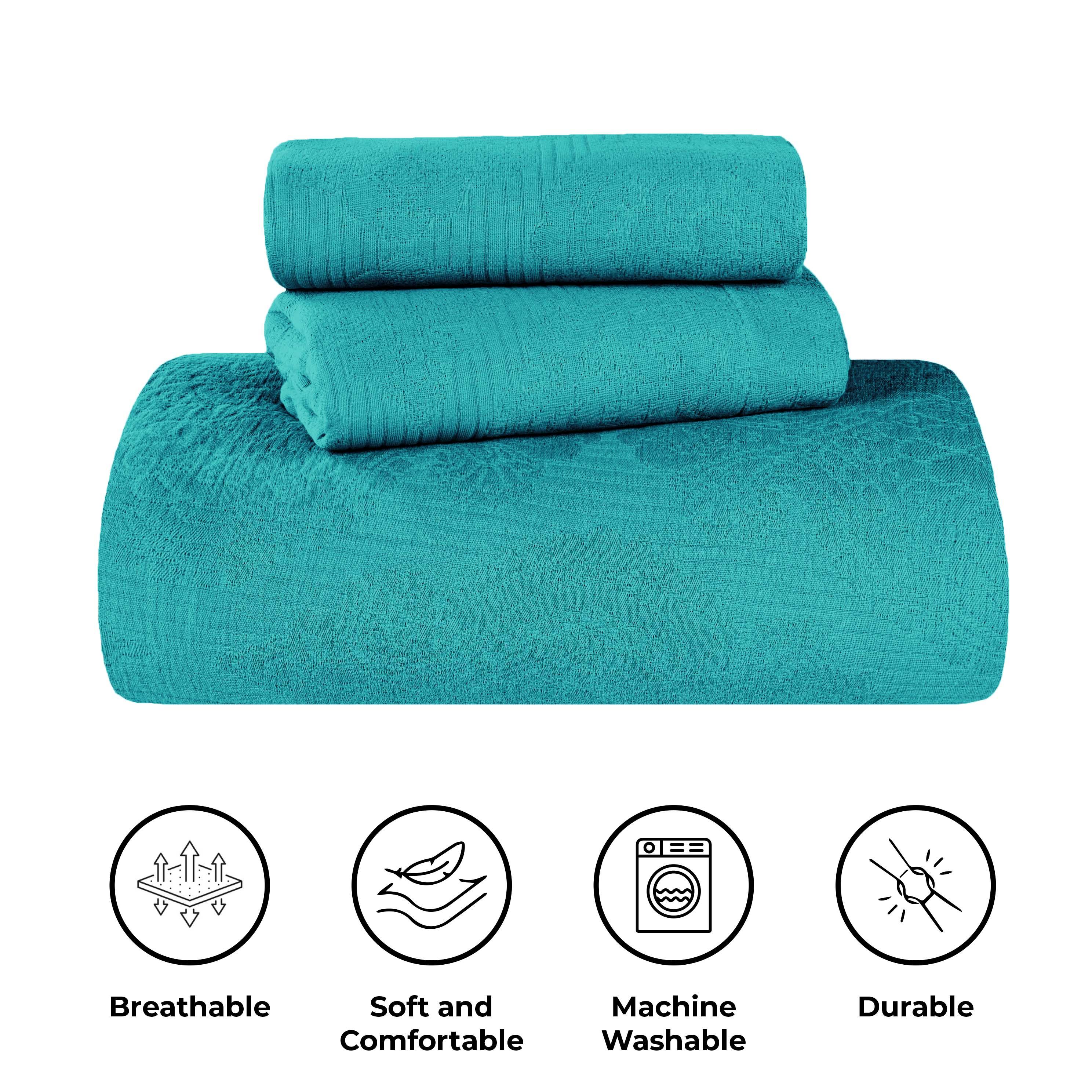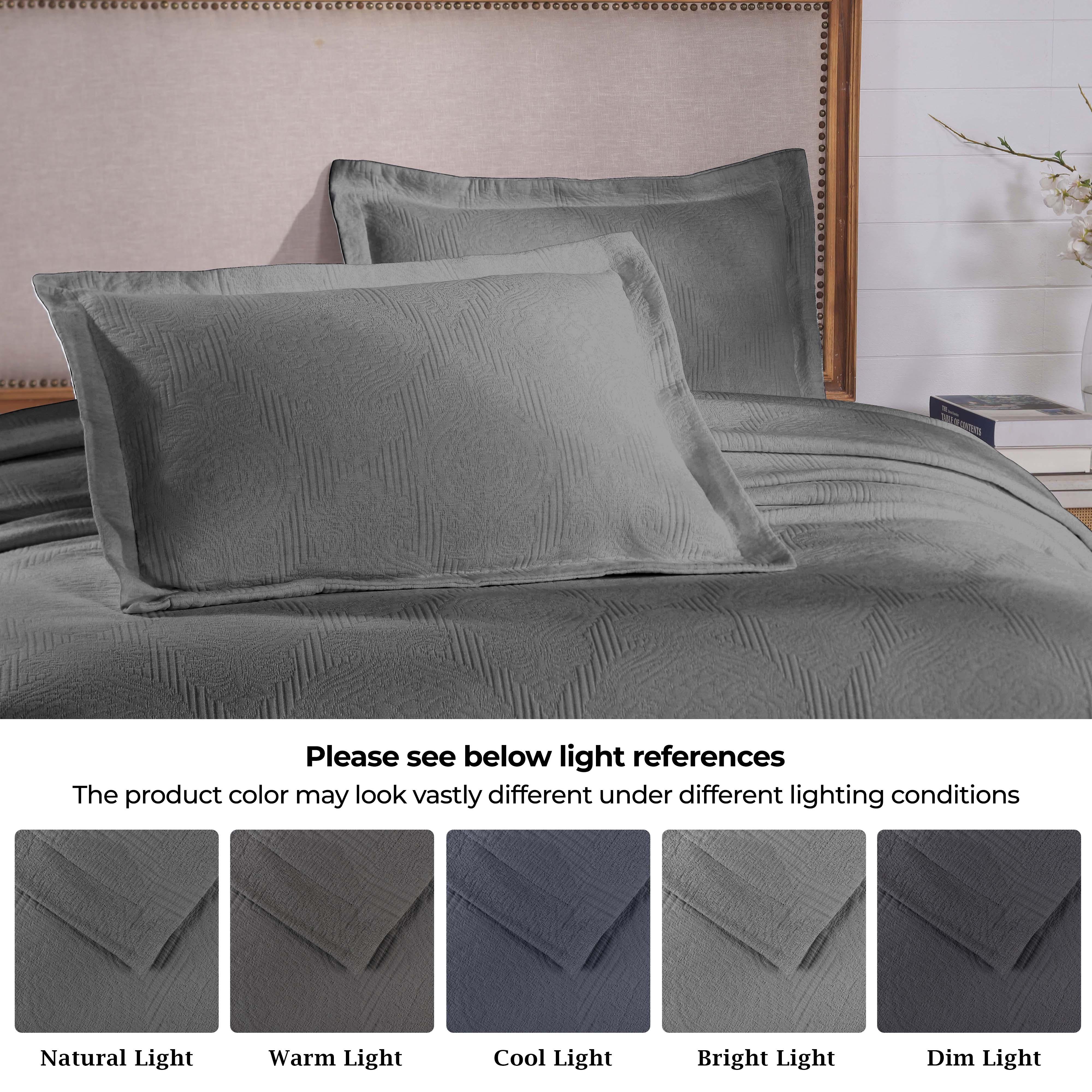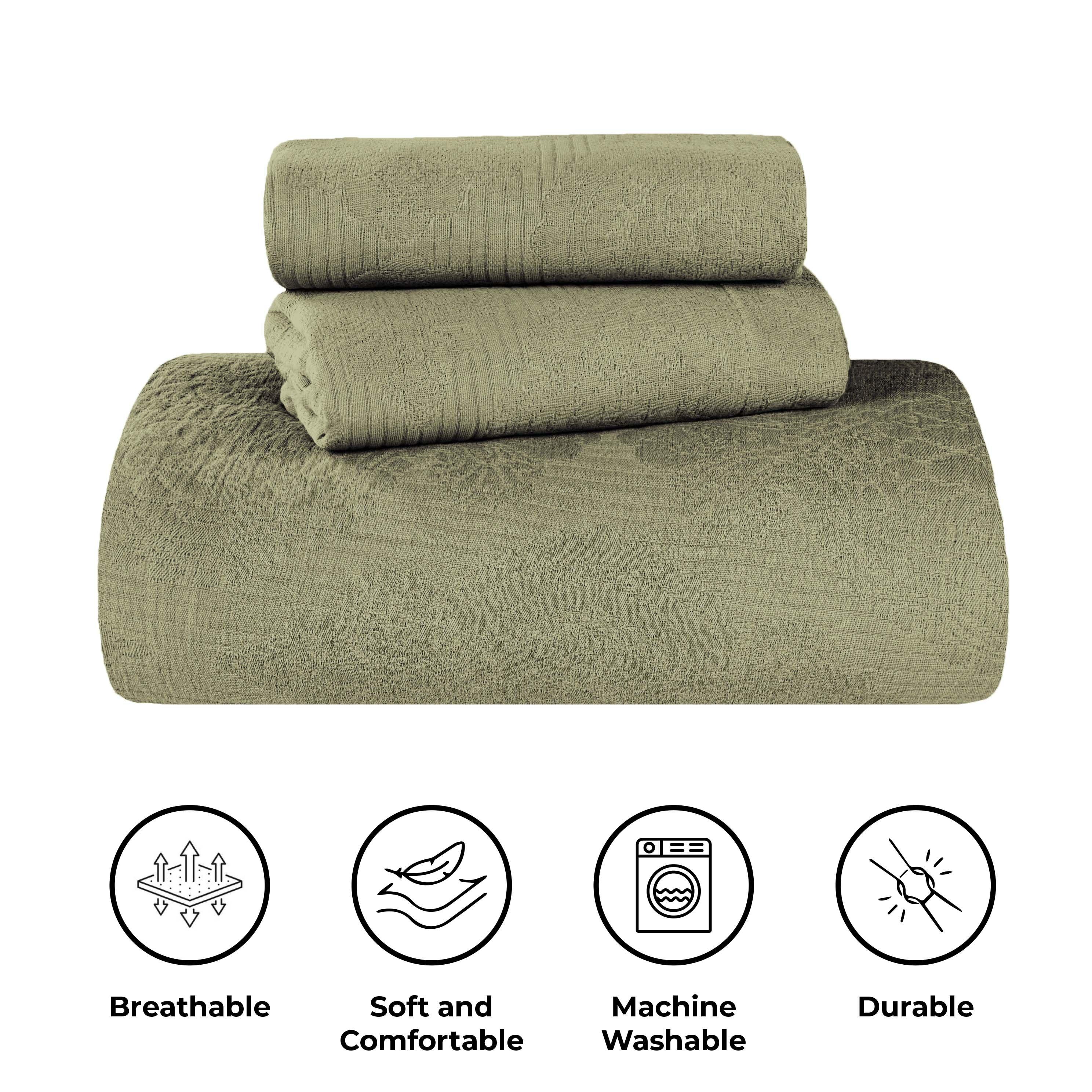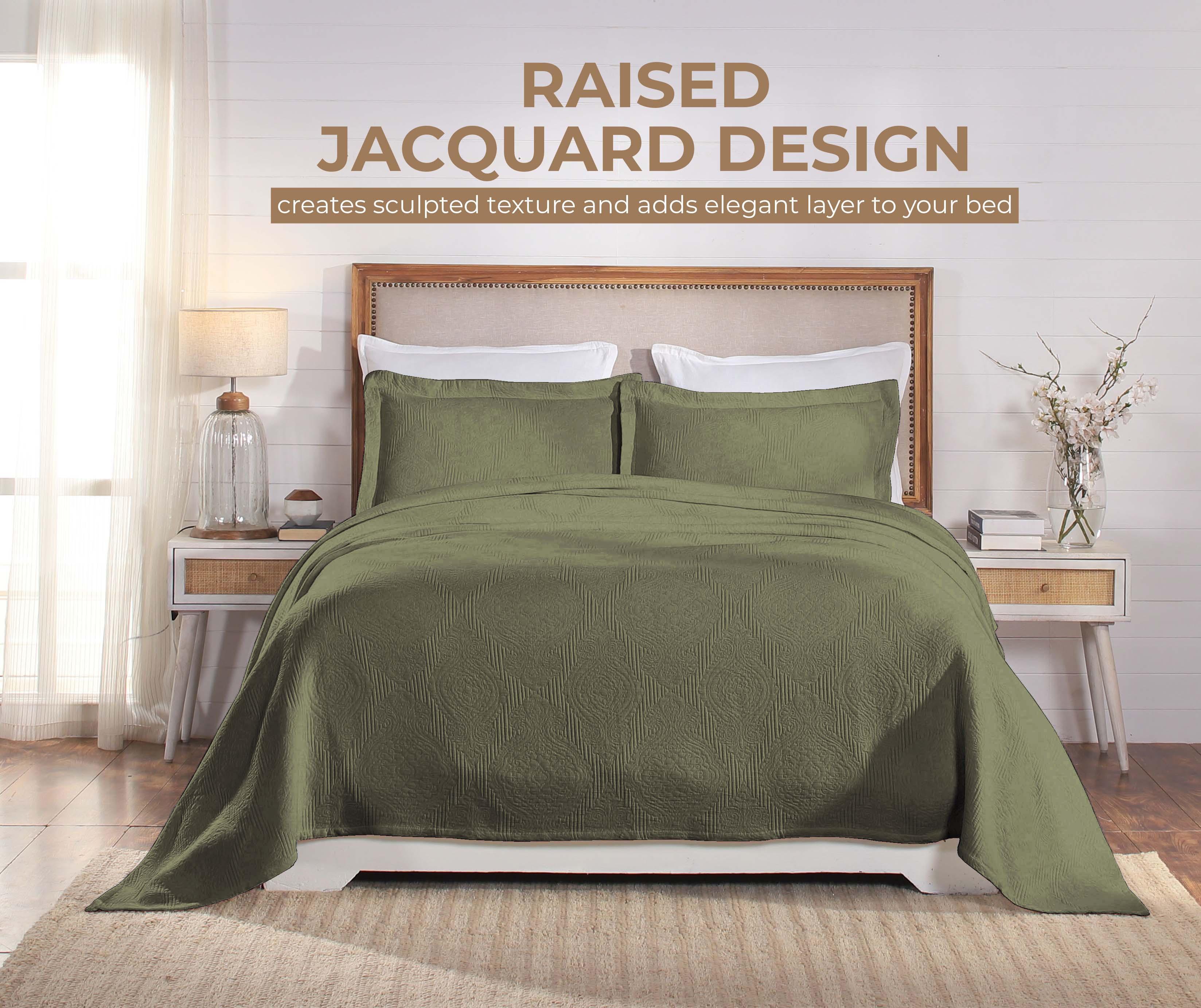 Experience the perfect blend of comfort and style with the premium Superior Victory Cotton Matelasse Bedspread and Pillow Sham Set. Crafted from 100% cotton, this light and breathable set is ideal for adding an extra layer of texture or for use on its own. The jacquard weave features an intricate scrolling medallion pattern that creates a stunning focal point in your bedroom. This gorgeous bundle includes 1 oversized bedspread that drapes elegantly to the floor, eliminating the need for a bed skirt, and 2 matching pillow shams (Twin size includes 1 pillow sham). Available in your choice of solid colors and sizes, updating the look of your modern or transitional space has never been easier.
