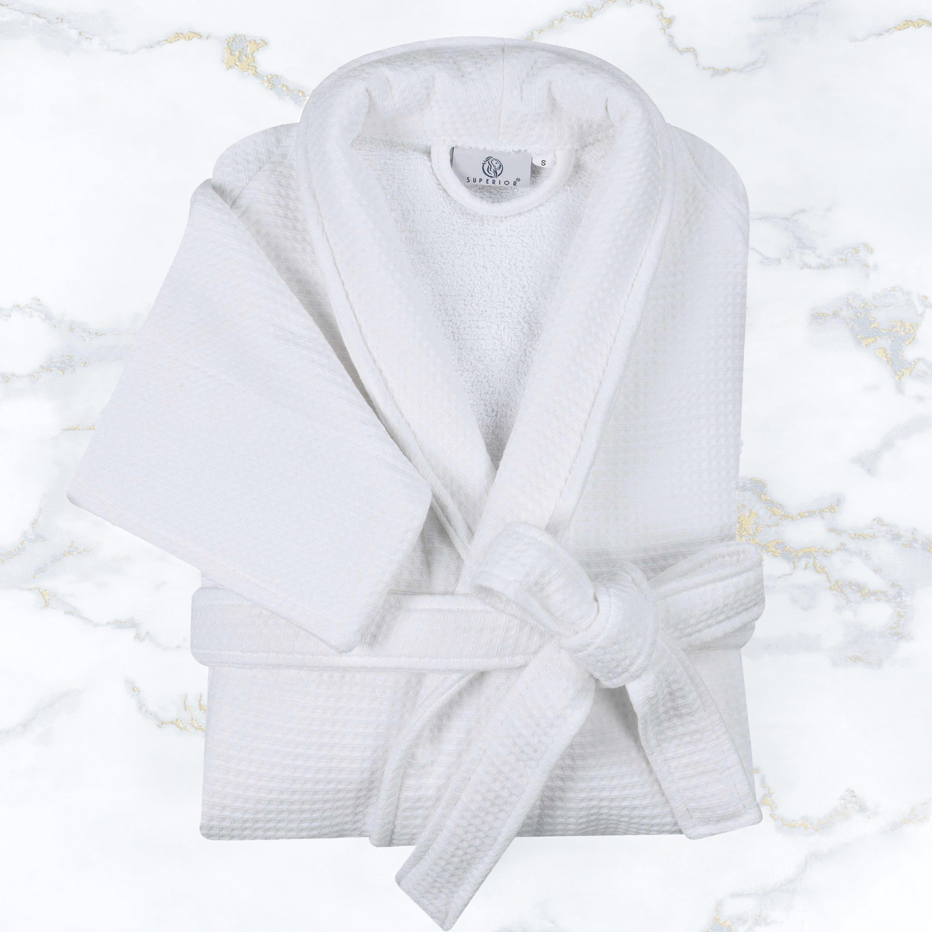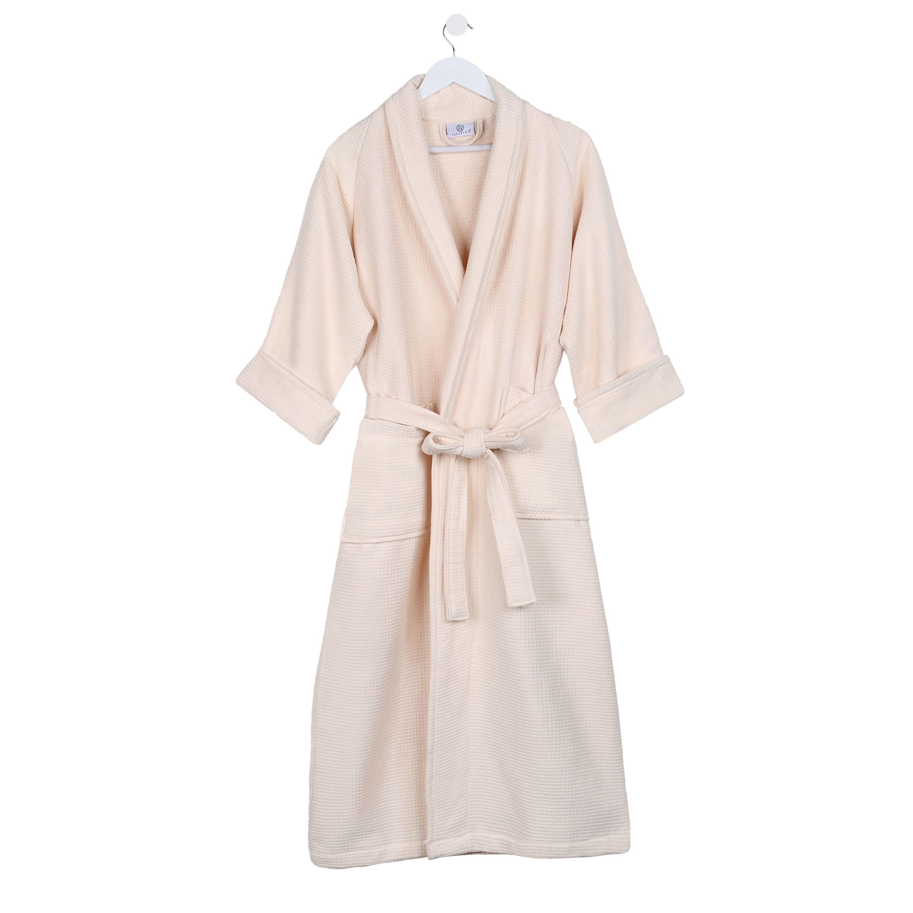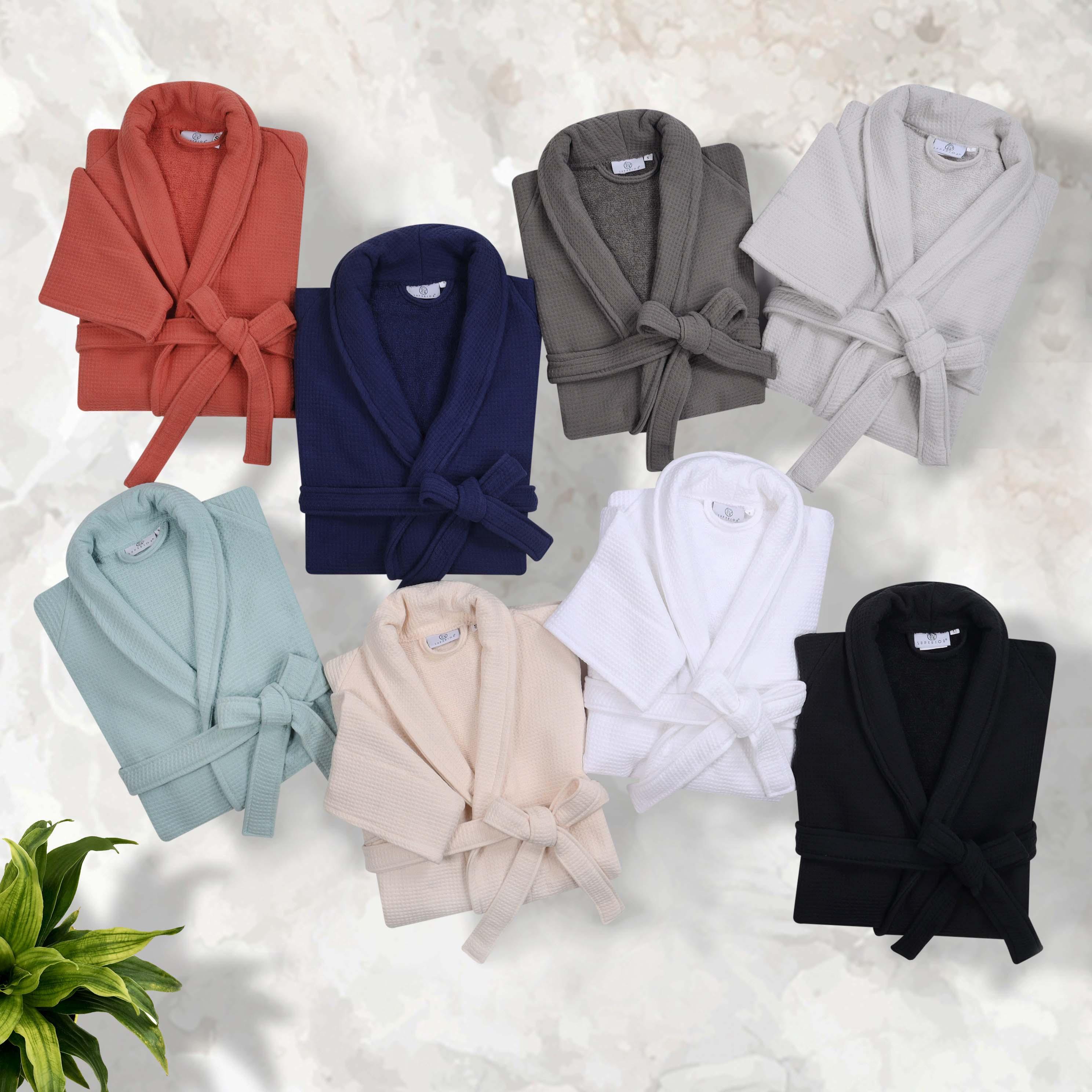 Lounge in plush comfort snuggled with our Waffle Weave Bath Robe. Crafted from ultra-soft Cotton, this gorgeous robe provides maximum comfort after stepping out of the shower or bath. This unisex adult robe is designed with a soft shawl collar, matching belt, two front patch pockets and fold-back cuffs. this unisex adult robe features a timeless honeycomb texture and solid color design. The classic waffle weave robe is highly-absorbent and has an irresistible feel. Available in a honeycomb texture in a variety of solid color options and sizes, pamper yourself every day with this plush bathrobe. This robe is also OEKO-TEX certified, meaning it does not contain any harmful substances or chemicals, ensuring quality, comfort and wellness.